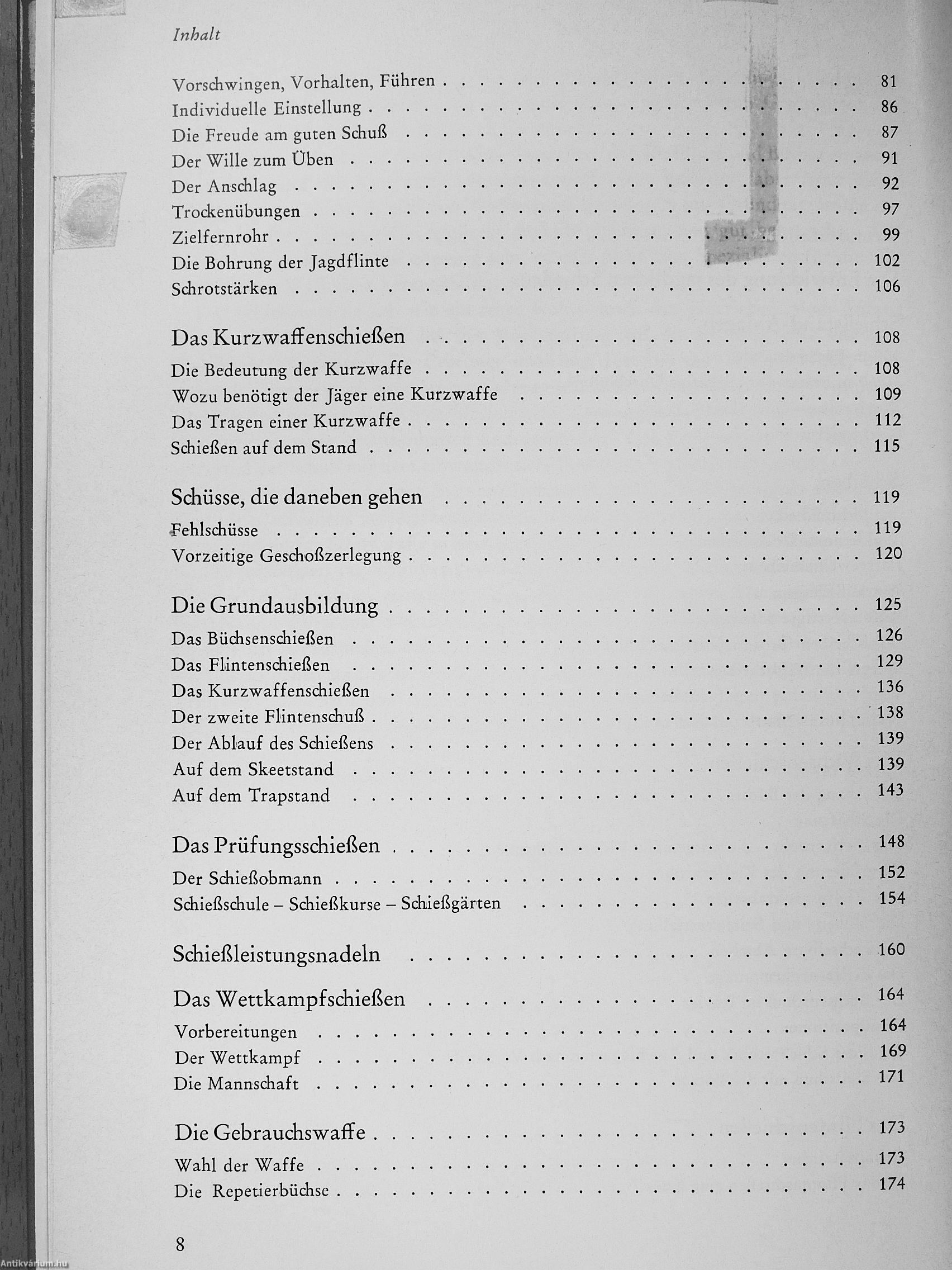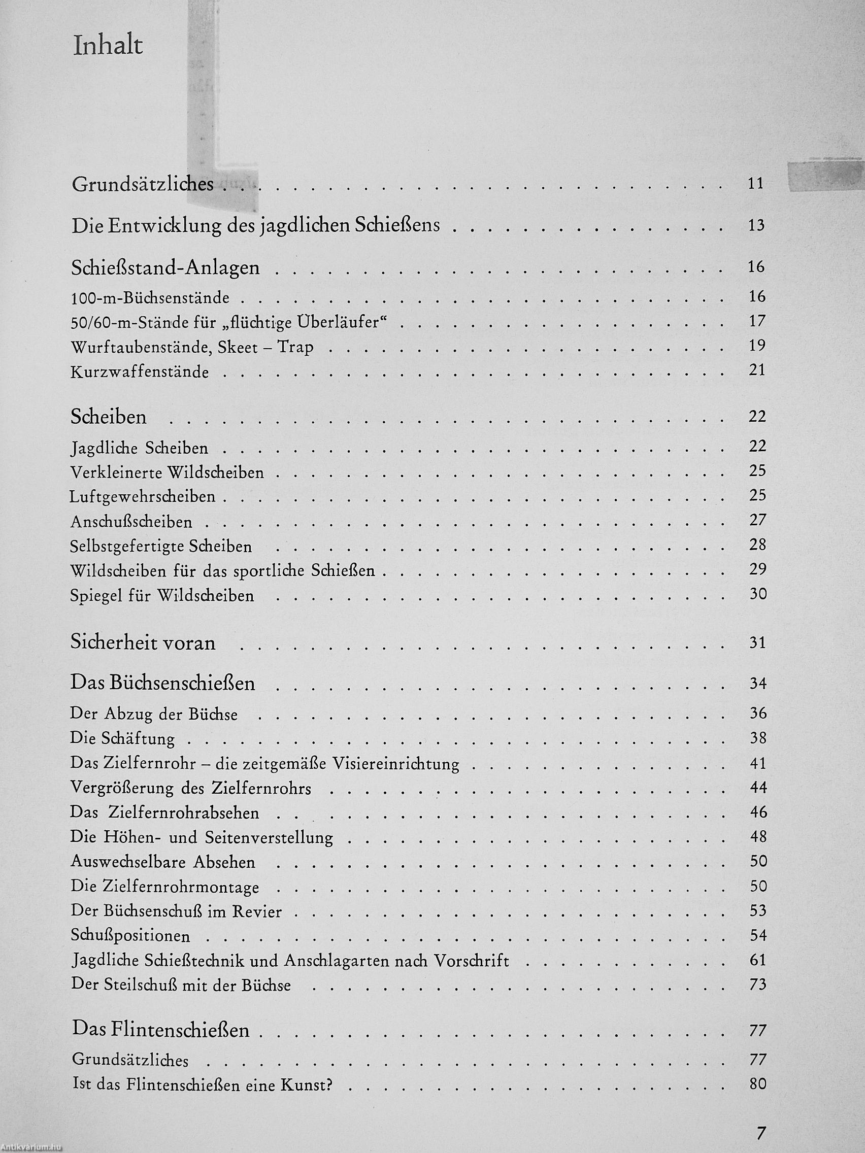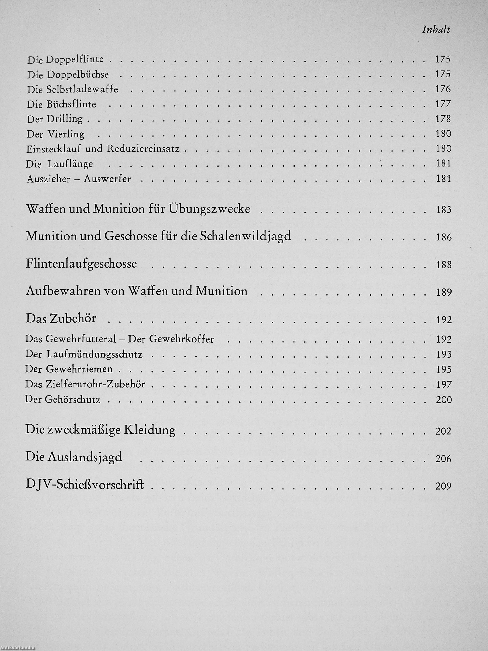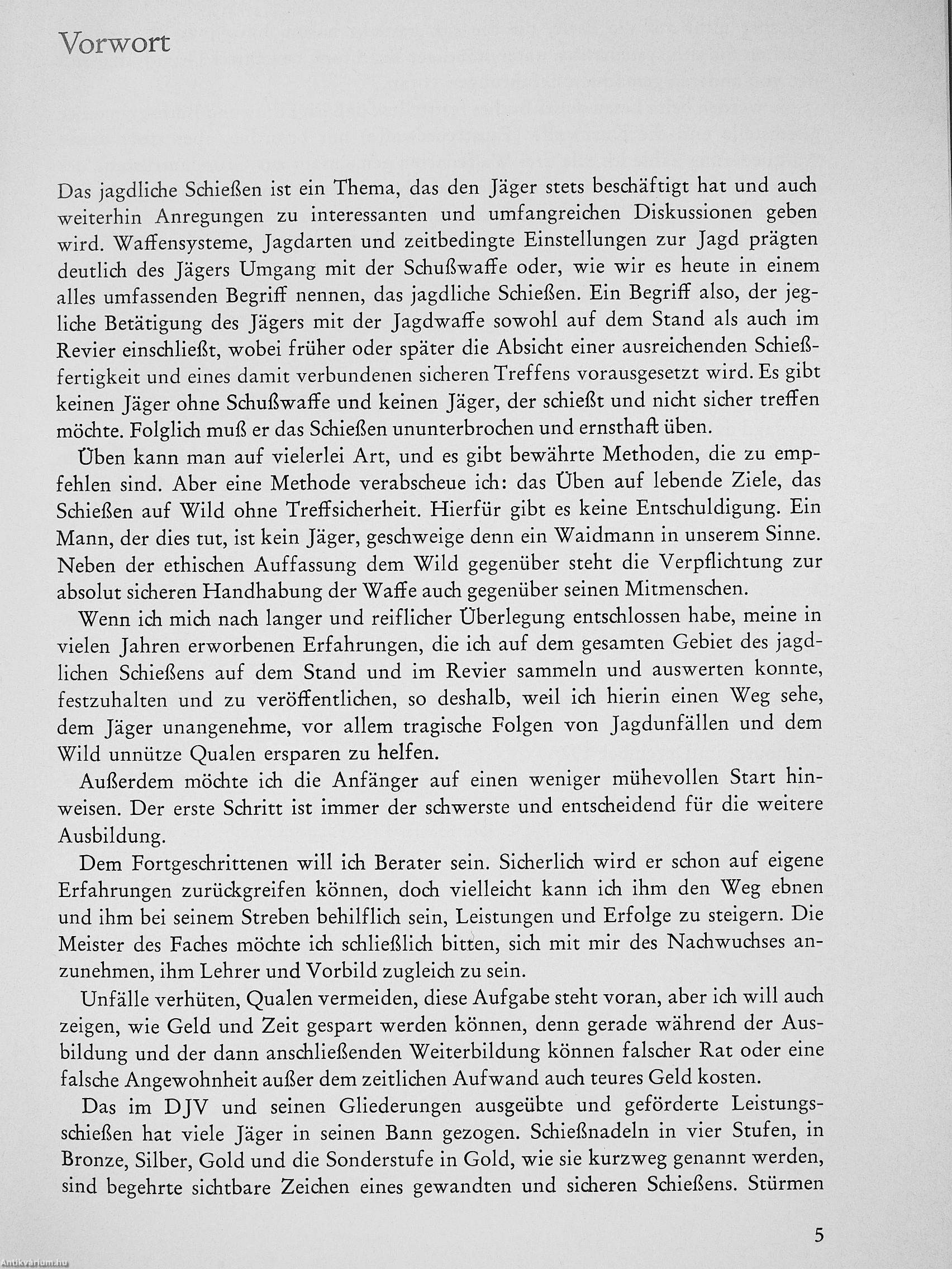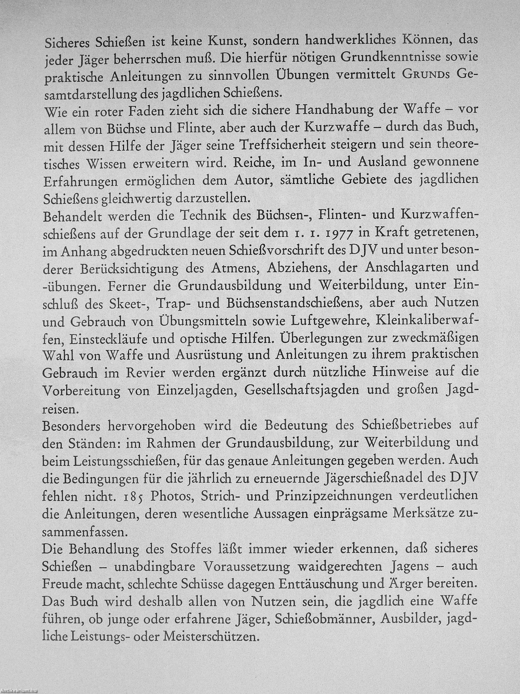 Besonders hervorgehoben wird die Bedeutung des Schießbetriebes auf den Ständen: im Rahmen der Grundausbildung, zur Weiterbildung und beim Leistungsschießen, für das genaue Anleitungen gegeben werden. Auch die Bedingungen für die jährlich zu erneuernde Jägerschießnadel des DJV fehlen nicht. 185 Photos, Strich- und Prinzipzeichnungen verdeutlichen die Anleitungen, deren wesentliche Aussagen einprägsame Merksätze zusammenfassen.