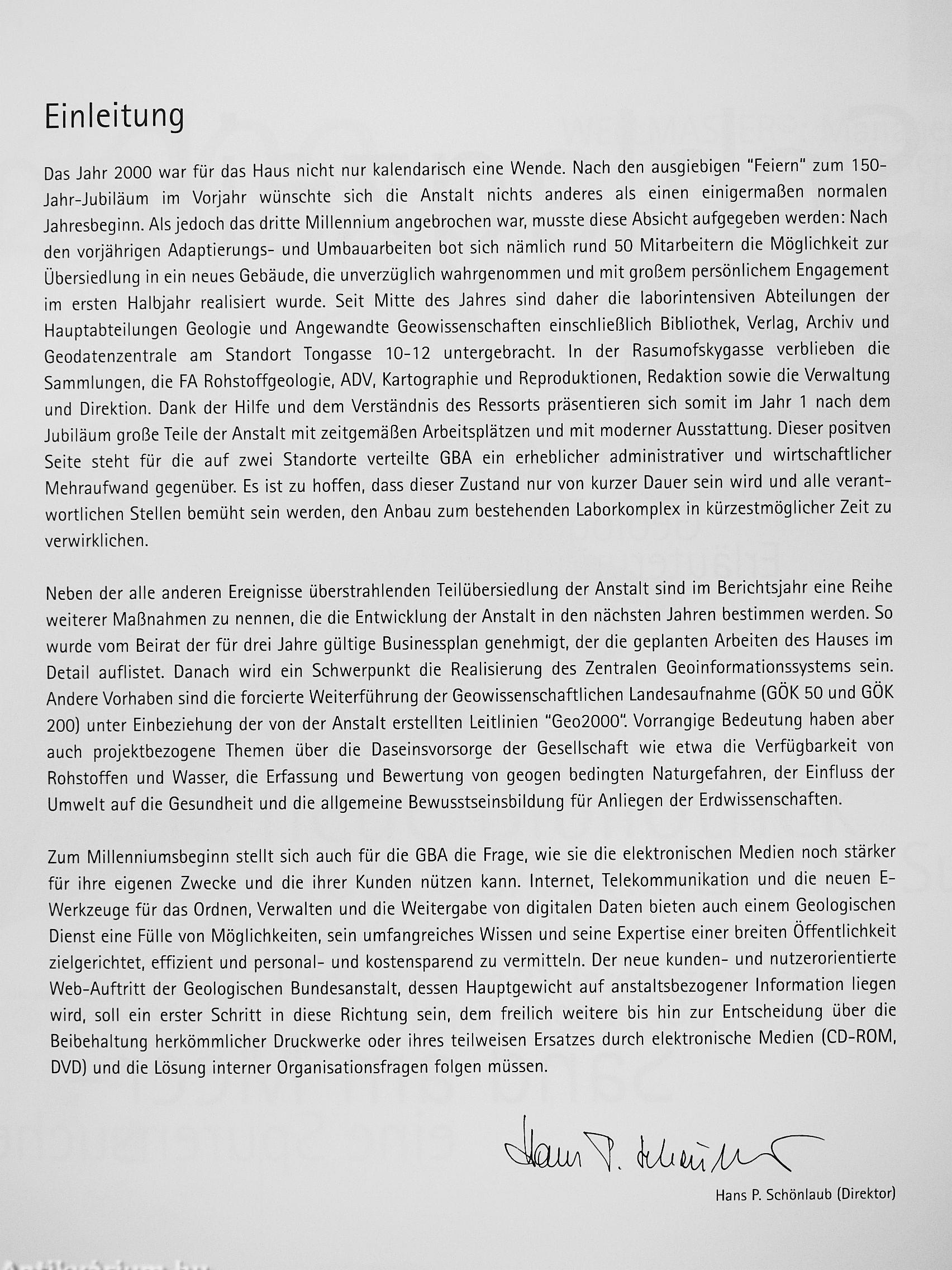 Glaubt man den Kassandras unter den Auguren, lassen die kommenden Jahre und Jahrzehnte für einzelne Regionen auf der Erde Schlimmes befürchten. Auch unsere Breiten werden - als Folge der globalen Erwärmung der Erde - davon betroffen sein. Die Prognosen für den alpinen Raum reichen vom Abschmelzen der Gletscher, dem Ansteigen der Permafrostgrenze, dem Verschieben der Vegetationsstufen bis hin zur Zunahme von lokalen Starkniederschlägen und damit verbundener verstärkter Bodenerosion und erhöhten Murenabgängen. Die Geologie kommt damit im Sinne von "bad news" ins Gerede. Das beste Gegenmittel gegen Panik und Angstmacherei sind jedoch Fakten. Geologie selbst kann zwar keine mathematisch exakten Größen über ein Gefahrenpotential liefern, doch hält sie einen reichen Fundus an zuverlässigen Unterlagen bereit, mit deren Hilfe eine Beurteilung und Abschätzung von natürlichen und anthropogen verursachten Risiken möglich ist. Dieser Datenschatz, über viele Jahrzehnte gesammelt, stellt ein unschätzbares Vermögen dar, das - sofern richtig eingesetzt - für die Volkswirtschaft hohe Renditen abwerfen kann.
