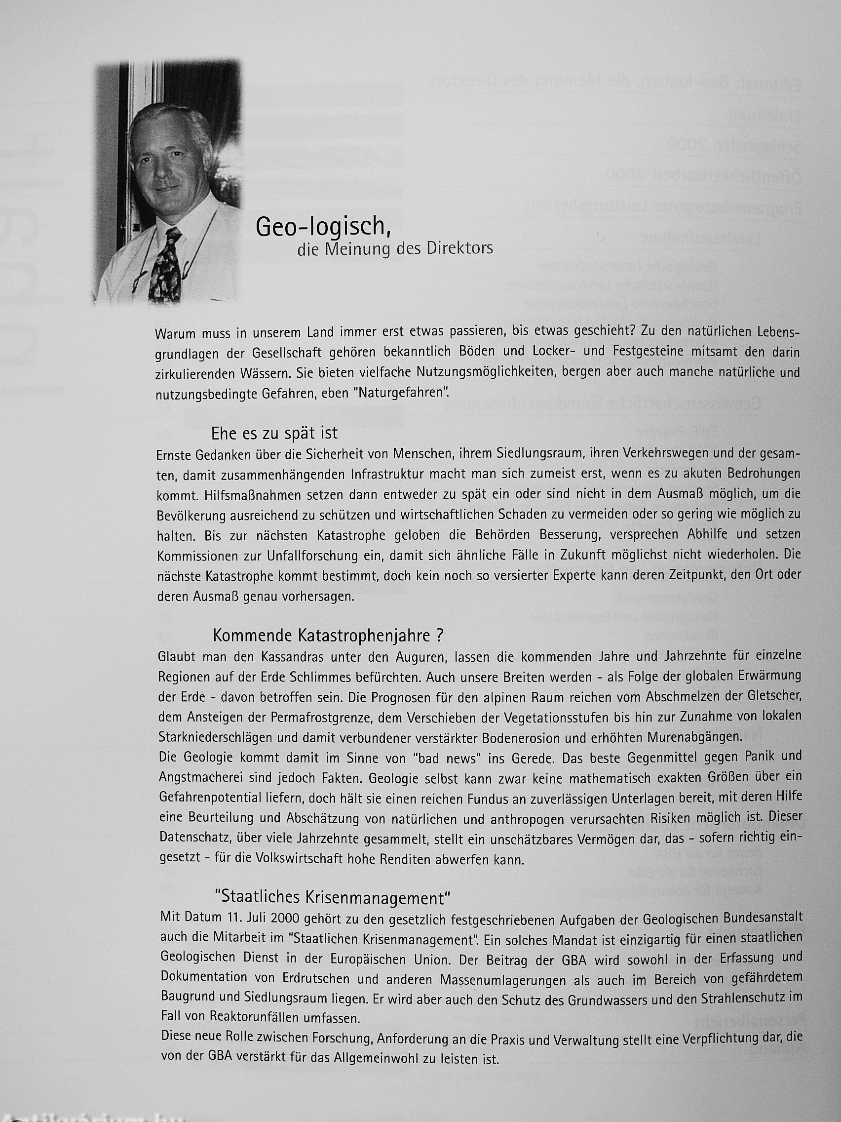 Warum muss in unserem Land irrmer erst etwas passieren, bis etwas geschieht? Zu den natürlichen Lebensgrundlagen der Gesellschaft gehören bekanntlich Böden und Locker- und Festgesteine mitsamt den darin zirkulierenden Wässern. Sie bieten vielfache Nutzungsmöglichkeiten, bergen aber auch manche natürliche und nutzungsbedingte Gefahren, eben "Naturgefahren".