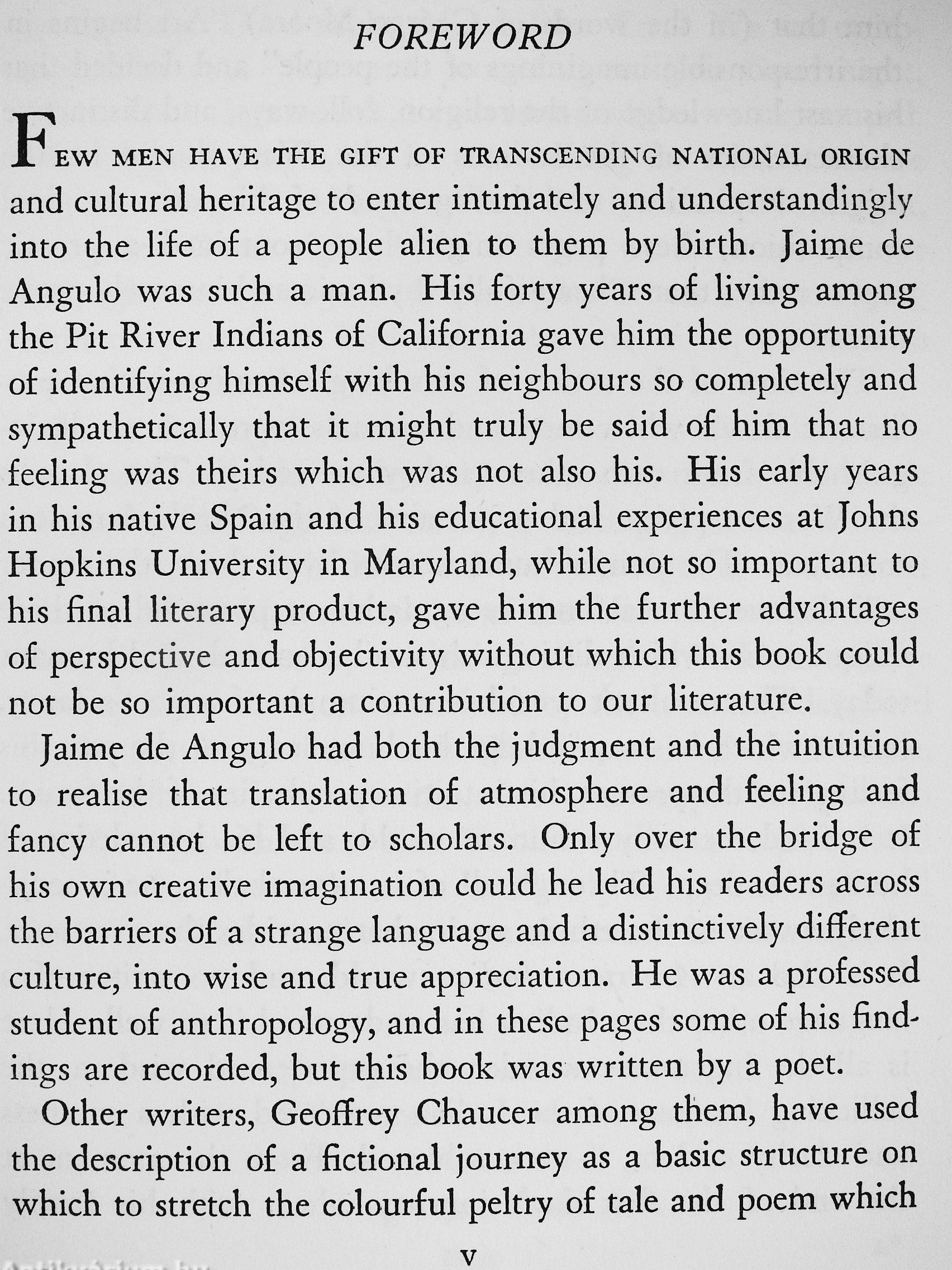 Jaime de Angulo spent forty years among the Pit River Indians of California in capacities varying from anthropologist to unofl&cial medicine man. He penetrated with complete understanding into the life of American Indians and learned from them their legends, folklore and songs, handed down almost unchanged from their forefathers, who roamed the North American continent in those days when there was no clearly defined barrier to show where the animal world ceased and the human began.