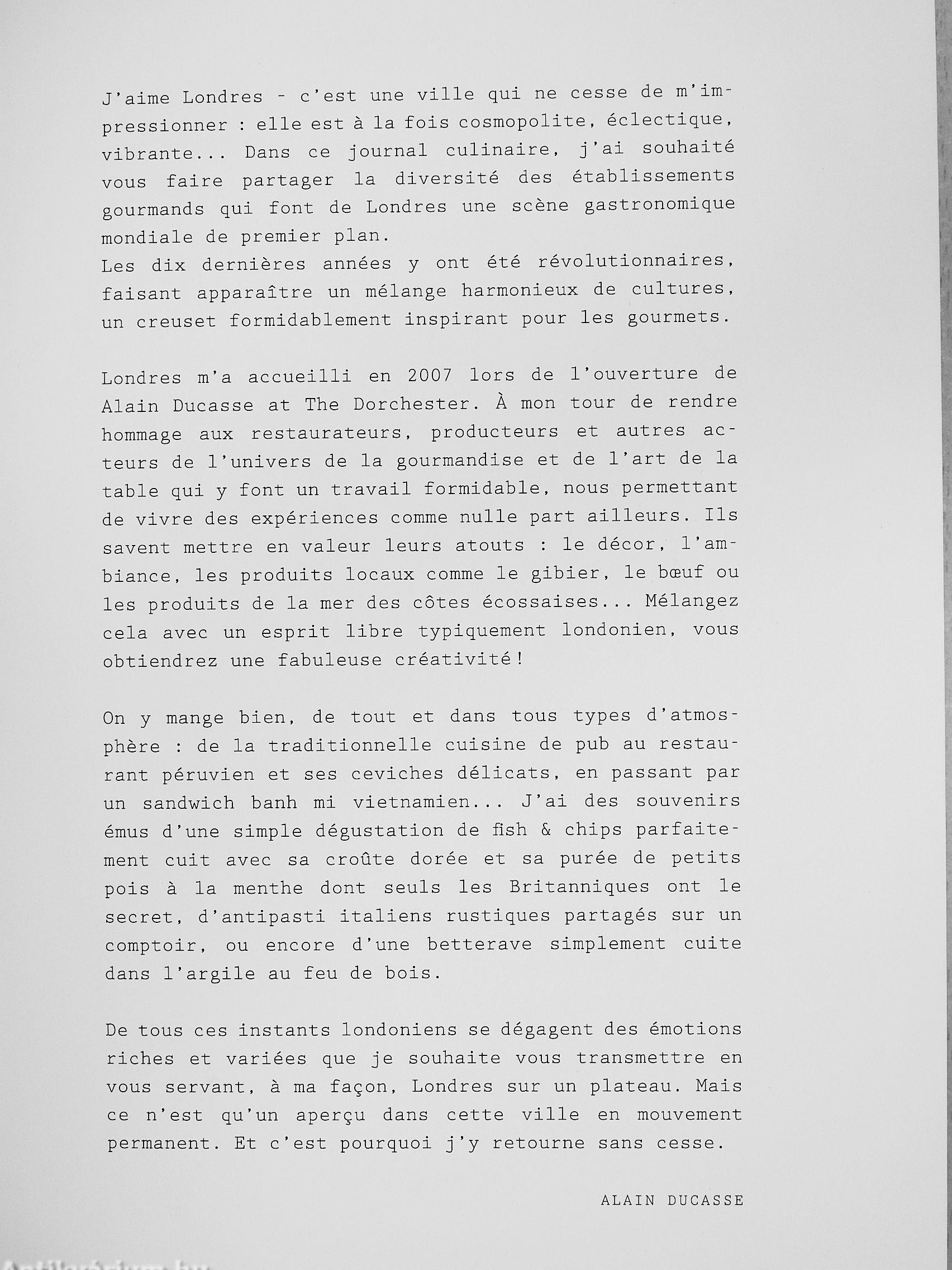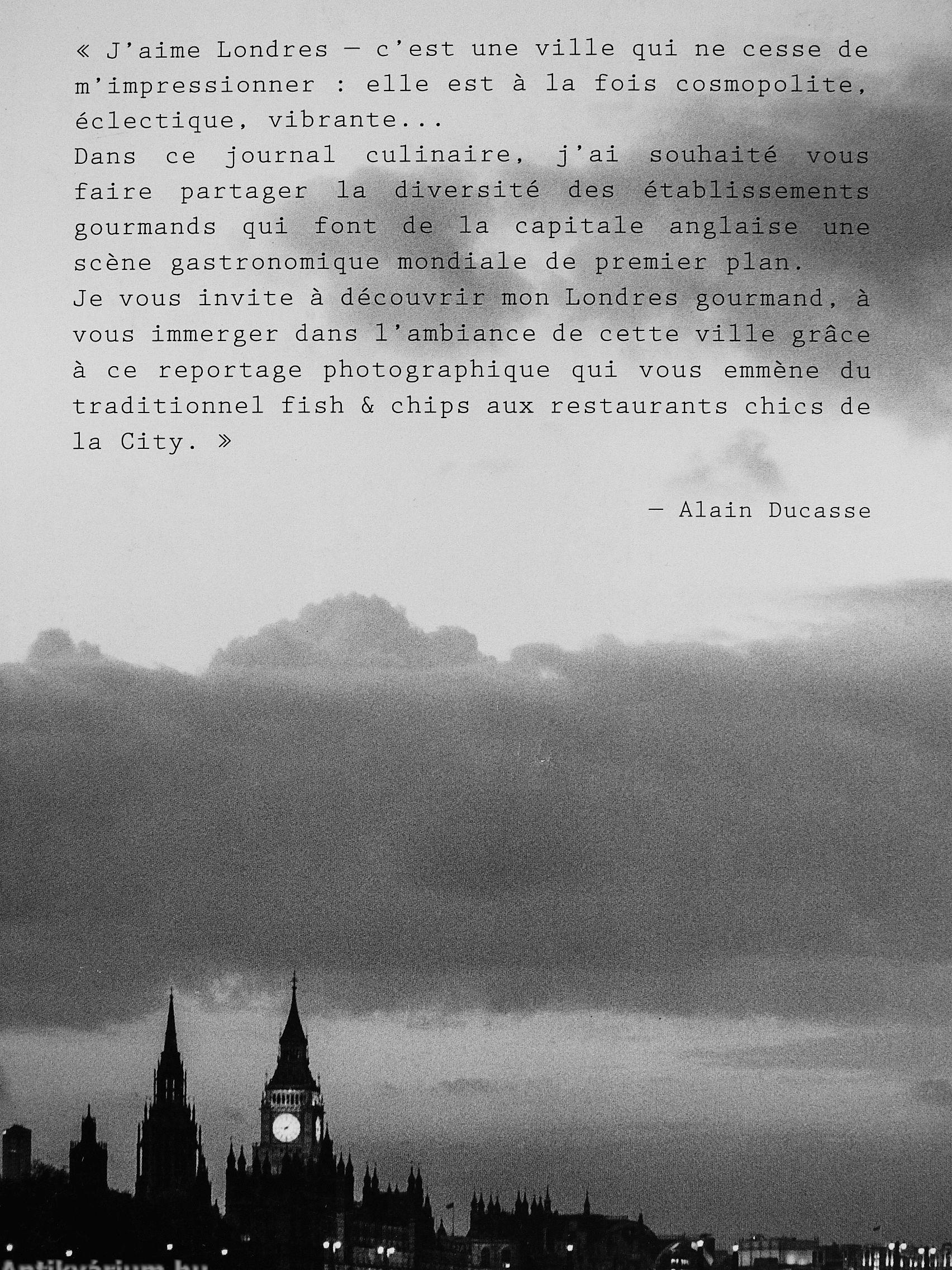 Dans ce journal culinaire, j'ai souhaité vous faire partager la diversité des établissements gourmands qui font de la capitale anglaise une scene gastronomique mondiale de premier plan. Je vous invite a découvrir mon Londres gourmand, a vous immerger dans l'ambiance de cette ville grâce a ce reportage photographique qui vous emmene du traditionnel fish & chips aux restaurants chics de la City. »