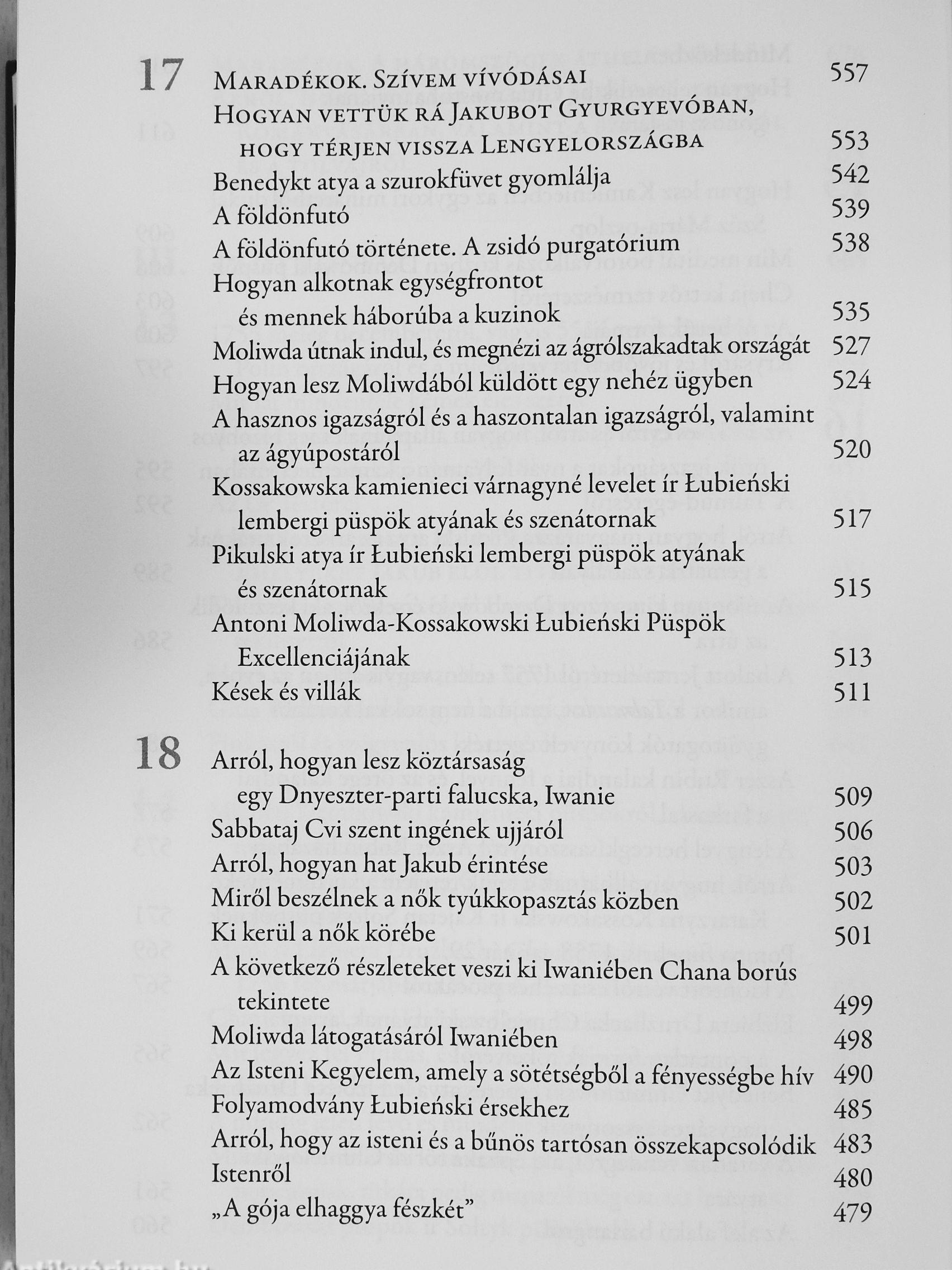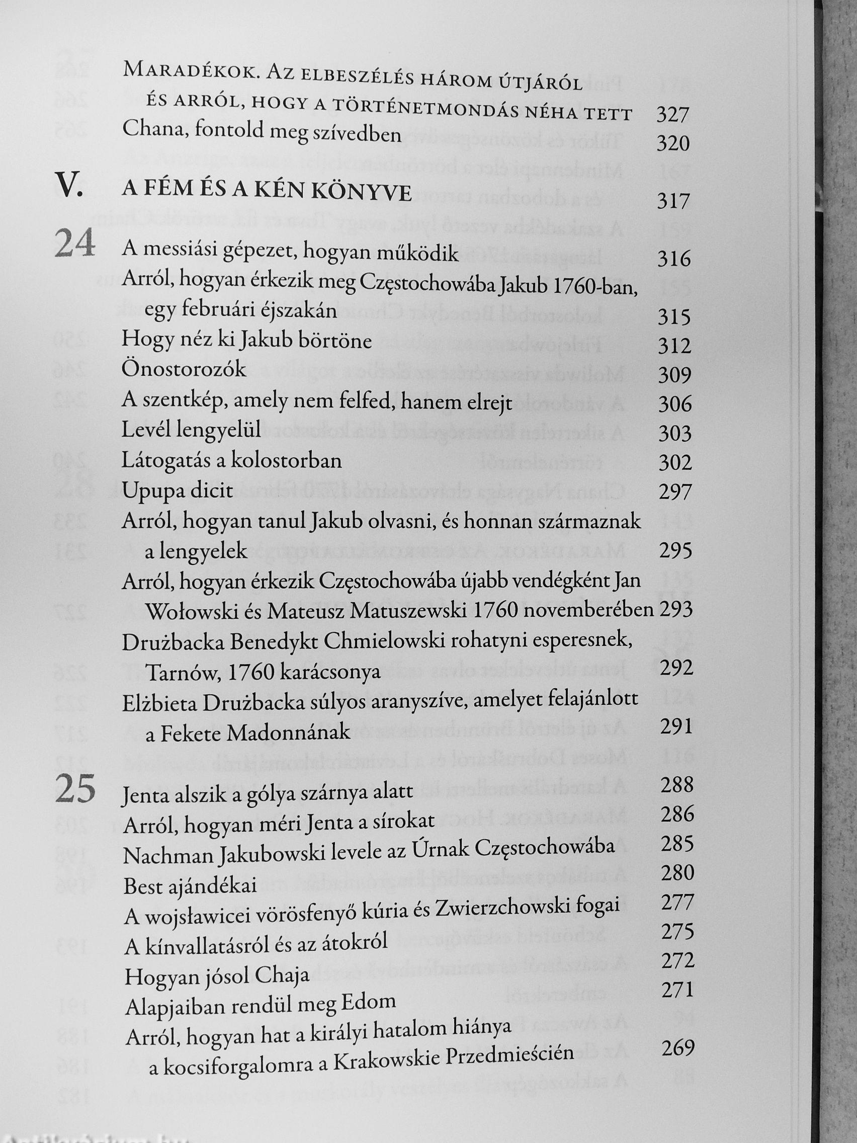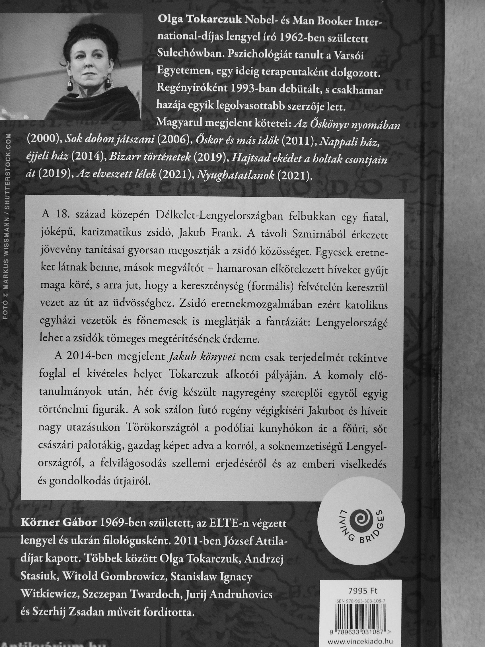 A 2014-ben megjelent Jakub könyvei nem csak terjedelmét tekintve foglal el kivételes helyet Tokarczuk alkotói pályáján. A komoly előtanulmányok után, hét évig készült nagyregény szereplői egytől egyig történelmi figurák. A sok szálon futó regény végigkíséri Jakubot és híveit nagy utazásukon Törökországtól a podóliai kunyhókon át a főúri, sőt császári palotákig, gazdag képet adva a korról, a soknemzetiségű Lengyelországról, a felvilágosodás szellemi erjedéséről és az emberi viselkedés és gondolkodás útjairól.