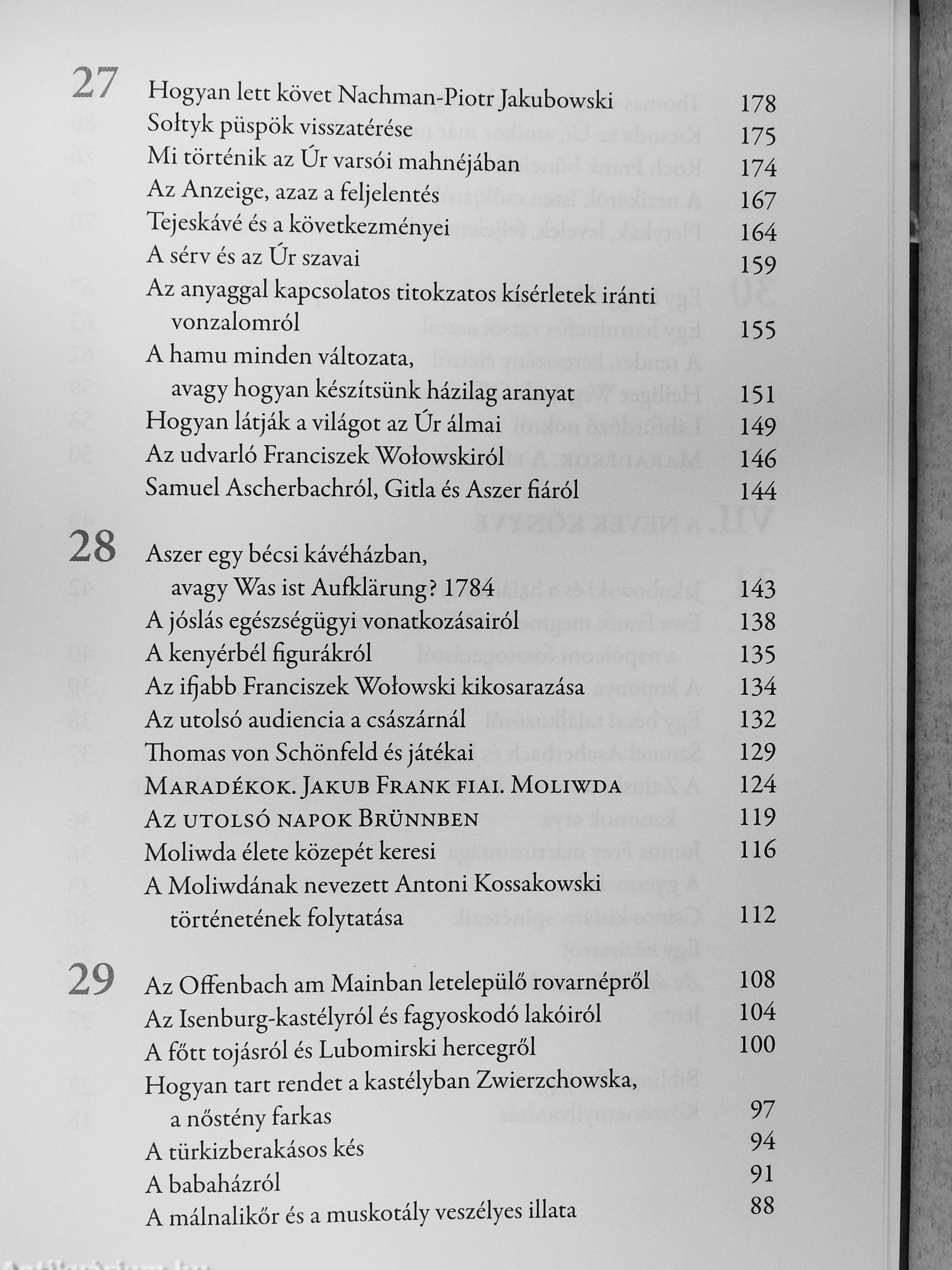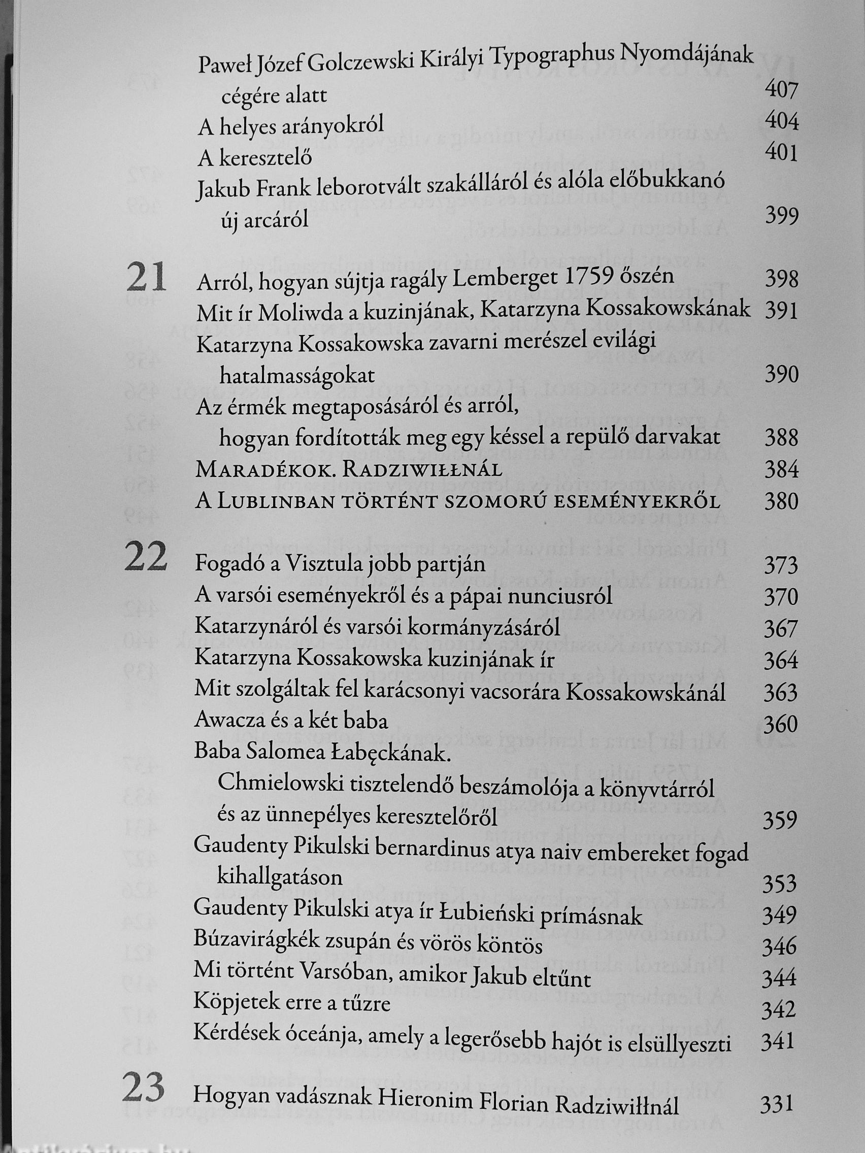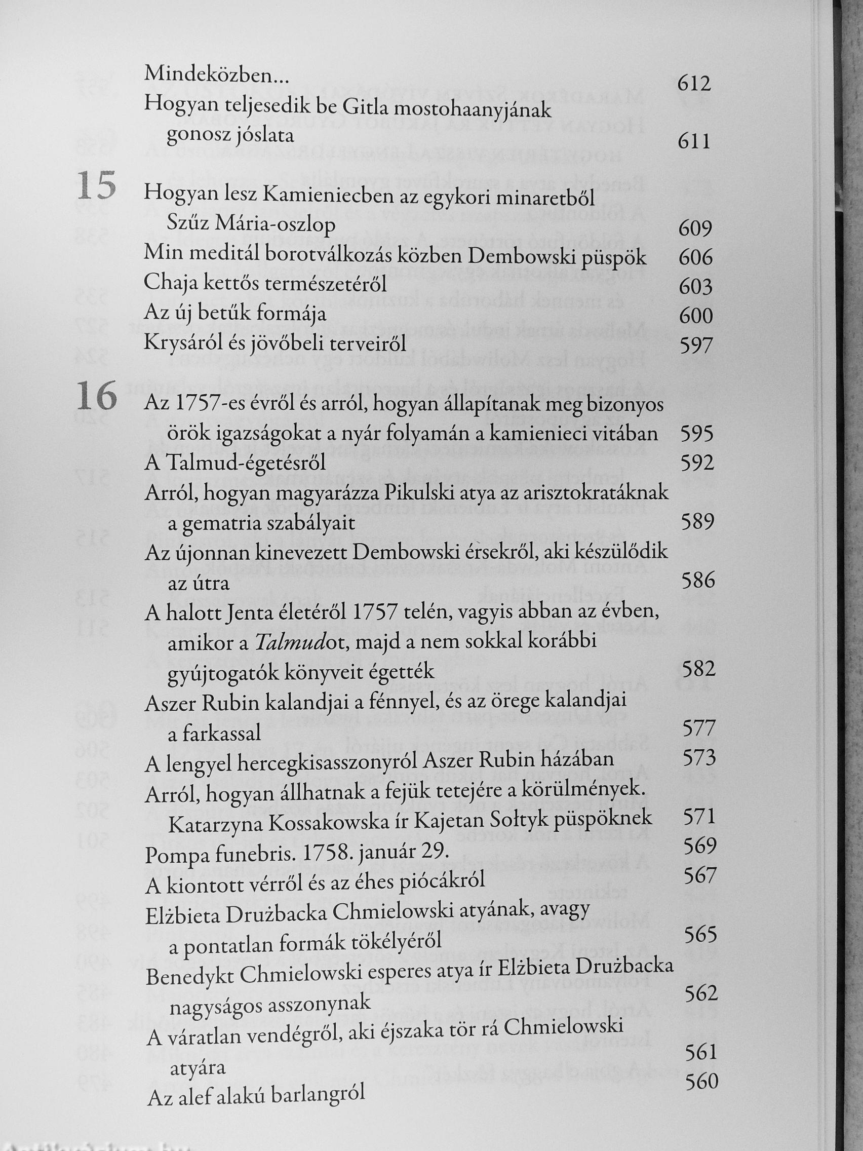 A 2014-ben megjelent Jakub könyvei nem csak terjedelmét tekintve foglal el kivételes helyet Tokarczuk alkotói pályáján. A komoly előtanulmányok után, hét évig készült nagyregény szereplői egytől egyig történelmi figurák. A sok szálon futó regény végigkíséri Jakubot és híveit nagy utazásukon Törökországtól a podóliai kunyhókon át a főúri, sőt császári palotákig, gazdag képet adva a korról, a soknemzetiségű Lengyelországról, a felvilágosodás szellemi erjedéséről és az emberi viselkedés és gondolkodás útjairól.