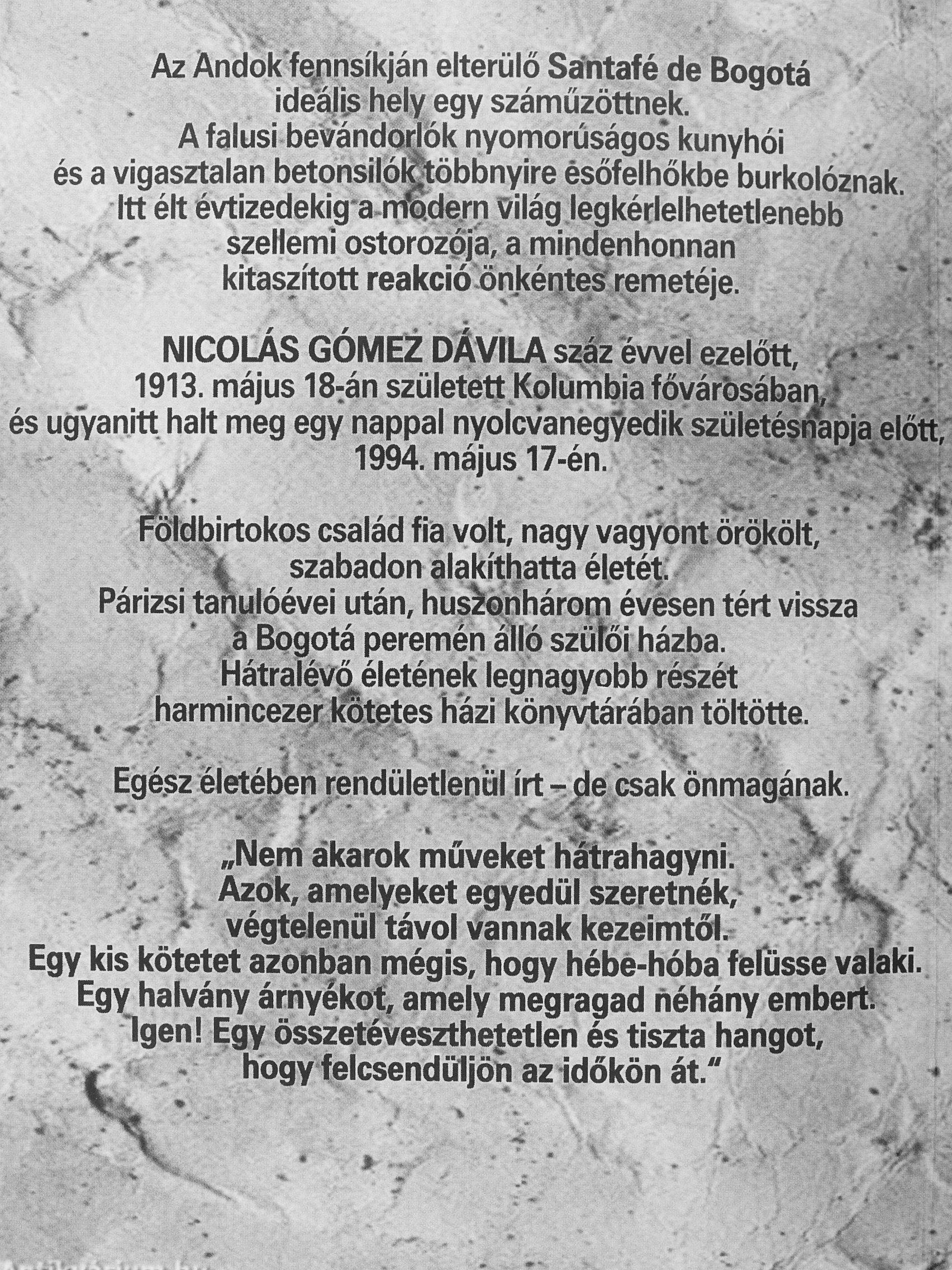 Az Andok'fe^nsíkján elterülő Safntafé de Bogotá ide^lÍ3 hely egy száműzöttnek. A falusi bevándortök nyomorúságos kunyhói és a vigasztalan betonsilpigtöbbnyire ésőfelhőkbe burkolóznak. Itt élt évtizedekig-a-triSdern Világ Jegkétlelhetetlenebb ^^ szeHemi ostorozpja, a mindenhonnan \ .