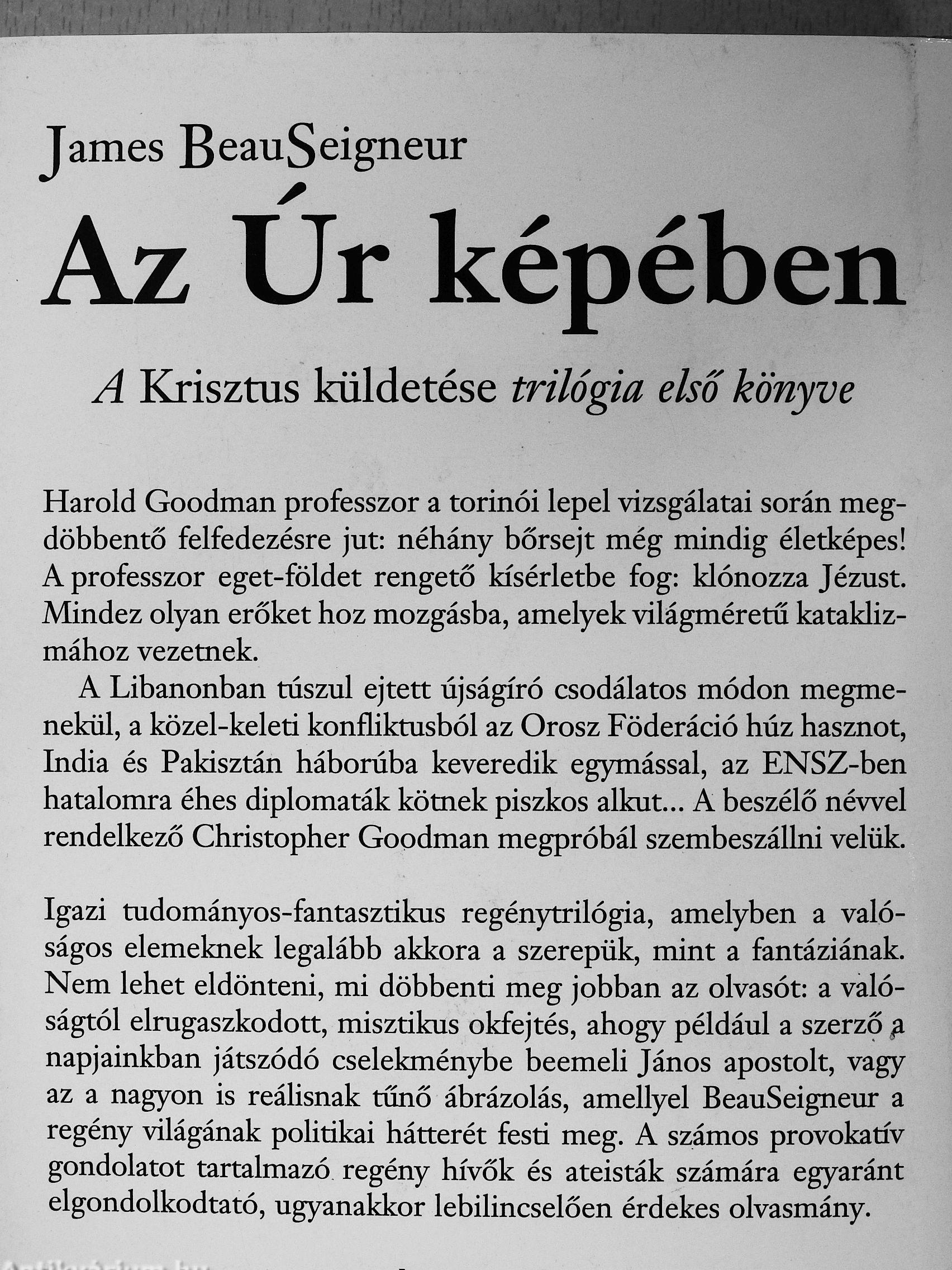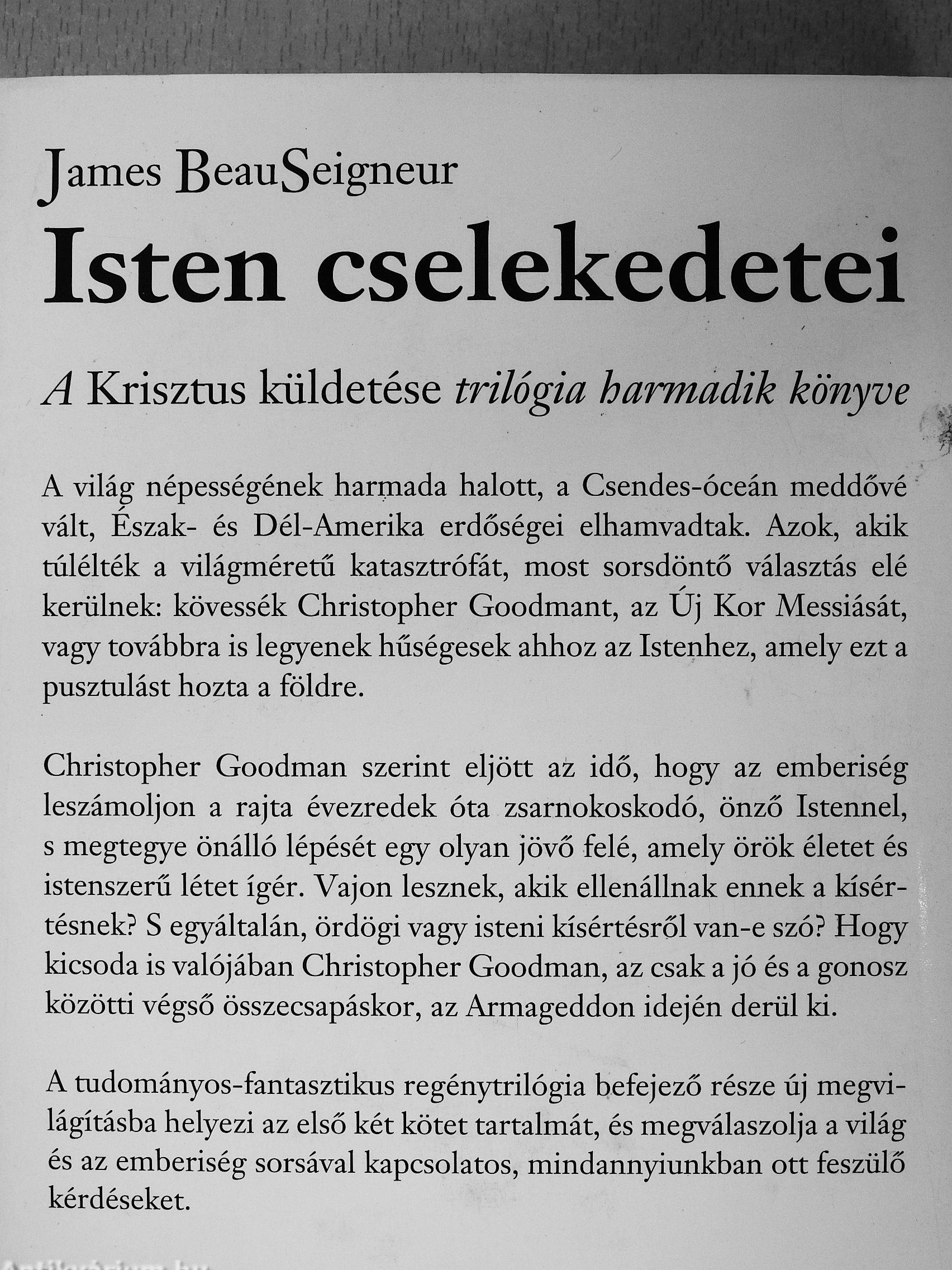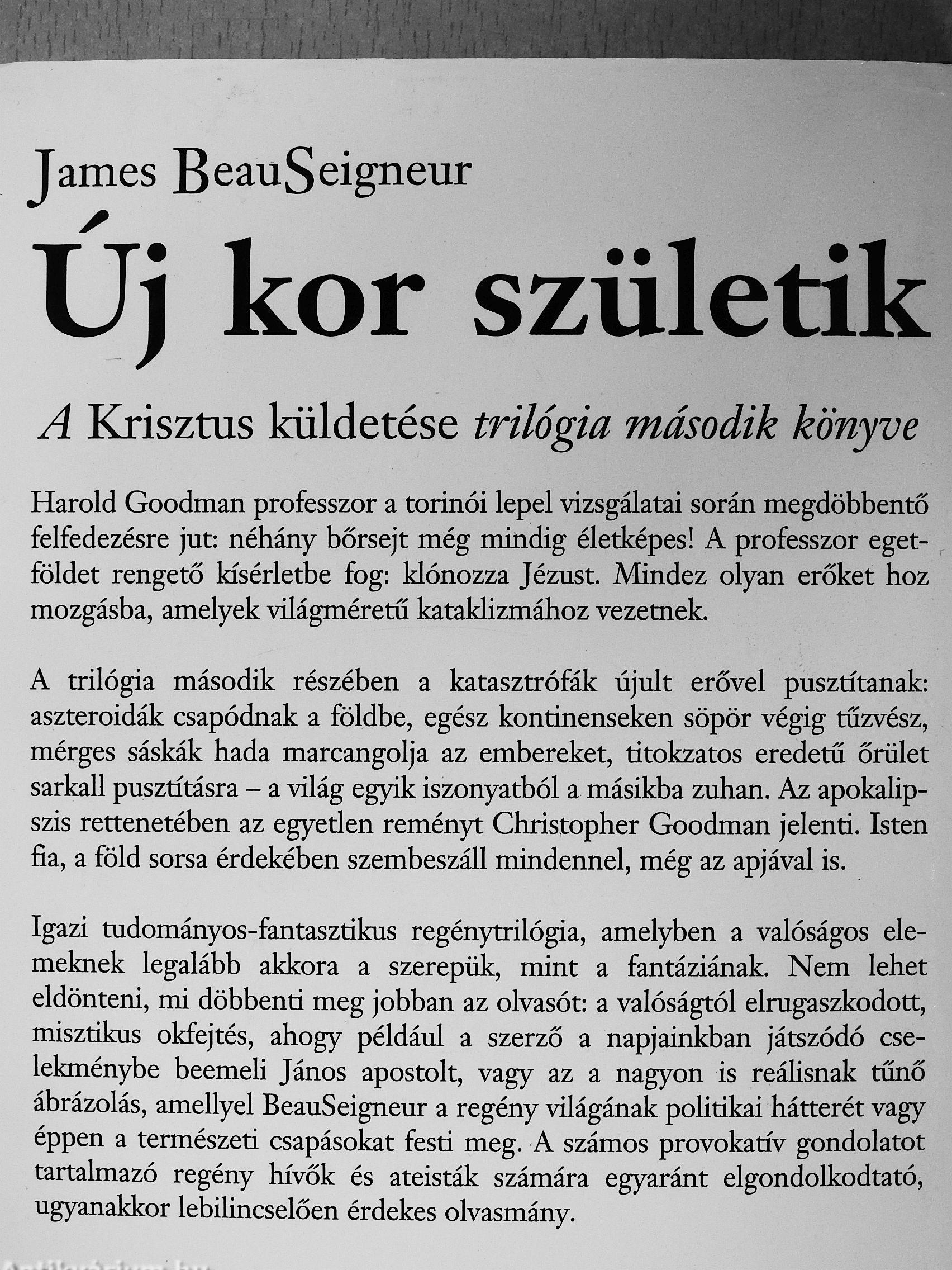 Igazi tudományos-fantasztikus regénytrilógia, amelyben a valóságos elemeknek legalább akkora a szerepük, mint a fantáziának. Nem lehet eldönteni, mi döbbenti meg jobban az olvasót: a valóságtól elrugaszkodott, misztikus okfejtés, ahogy például a szerző ^ napjainkban játszódó cselekménybe beemeli János apostolt, vagy az a nagyon is reálisnak tűnő ábrázolás, amellyel BeauSeigneur a regény világának politikai hátterét festi meg. A számos provokatív gondolatot tartalmazó regény hívők és ateisták számára egyaránt elgondolkodtató, ugyanakkor lebilincselően érdekes olvasmány.