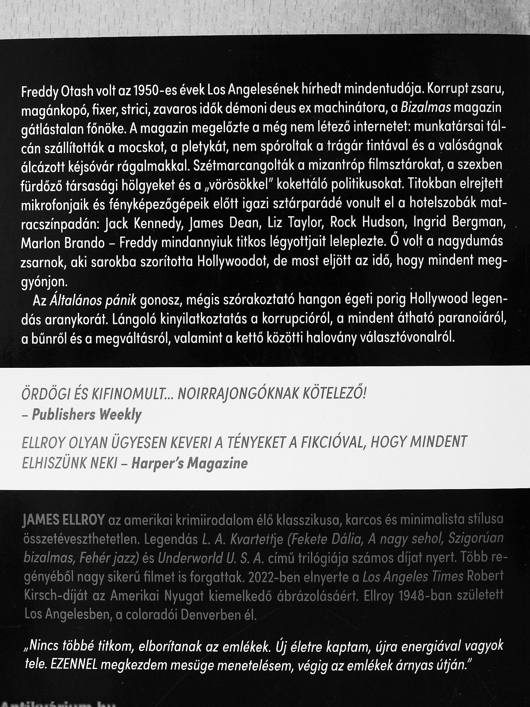 JAMES ELLROY az amerikai krimiirodalom élő klasszikusa, karcos és minimalista stílusa összetéveszthetetlen. Legendás L. A. Kvartetfie (Fekete Dália, A nagy sehol, Szigorúan bizalmas, Fehér jazz) és Underworld U. S. A. című trilógiája számos díjat nyert. Több regényéből nagy sikerű filmet is forgattak. 2022-ben elnyerte a Los Angeles Times Róbert Kirsch-díját az Amerikai Nyugat kiemelkedő ábrázolásáért. Ellroy 1948-ban született Los Angelesben, a coloradói Denverben él.