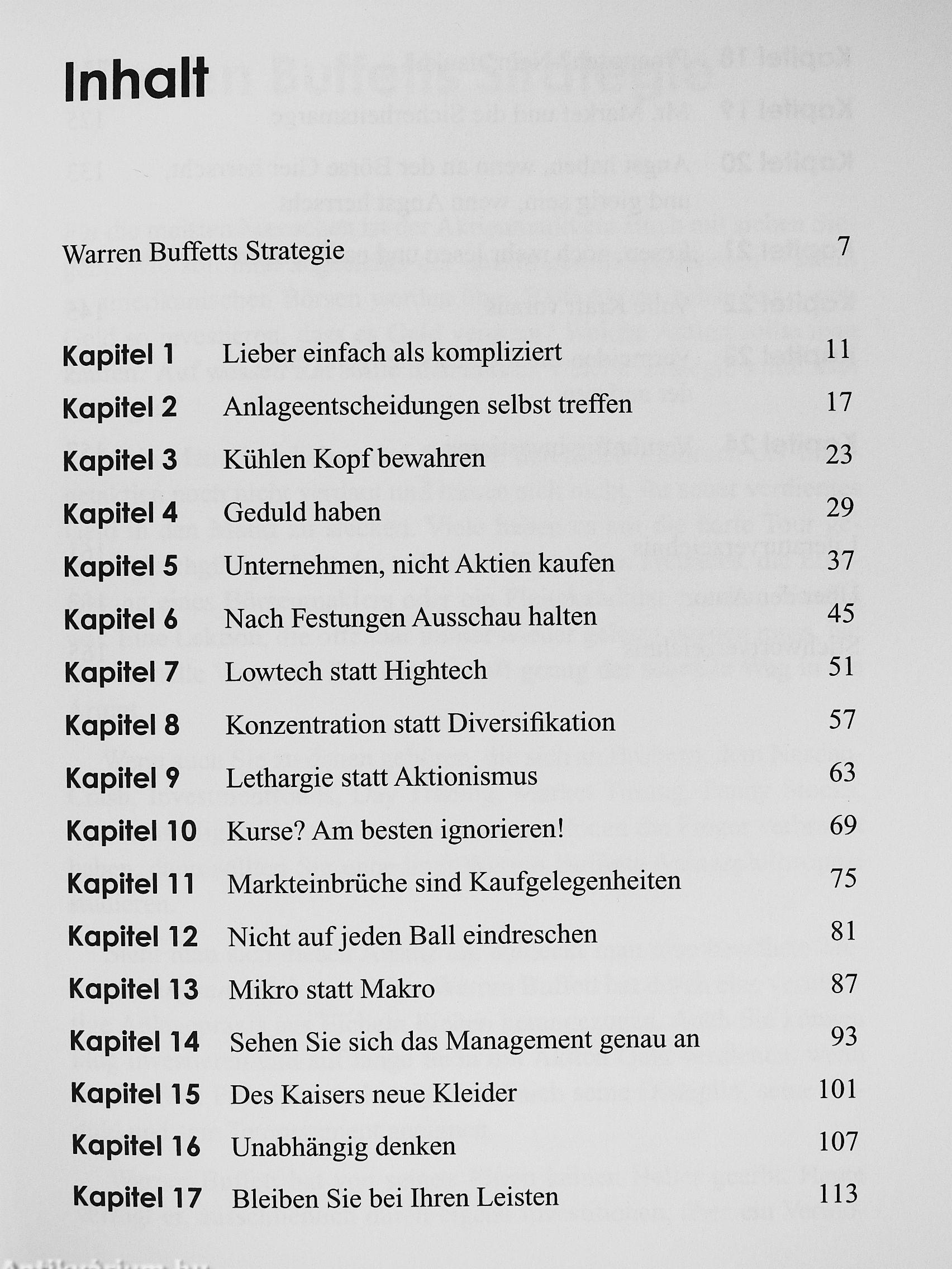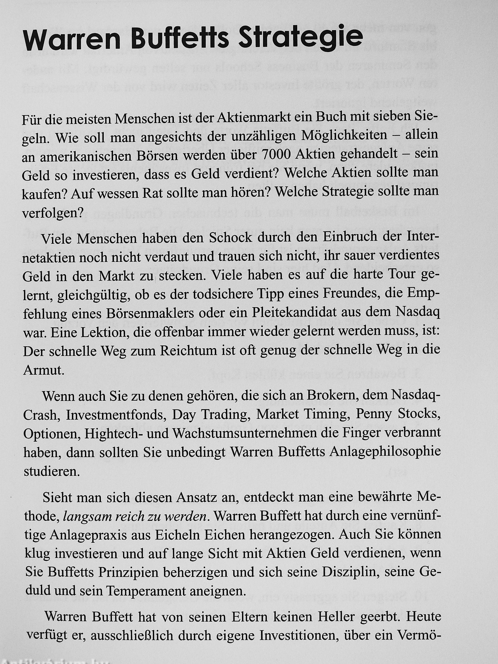 Warren Buffett ist der weltweit erfolgreichste Investor. Seine Berkshire Hathaway Aktien, emittiert um 450 Dollar per Aktie, werden jetzt auf einem Allzeit-Hoch von 95.000 Dollar gehandelt. Buffetts Anlagestil: Er kauft nicht, was er nicht kennt, er spekuliert nicht mit dem zeitlichen Verlauf des Marktes und er hört weder auf Analysten noch schaut er in die Aktien-Charts. Er kümmert sich nicht um das Auf und Ab des Marktes. Leuten, die keinen Crash aushalten, rät er ganz einfach, nicht in Aktien zu investieren. Und seine „holding period" ist „für immer". Kurzum: Warren Buffett ist der beste Investor, an dem sich andere Investoren orientieren können. Und seine Methoden funktionieren sowohl bei Anfängern als auch hei erfahrenen Veteranen.