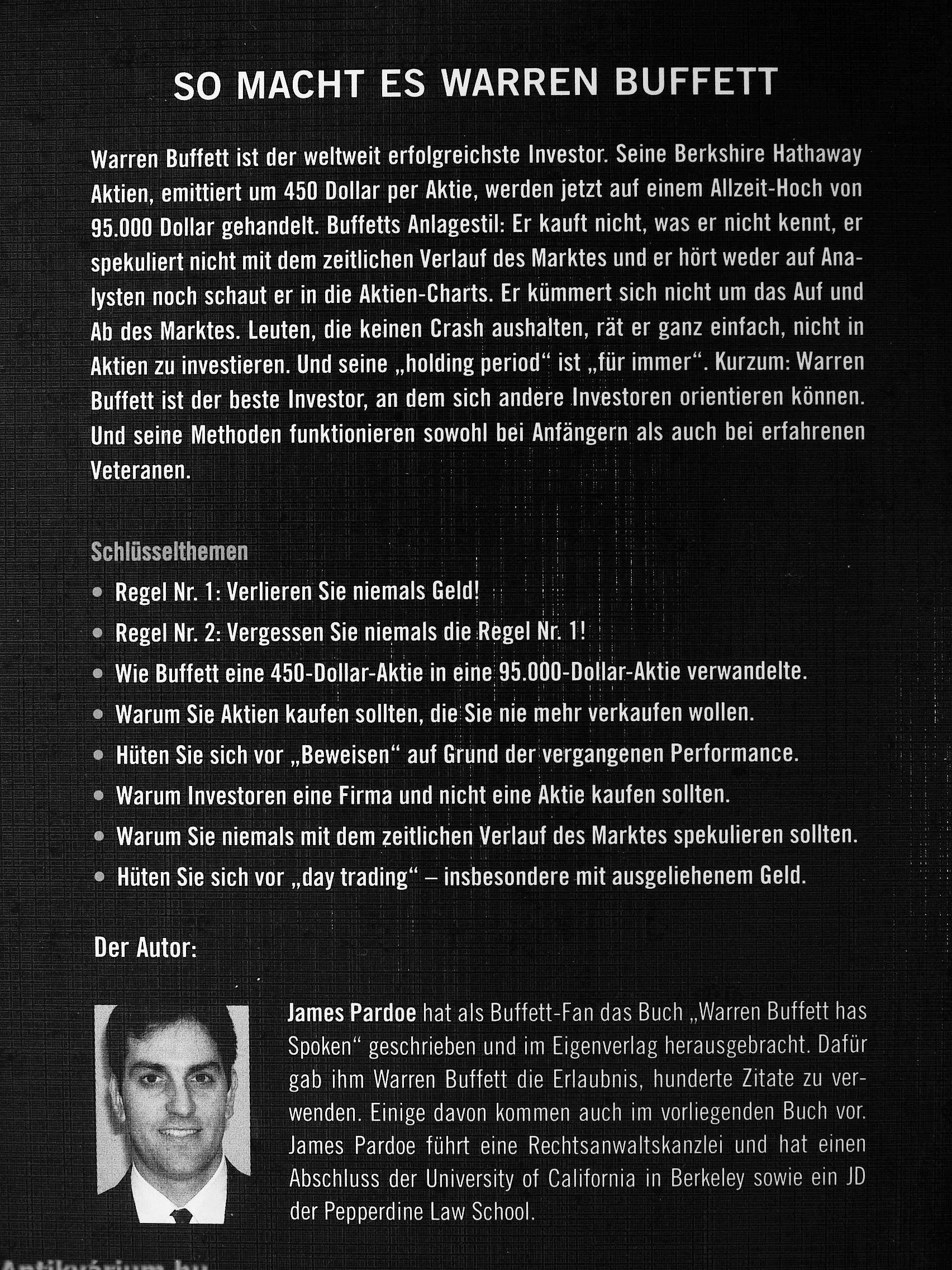 James Pardoe hat als Buffett-Fan das Buch „Warren Buffett has Spoken" geschrieben und im Eigenverlag herausgebracht. Dafür gab ihm Warren Buffett die Erlaubnis, hunderte Zitate zu verwenden. Einige davon kommen auch im vorliegenden Buch vor. James Pardoe führt eine Rechtsanwaltskanzlei und hat einen Abschluss der University of California in Berkeley sowie ein JD der Pepperdine Law School.