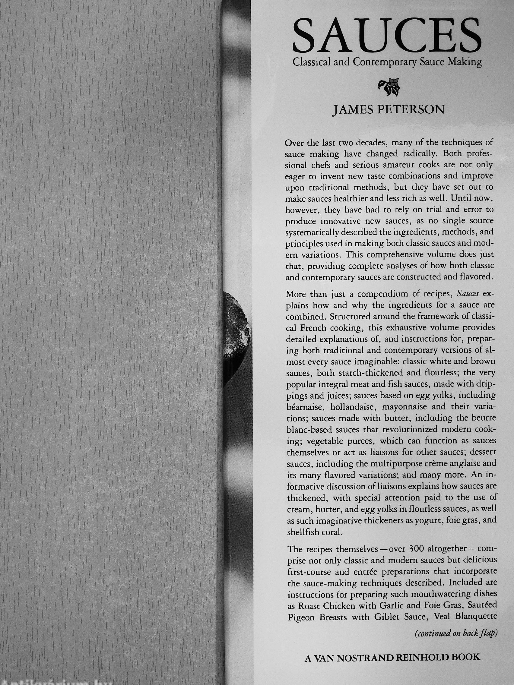 "James Peterson has done for sauces that which Escofifier did for the cuisine of La Belle Époque . . . Sauces is a manual for the professional cook and, as such, it will rapidly become a classic and indispensable reference "