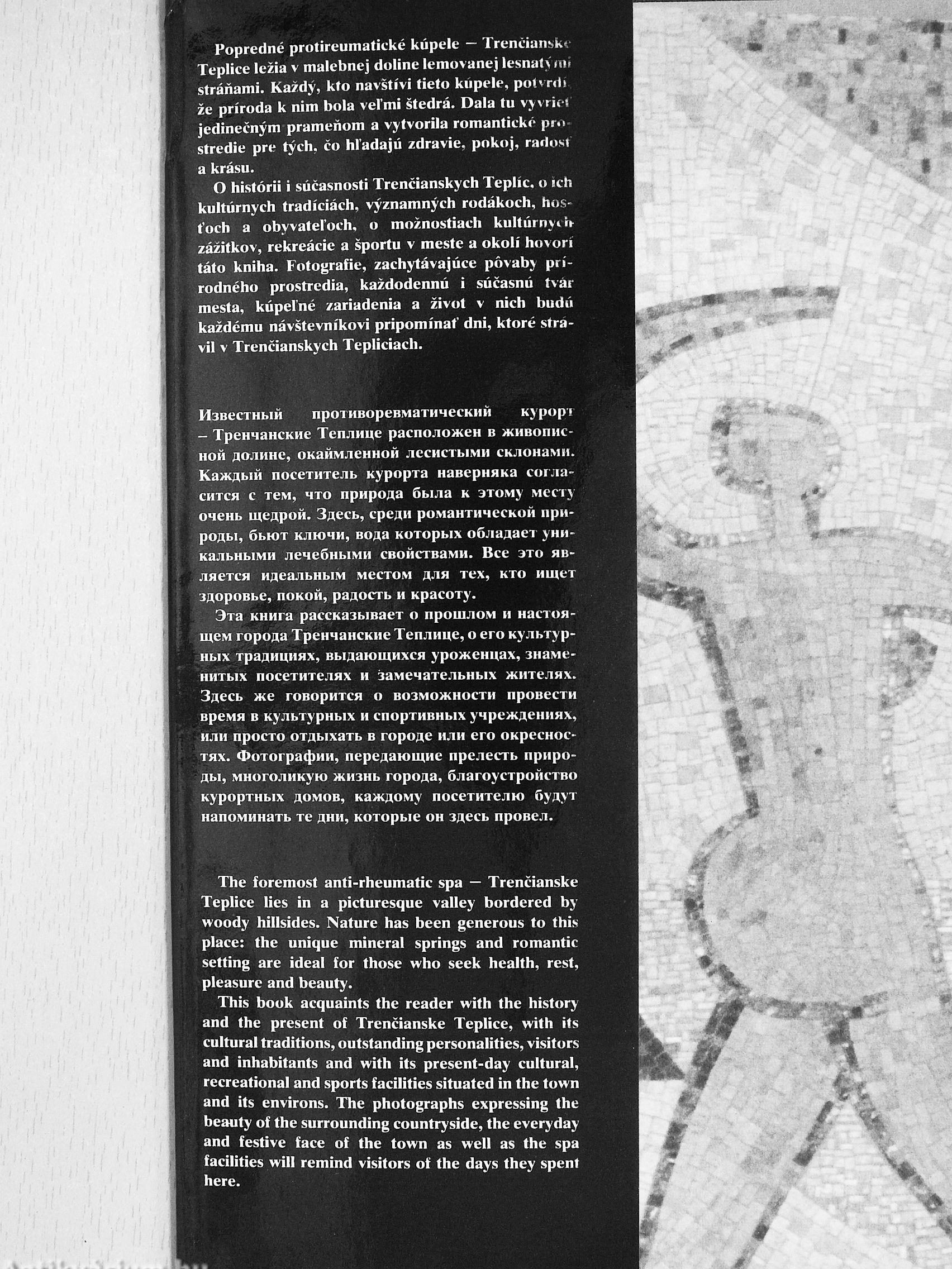 This book acquaints the reader with the histor} and the present of Trencianske Teplice, with its cultural traditions, outstanding personalities, visitors and inhabitants and with its present-day cultural, recreational and sports facilities situated in the town and its environs. The photographs expressing the beauty of the surrounding countryside, the everyday and festive face of the town as well as the spa facilities will remind visitors of the days they spent here.