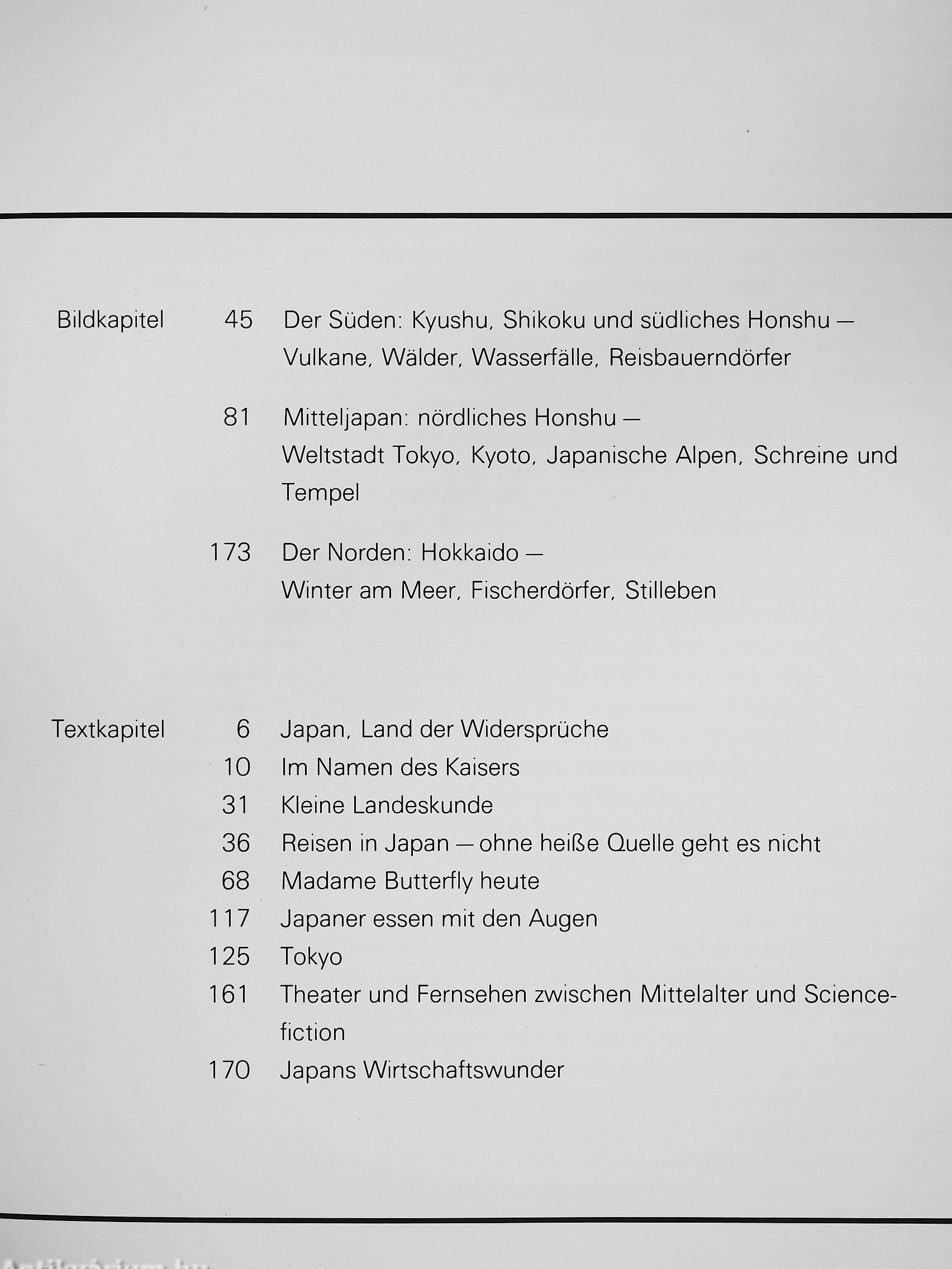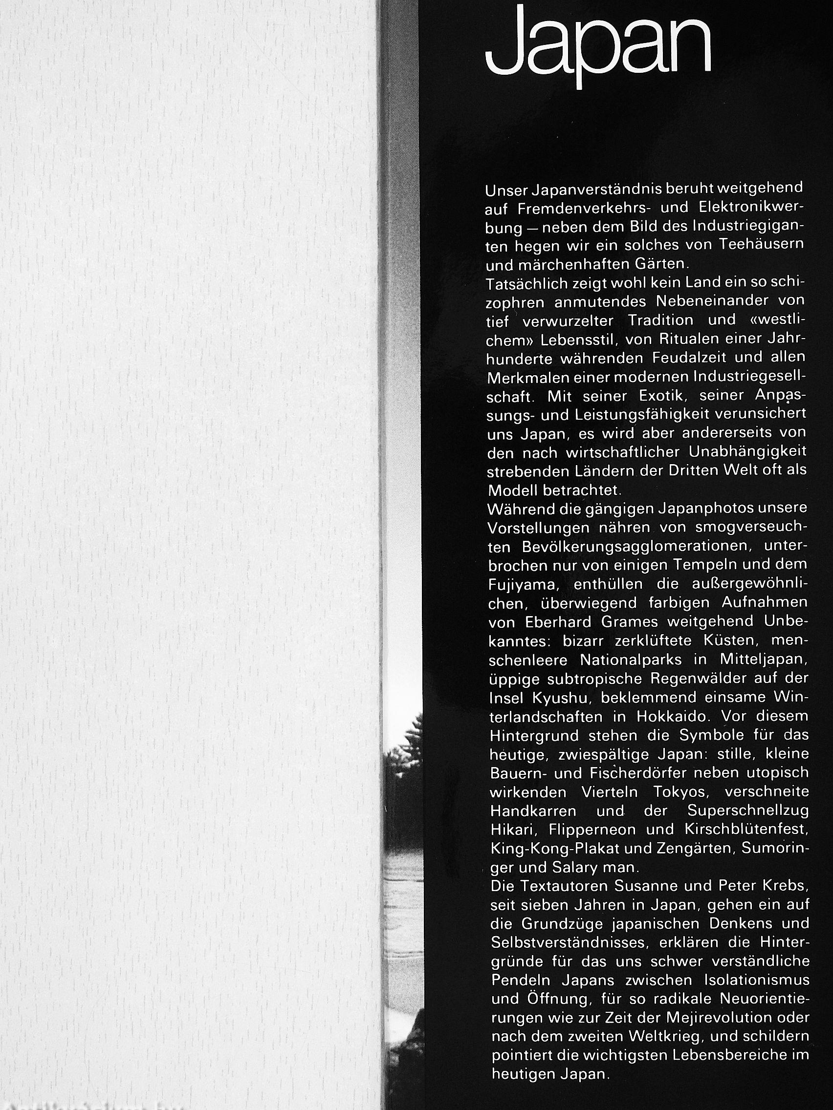 Die Textautoren Susanne und Peter Krebs, seit sieben Jahren in Japan, gehen ein auf die Grundzüge japanischen Denkens und Selbstverständnisses, erklären die Hintergründe für das uns schwer verständliche Pendeln Japans zwischen Isolationismus und Öffnung, für so radikale Neuorientierungen wie zur Zeit der Mejirevolution oder nach dem zweiten Weltkrieg, und schildern pointiert die wichtigsten Lebensbereiche im heutigen Japan.