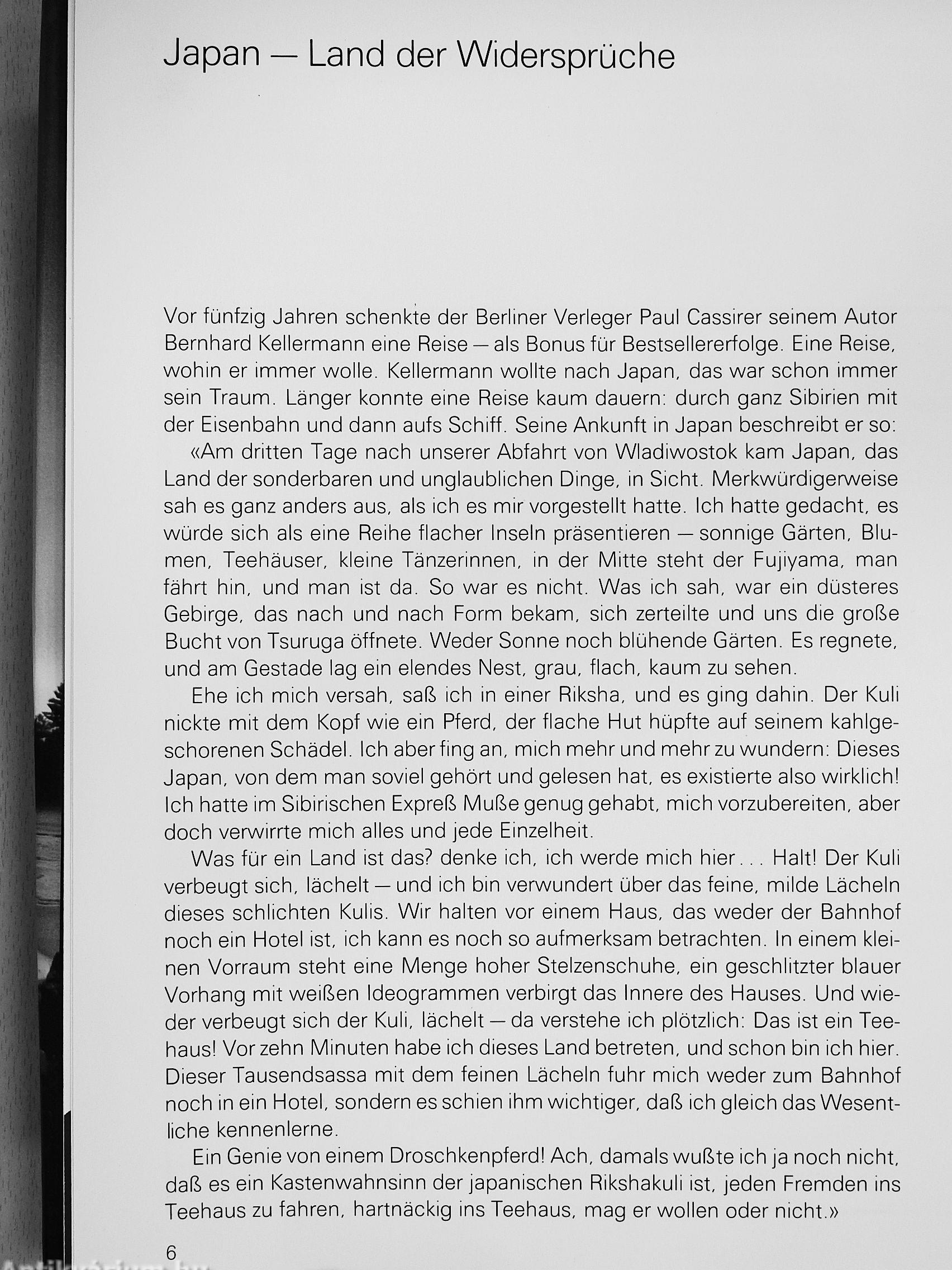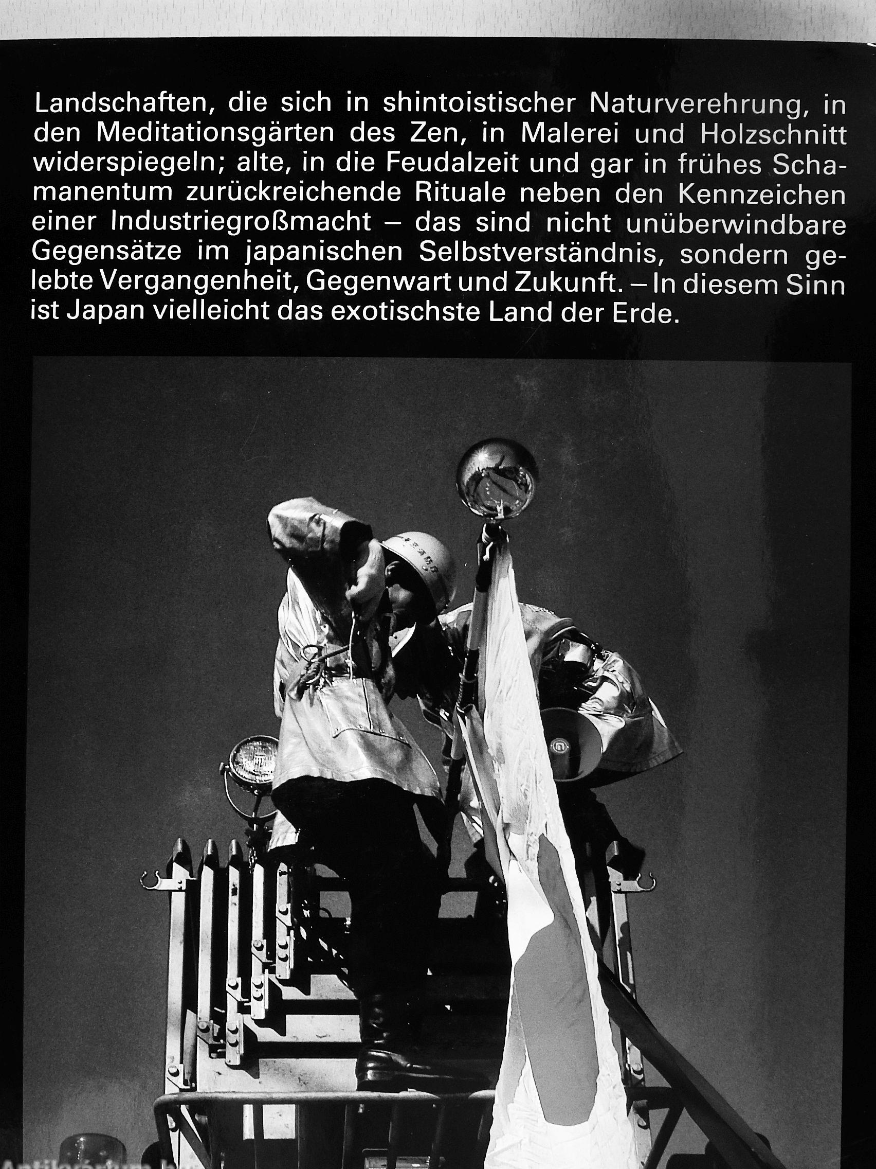 Landschaften, die sich in shintoistischer Naturverehrung, in den Meditationsgärten des Zen, in Malerei und Holzschnitt widerspiegeln; alte, in die Feudalzeit und gar in frühes Scha-manentum zurückreichende Rituale neben den Kennzeichen einer Industriegroßmacht - das sind nicht unüberwindbare Gegensätze im japanischen Selbstverständnis, sondern gelebte Vergangenheit, Gegenwart und Zukunft. - In diesem Sinn ist Japan vielleicht das exotischste Land der Erde.