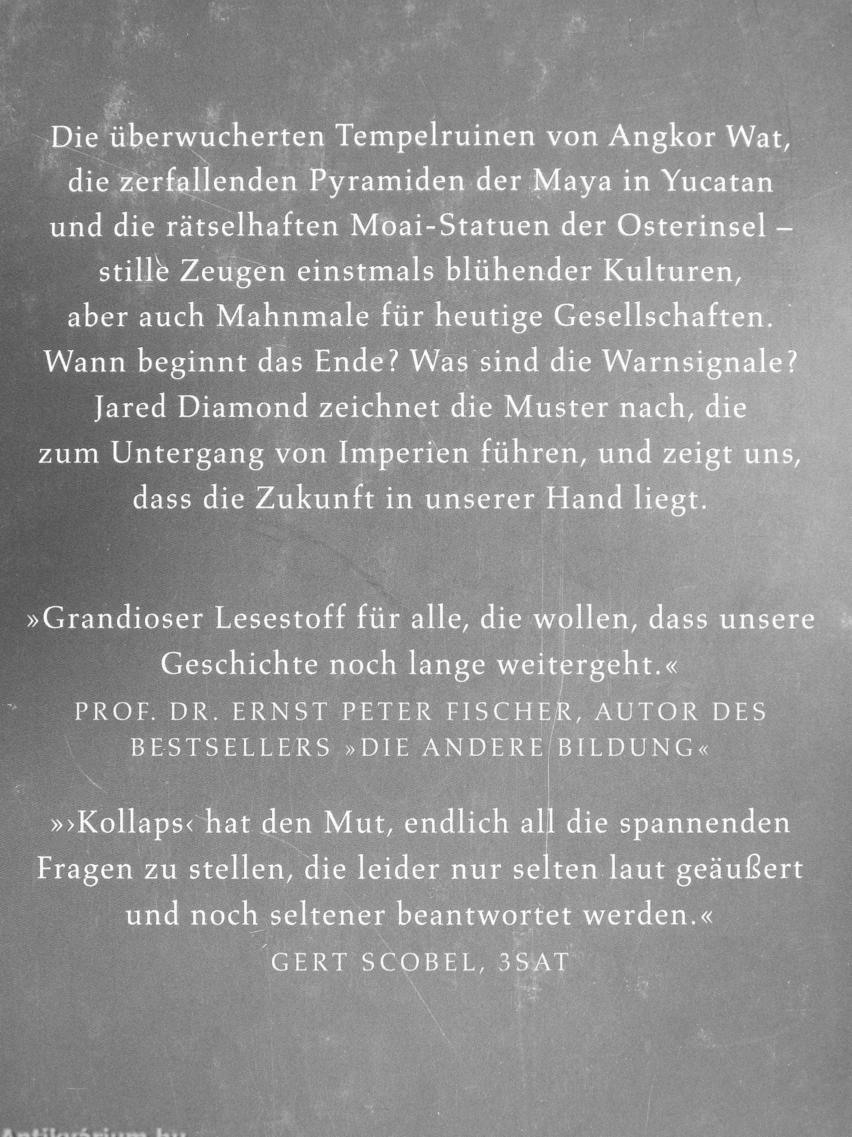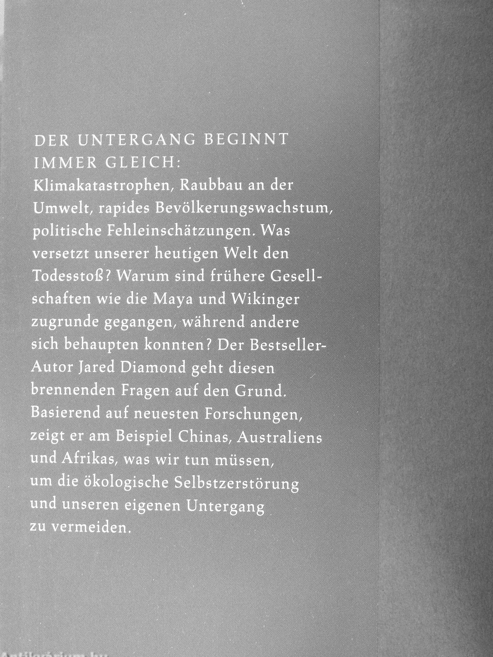 DER UNTERGANG BEGINNT IMMER GLEICH: Klimakatastrophen, Raubbau an der Umwelt, rapides Bevölkerungswachstum, politische Fehleinschätzungen. Was versetzt unserer heutigen Welt den Todesstoß? Warum sind frühere Gesellschaften wie die Maya und Wikinger zugrunde gegangen, während andere sich behaupten konnten? Der Bestseller-Autor Jared Diamond geht diesen brennenden Fragen auf den Grund. Basierend auf neuesten Forschungen, zeigt er am Beispiel Chinas, Australiens und Afrikas, was wir tun müssen, um die ökologische Selbstzerstörung und unseren eigenen Untergang zu vermeiden.