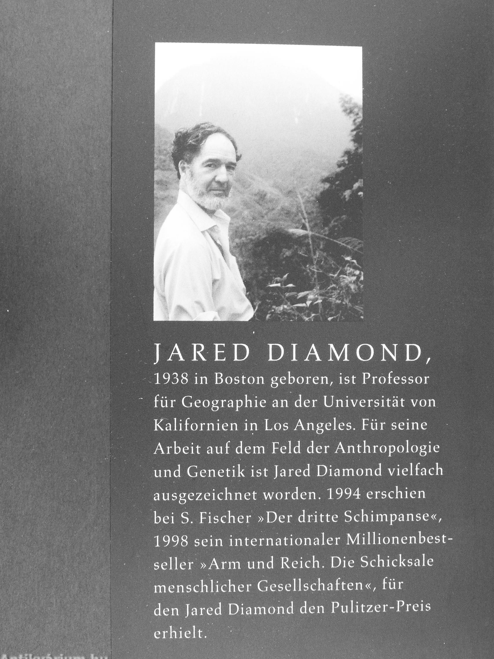-1938 in Boston geboren, ist Professor für Geographie an der Universität von Kalifornien in Los Angeles. Für seine Arbeit auf dem Feld der Anthropologie und Genetik ist Jared Diamond vielfach ausgezeichnet worden. 1994 erschien bei S. Fischer »Der dritte Schimpanse«, 1998 sein internationaler Millionenbestseller »Arm und Reich. Die Schicksale menschlicher Gesellschaften«, für den Jared Diamond den Pulitzer-Preis erhielt.