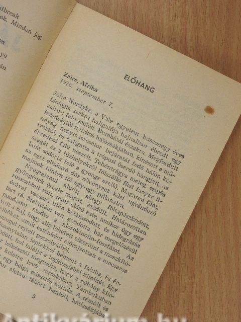 "John Nordyke, a Yale egyetem huszonegy éves biológia szakos hallgatója hajnalban ébrend egy zaire-i falu szélén, Bumbától északra. Megfordult izzadságtól nyirkos hálózsákjában... Nyugtalanul aludt; ahogy föltápászkodott, gyöngének érezte magát, szédült. Határozottan rosszabbul volt, mint előző este... Maláriám van, gondolta, bár megelőzésül gondosan szedte a klorokinolin-foszfátot... Bizonytalan léptekkel bement a faluba, és érdeklődött, hol találja a legközelebbi klinikát. Egy vándorlelkésztől megtudta, hogy a néhány kilométerre keletre fekvő városkában, Yambukuban működik egy belga missziós kórház..."