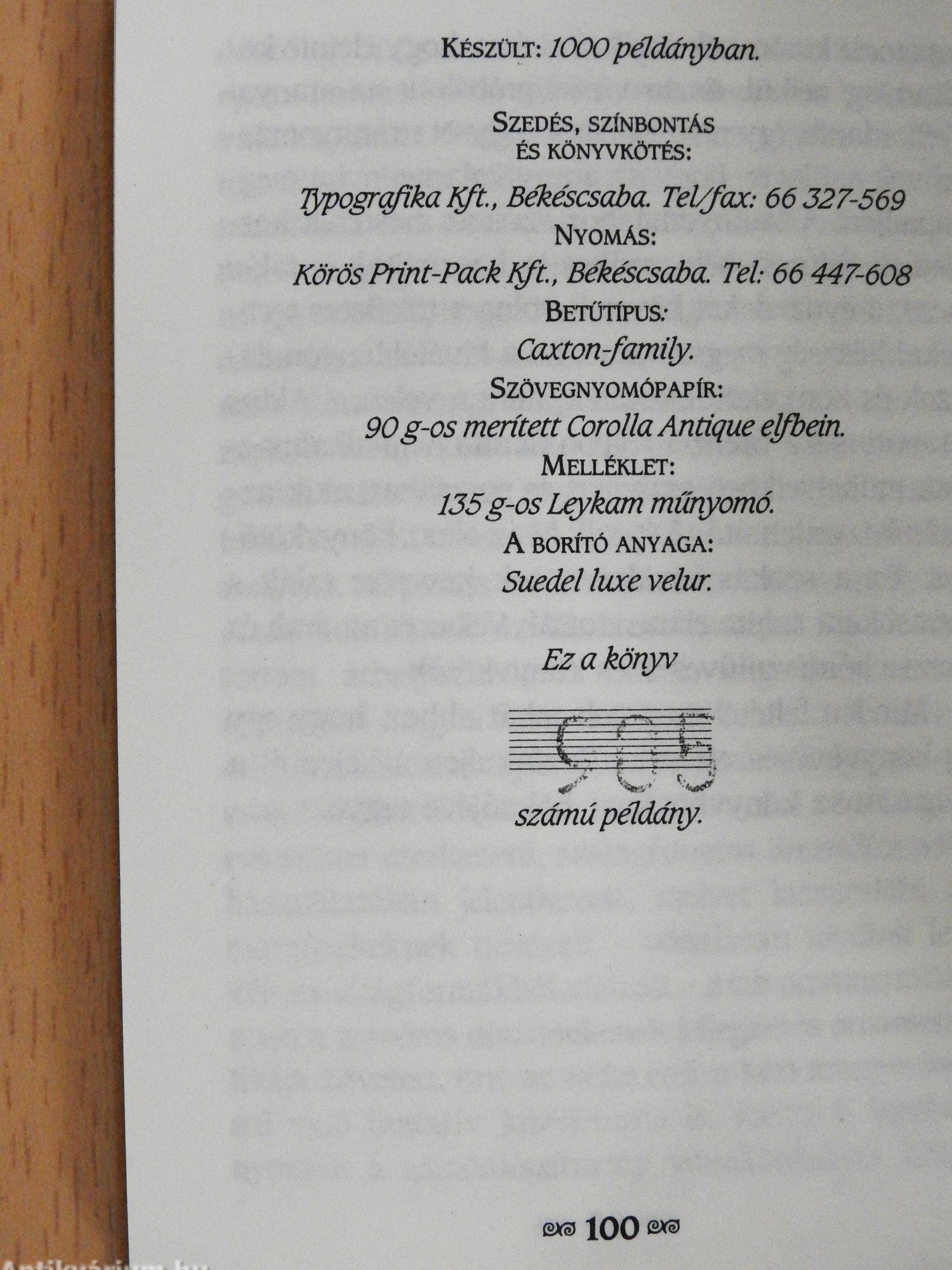 | Megjegyzés: | Készült 1000 számozott példányban. Színes és fekete-fehér fotókkal, illusztrációkkal. Nyomás: Körös-Print-Pack Kft., Békéscsaba Betűtípus: Caxton-family A könyv pontos mérete: 70 x 98 mm |