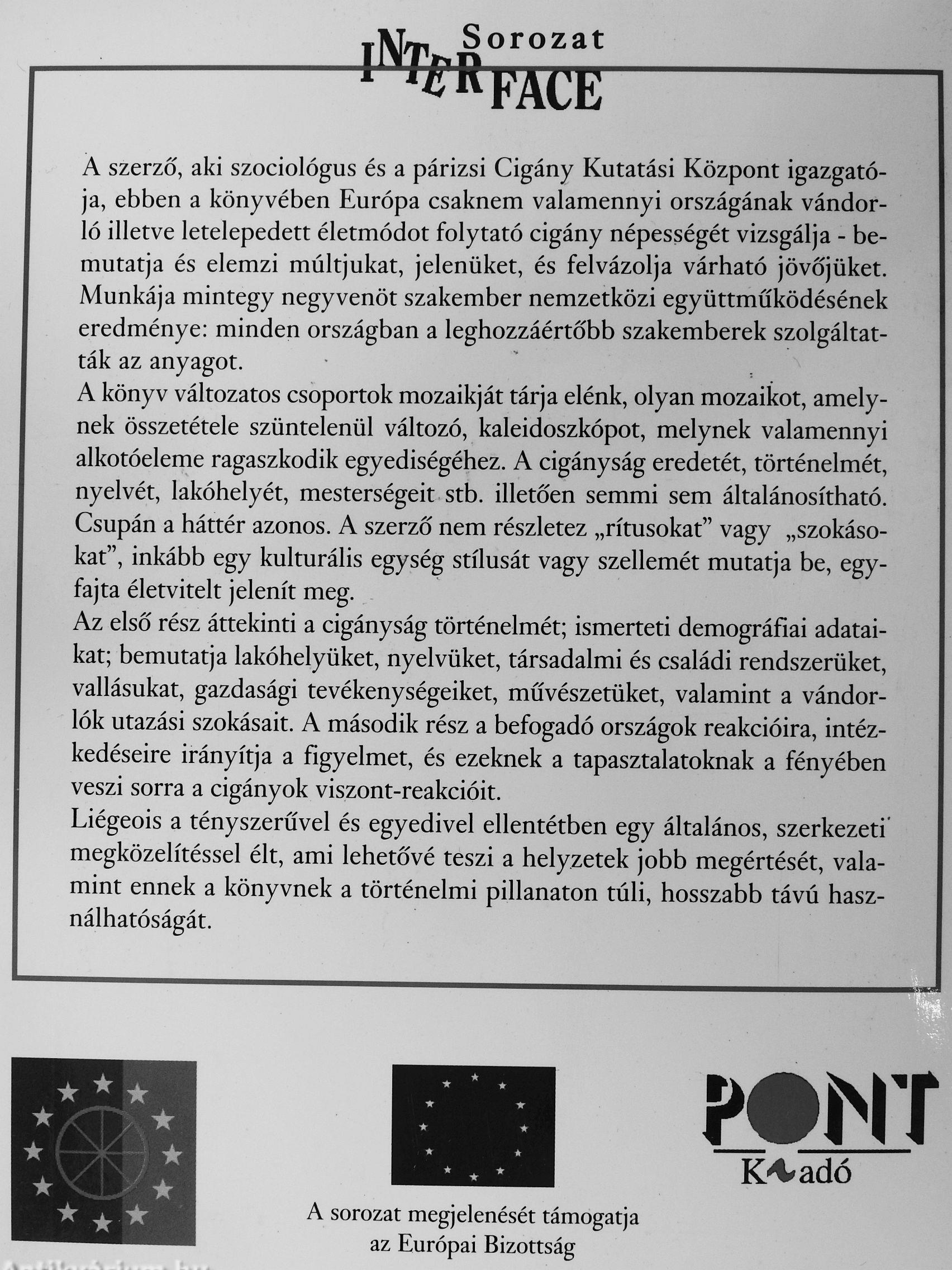 A szerző, aki szociológus és a párizsi Cigány Kutatási Központ igazgatója, ebben a könyvében Európa csaknem valamennyi országának vándorló illetve letelepedett életmódot folytató cigány népességét vizsgálja - bemutatja és elemzi múltjukat, jelenüket, és felvázolja várható jövőjüket. Munkája mintegy negyvenöt szakember nemzetközi együttműködésének eredménye: minden országban a leghozzáértőbb szakemberek szolgáltatták az anyagot.