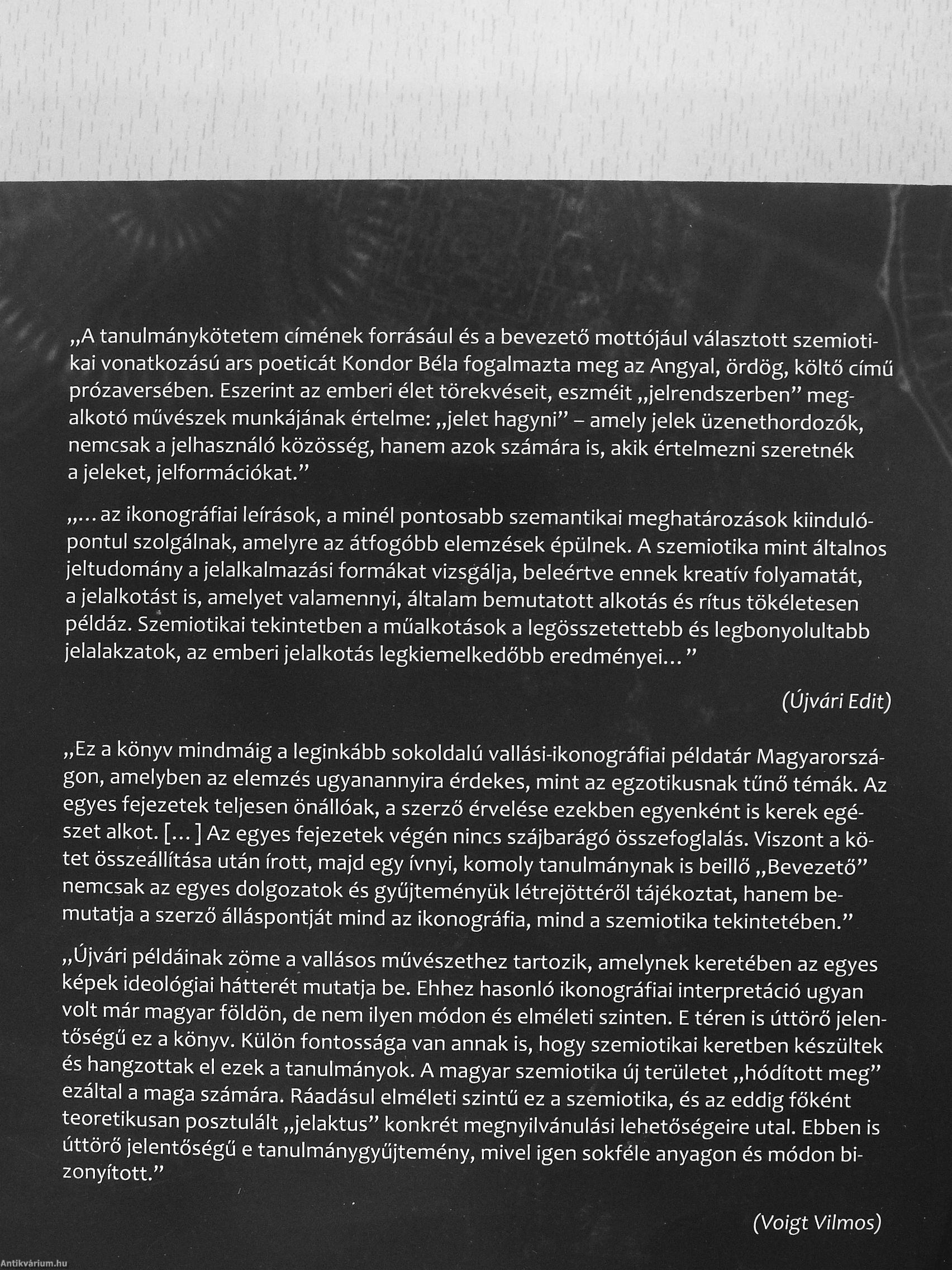 „Ez a könyv mindmáig a leginkább sokoldalú vallási-ikonográfiai példatár Magyarországon, amelyben az elemzés ugyanannyira érdekes, mint az egzotikusnak tűnő témák. Az egyes fejezetek teljesen önállóak, a szerző érvelése ezekben egyenként is kerek egészet alkot. [ ] Az egyes fejezetek végén nincs szájbarágó összefoglalás. Viszont a kötet összeállítása után írott, majd egy ívnyi, komoly tanulmánynak is beillő „Bevezető" nemcsak az egyes dolgozatok és gyűjteményük létrejöttéről tájékoztat, hanem bemutatja a szerző álláspontját mind az ikonográfia, mind a szemiotika tekintetében."