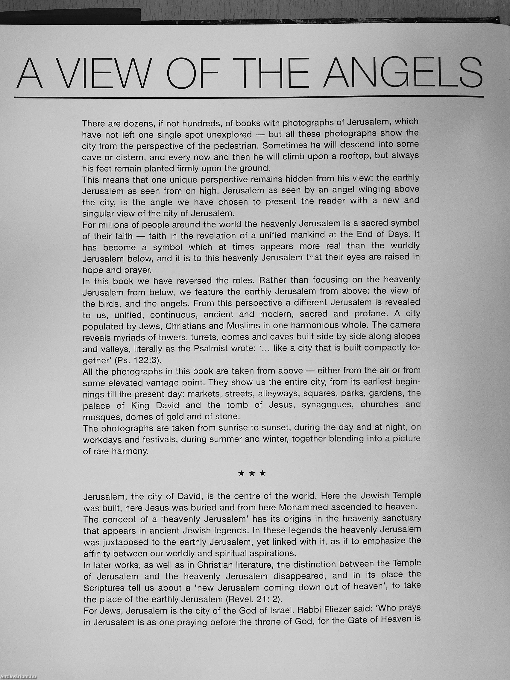 The photographs in this book, all taken from the air or from some elevated vantage point, show us the entire city, from Its earliest beginnings till the present day: markets and streets, minarets and domes, walls and courtyards, religious processions and revellers, pilgrims and idlers, sunrises and sunsets, workdays and festivals, ancient ruins and new and reconstructed buildings, together blending Into a picture of rare harmony — as the Psalmist