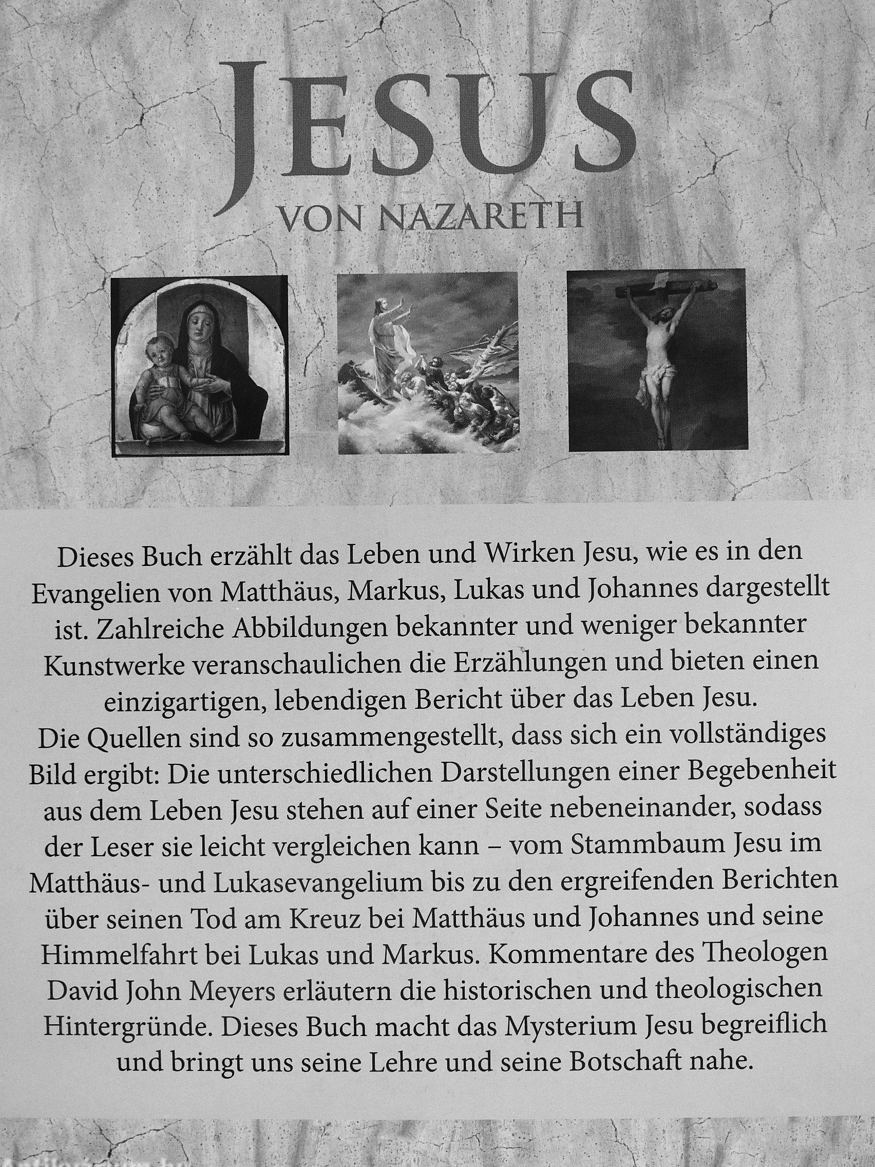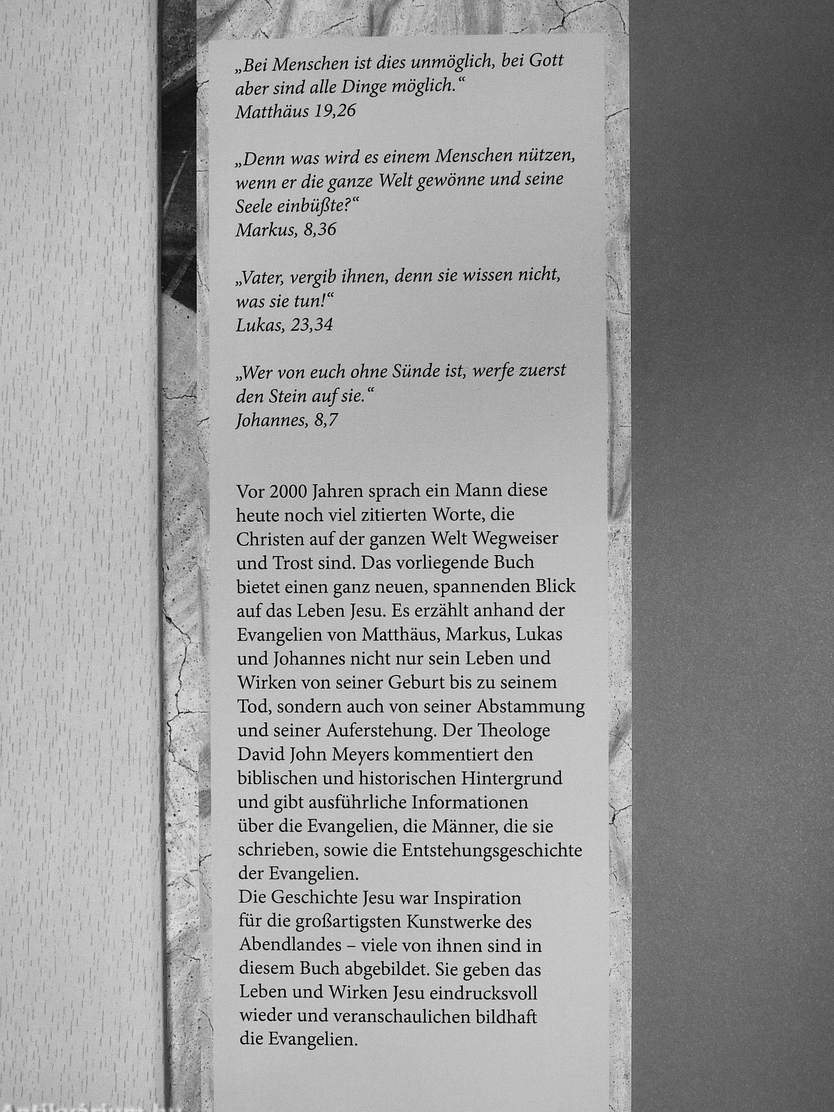Vor 2000 Jahren sprach ein Mann diese heute noch viel zitierten Worte, die Christen auf der ganzen Welt Wegweiser und Trost sind. Das vorliegende Buch bietet einen ganz neuen, spannenden Blick auf das Leben Jesu. Es erzählt anhand der Evangelien von Matthäus, Markus, Lukas und Johannes nicht nur sein Leben und Wirken von seiner Geburt bis zu seinem Tod, sondern auch von seiner Abstammung und seiner Auferstehung. Der Theologe David John Meyers kommentiert den biblischen und historischen Hintergrund und gibt ausführliche Informationen über die Evangelien, die Männer, die sie schrieben, sowie die Entstehungsgeschichte der Evangelien.