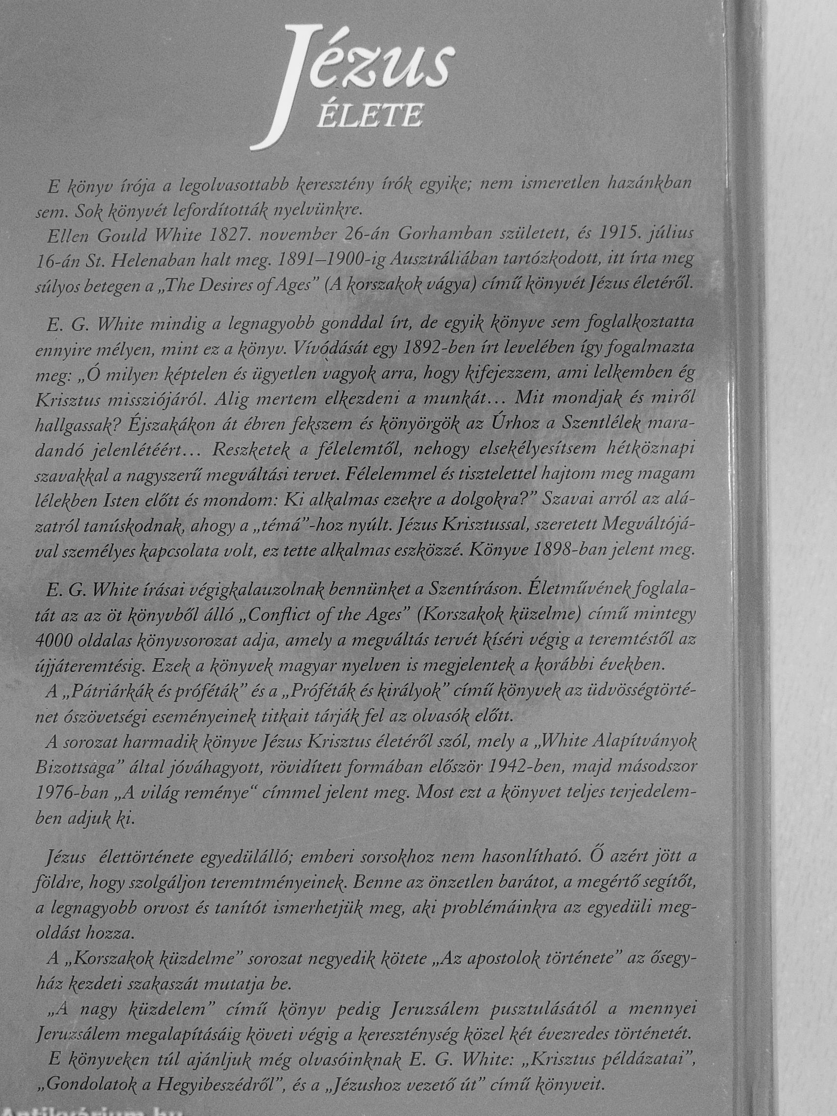 A sorozat harmadik^ ^ö^yfi; Jézus Krisztus életéről szól, mely a ,jVhite Alapítványok Bizottsága" által jóváhagyott, rövidített formában először 1942-ben, majd másodszor 1976-ban „A világ reménye" címmel jelent meg. Most ezt a könyvet teljes terjedelemben adjuk ki-
