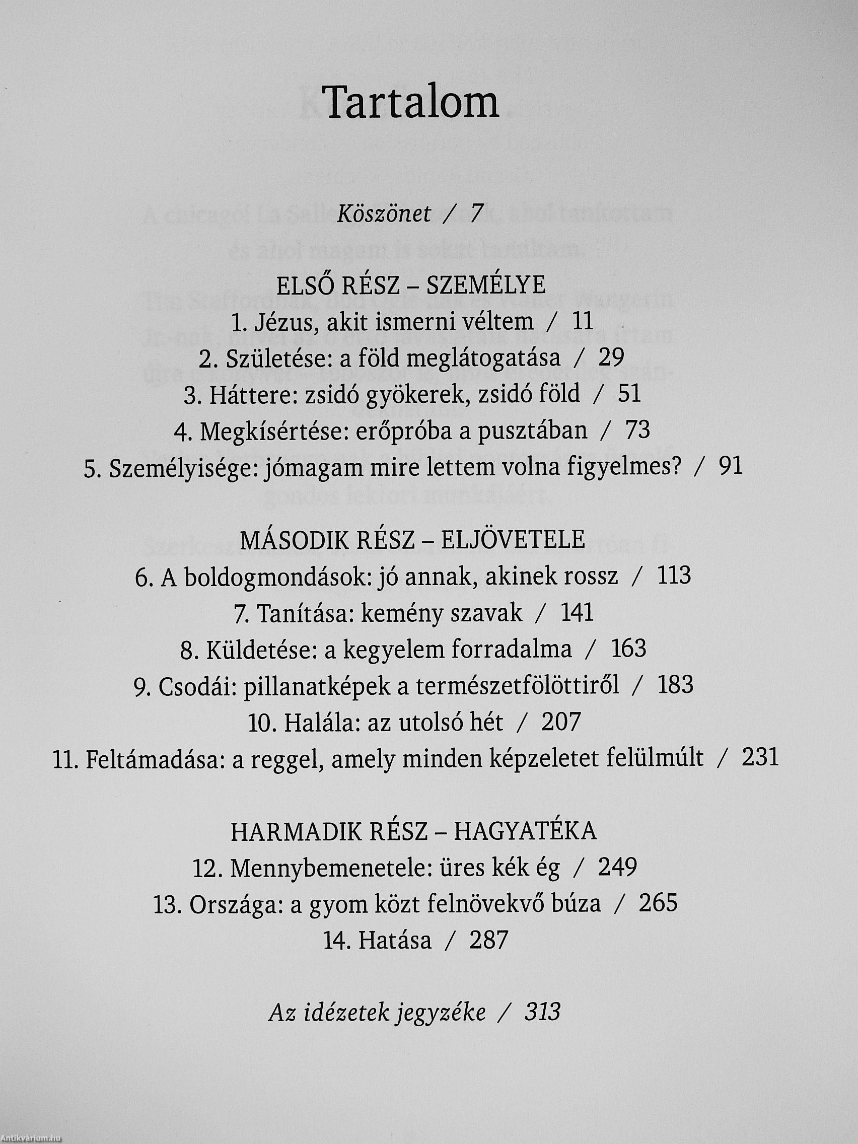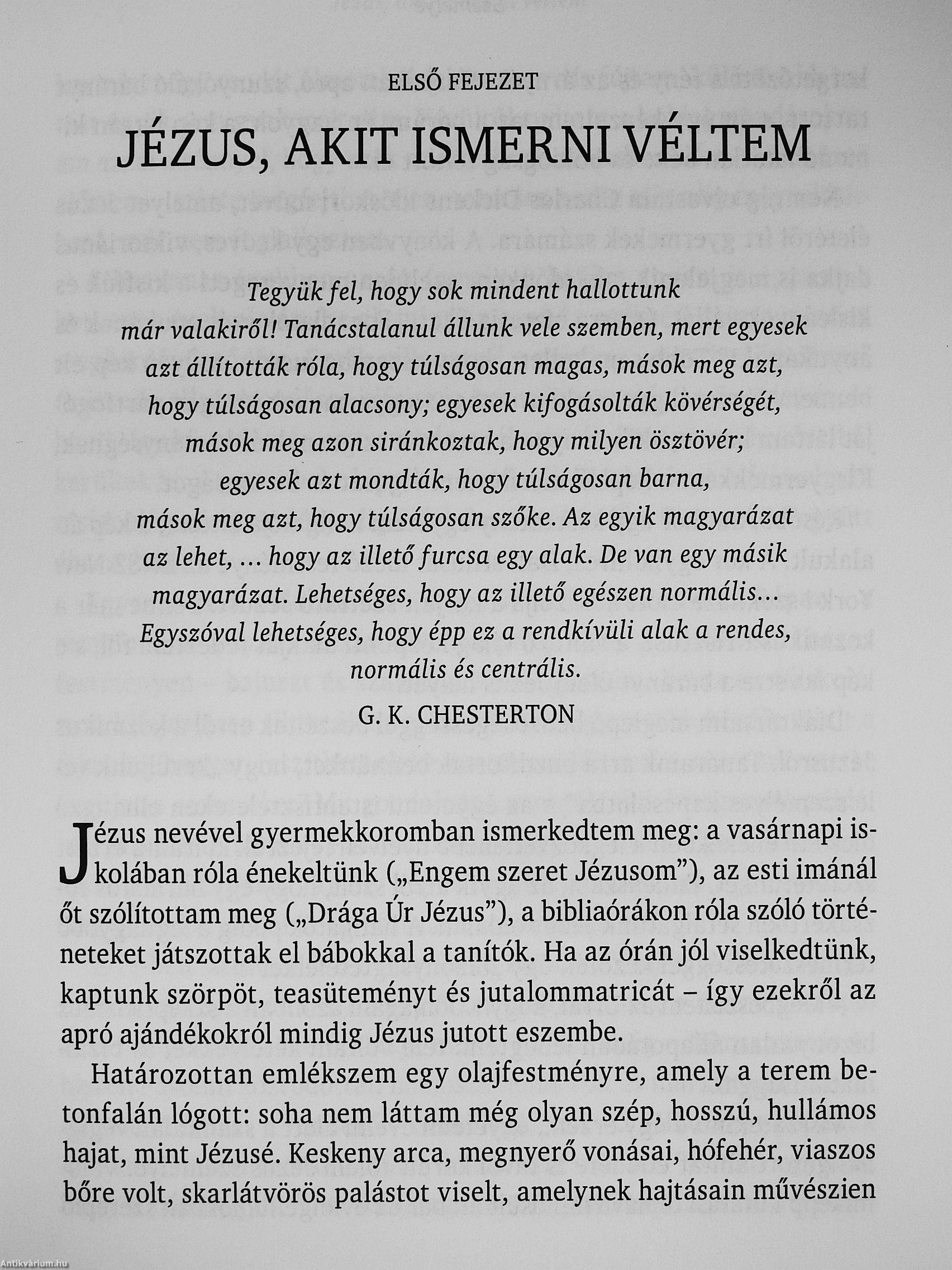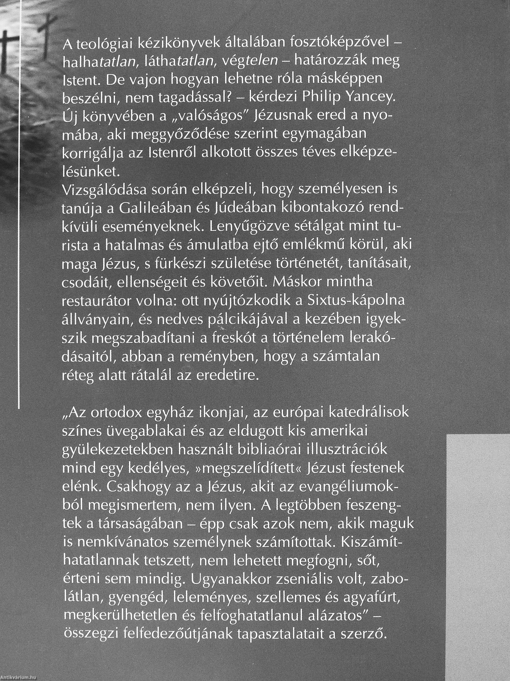 „Az ortodox egyház ikonjai, az európai katedrálisok színes üvegablakai és az eldugott kis amerikai gyülekezetekben használt bibliaórai illusztrációk mind egy kedélyes, »megszelídített« Jézust festenek elénk. Csakhogy az a Jézus, akit az evangéliumokból megismertem, nem ilyen. A legtöbben feszengtek a társaságában - épp csak azok nem, akik maguk is nemkívánatos személynek számítottak. Kiszámíthatatlannak tetszett, nem lehetett megfogni, sőt, érteni sem mindig. Ugyanakkor zseniális volt, zabolátlan, gyengéd, leleményes, szellemes és agyafúrt, megkerülhetetlen és felfoghatatlanul alázatos" -összegzi felfedezőútjának tapasztalatait a szerző. Vissza