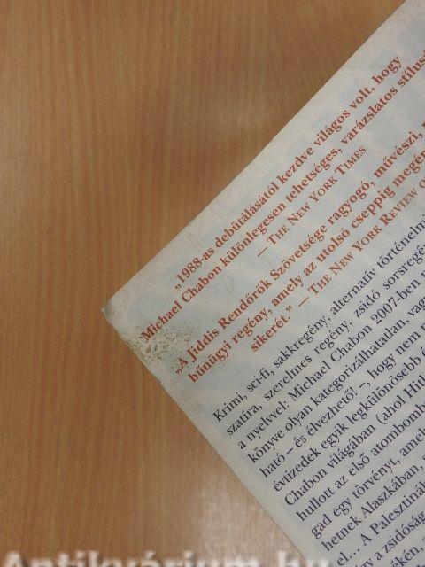 Krimi, sci-fi, sakkregény, alternatív történelmi fantazmagória, politikai szatíra, szerelmes regény, zsidó sorsregény, nabokovi ihletésű játék a nyelvvel: Michael Chabon 2007-ben megjelent, számos díjat elnyert könyve olyan kategorizálhatatlan, vagy olyan sokféleképpen kategorizálható - és élvezhető! -, hogy nem nagy merészség kimondani: az elmúlt évtizedek egyik legkülönösebb és legnagyszerűbb irodalmi alkotása. Chabon világában (ahol Hitler előbb legyőzte Sztálint, s aztán Berlinre hullott az első atombomba) Amerika a második világháború alatt elfogad egy törvényt, amelynek értelmében a menekülő zsidók letelepedhetnek Alaszkában, s így a holokausztban „csak" kétmillió zsidó pusztul el... A Palesztinában létrejövő zsidó államot az arab túlerő elpusztítja, s így a zsidóság nagy része Alaszkában köt ki, egy Sitka nevű városban és környékén, amely hatvan évre autonómiát kap. Itt, Sitkában játszódik a történet, akkor, amikor megint „fura idők járnak" - az autonómia hat évtizede után a jövő újból bizonytalan: a zsidók elveszítik már-már megszeretett új hazájukat. Landsman nyomozó és félig zsidó, félig alaszkai őslakos társa ekkor kezd el nyomozni egy rejtélyes gyilkosság ügyében, amiből a legelején csak annyi világos: az áldozat egy narkós fiú, és a szobában, ahol megölték, van egy sakktábla, rajta bizarr állással, amely talán valamiféle kulcsa lehet a megoldásnak...