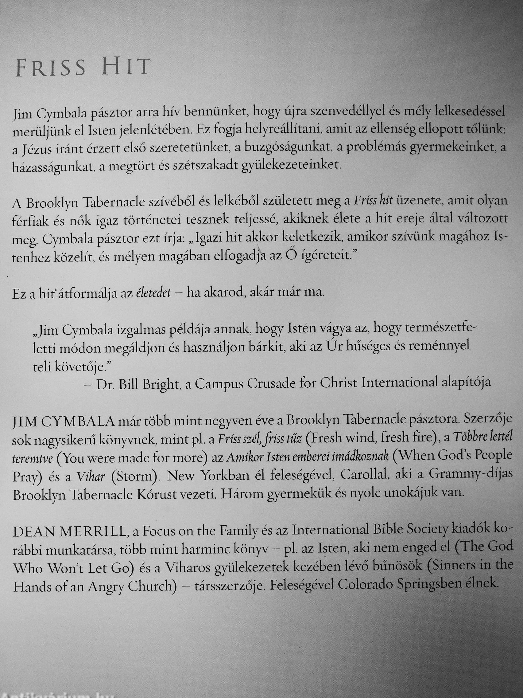 Jim Cymbala pásztor arra hív bennünket, hogy újra szenvedéllyel és mély lelkesedéssel merüljünk el Isten jelenlétében. Ez fogja helyreállítani, amit az ellenség ellopott tőlünk: a Jézus iránt érzett első szeretetünket, a buzgóságunkat, a problémás gyermekeinket, a házasságunkat, a megtört és szétszakadt gyiilekezeteinket.