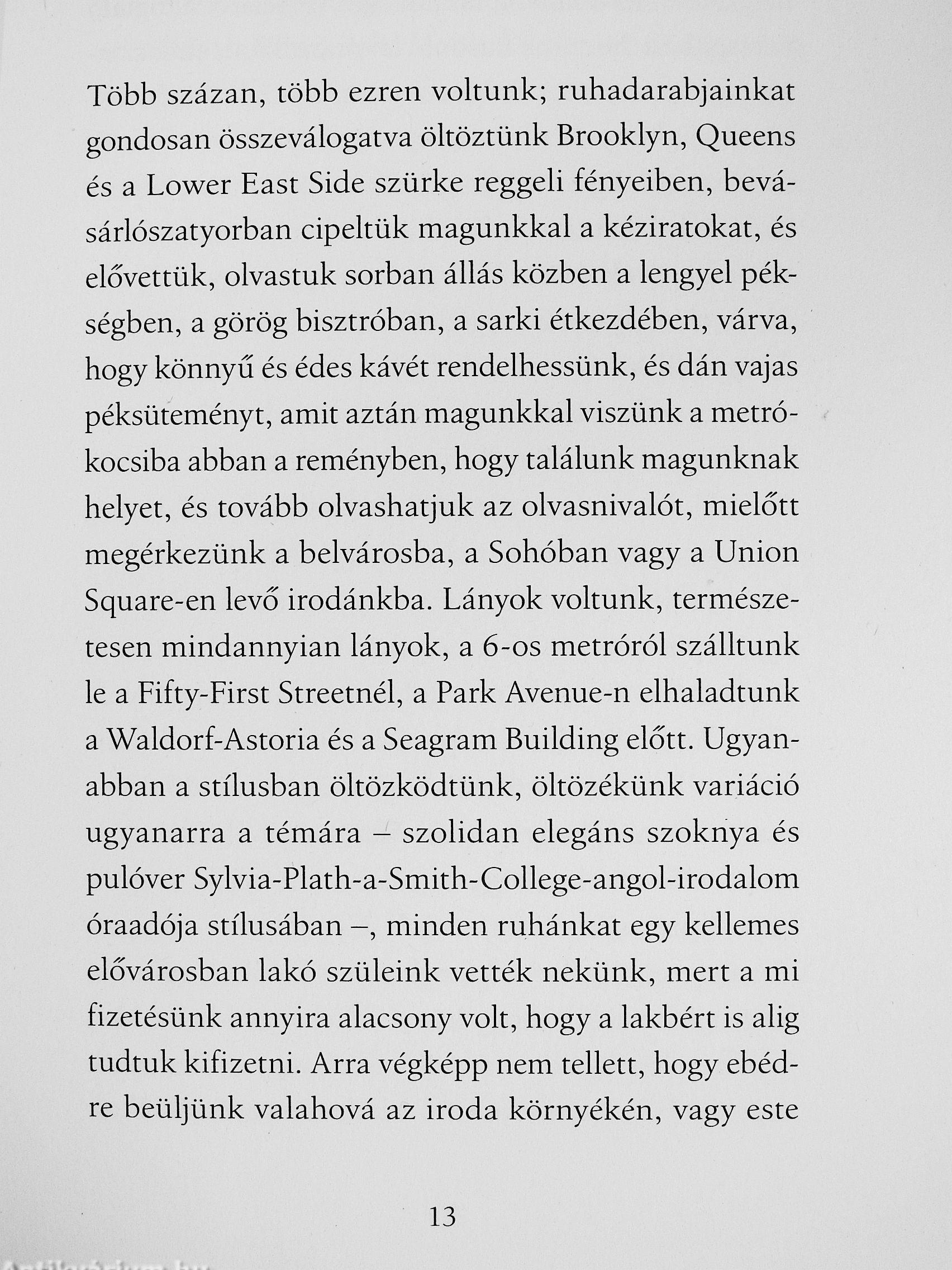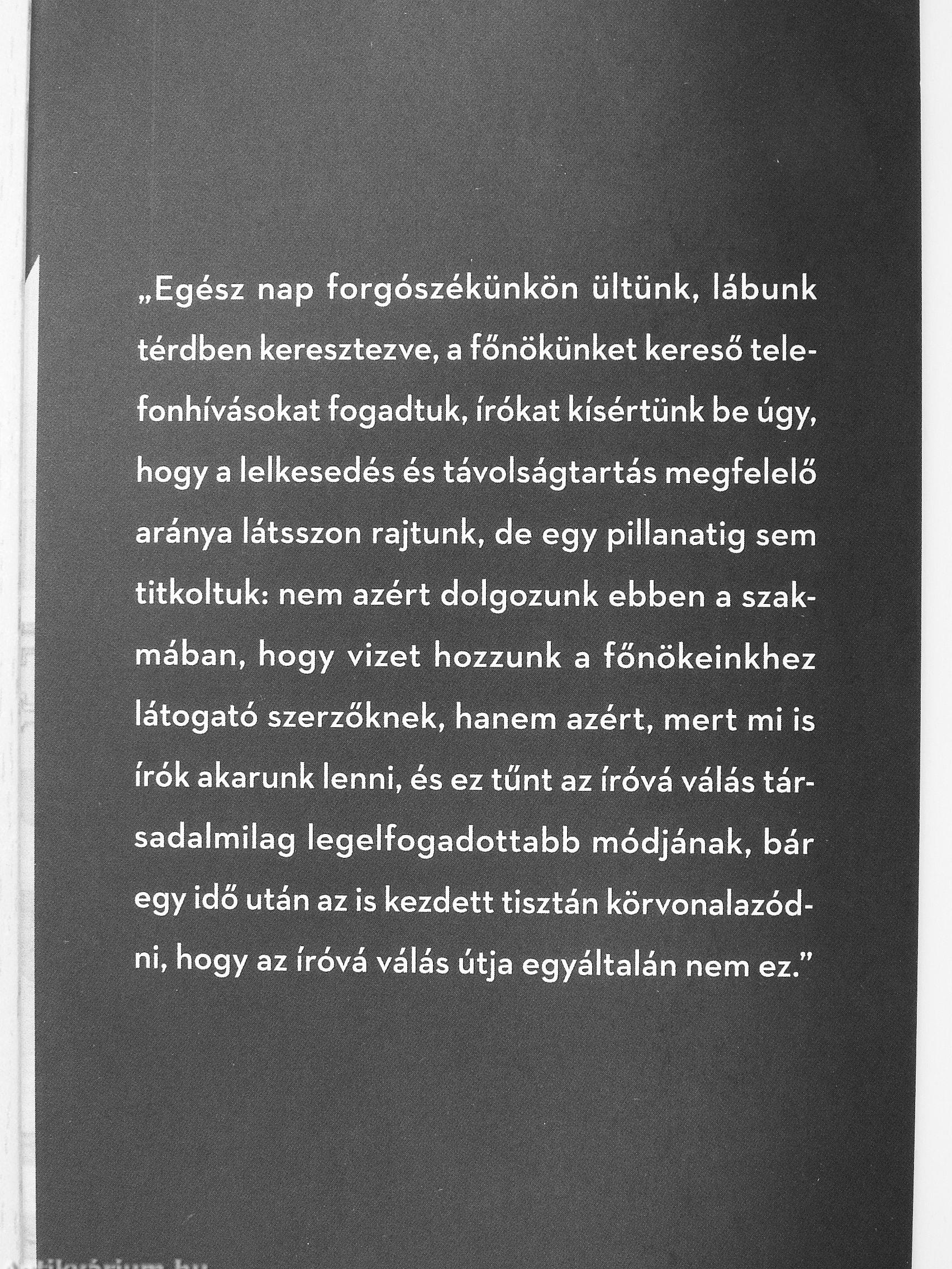 „Egész nap forgószékünkön ültünk, lábunk térdben keresztezve, a főnökünket kereső telefonhívásokat fogadtuk, írókat kísértünk be úgy, hogy a lelkesedés és távolságtartás megfelelő aránya látsszon rajtunk, de egy pillanatig sem titkoltuk: nem azért dolgozunk ebben a szakmában, hogy vizet hozzunk a főnökeinkhez látogató szerzőknek, hanem azért, mert mi is írók akarunk lenni, és ez tűnt az íróvá válás társadalmilag legelfogadottabb módjának, bár egy idő után az is kezdett tisztán körvonalazódni, hogy az íróvá válás útja egyáltalán nem ez."