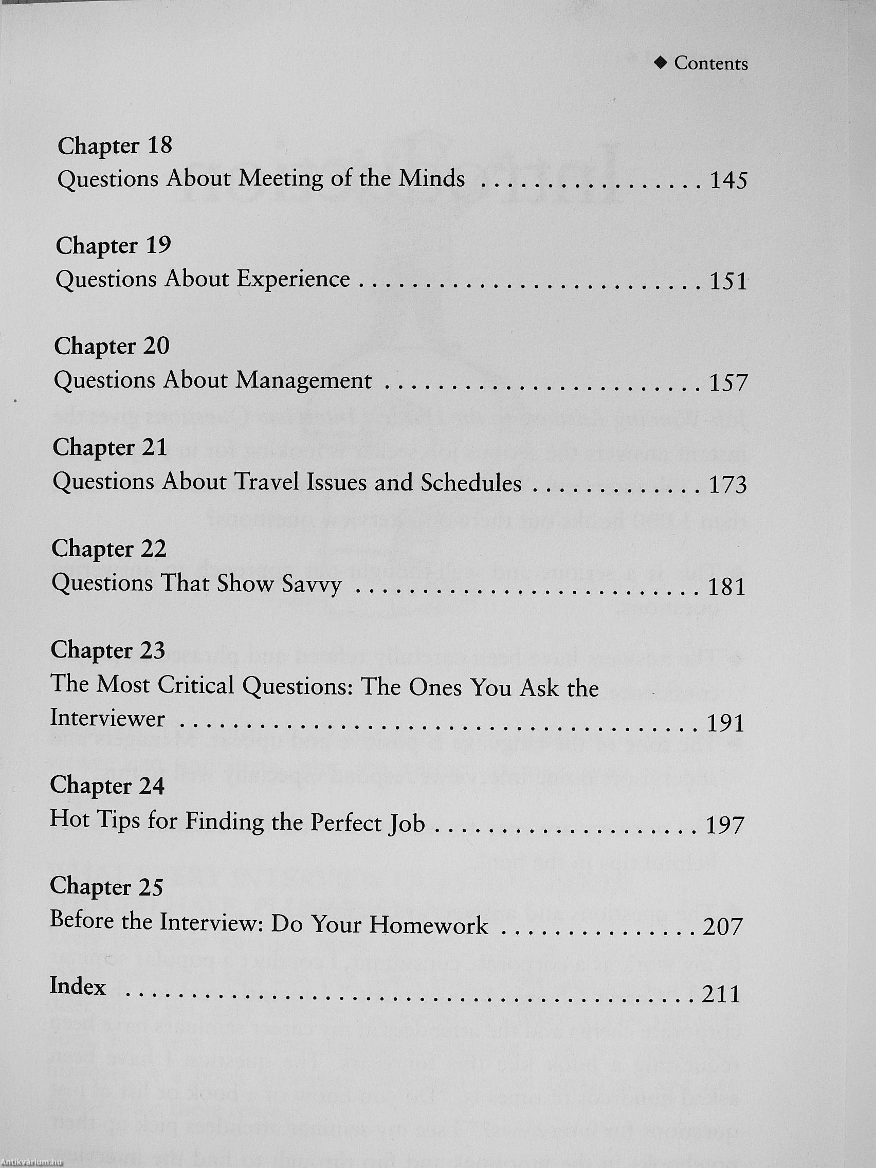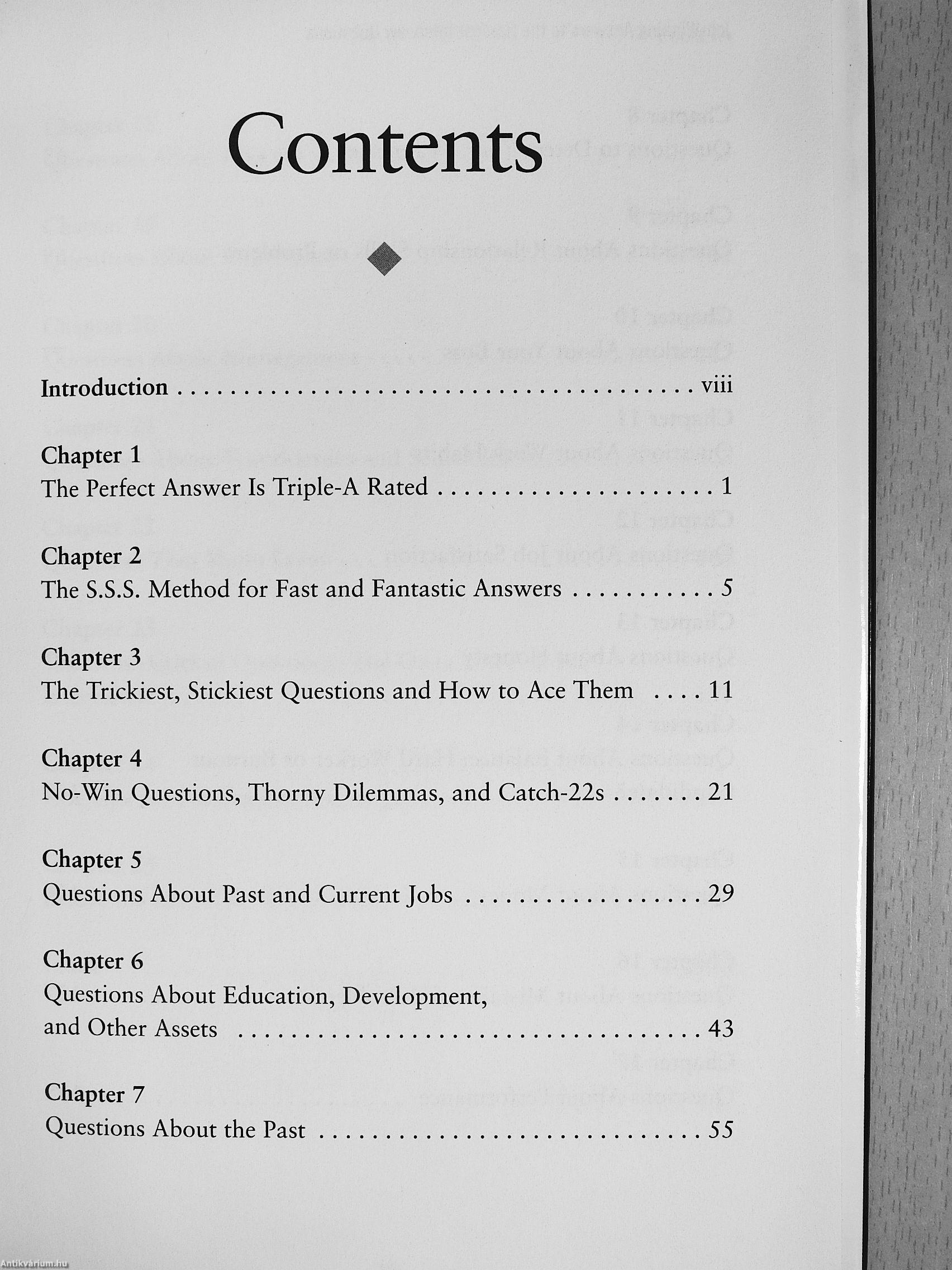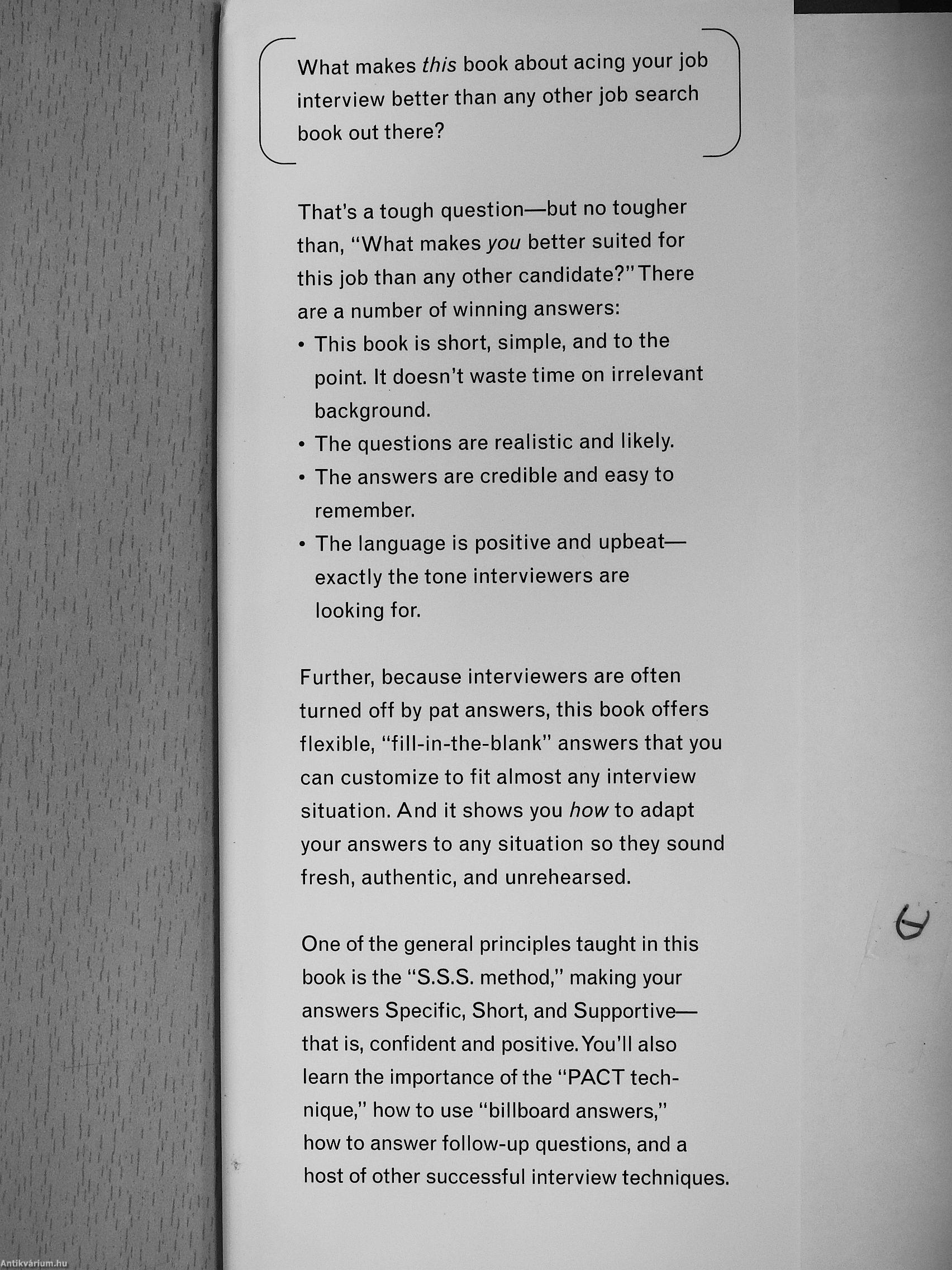 One of the general principles taught in this book is the "S.S.S. method," making your answers Specific, Short, and Supportive— that is, confident and positive.You'll also learn the importance of the "PACT technique," how to use "billboard answers," how to answer follow-up questions, and a host of other successful interview techniques.