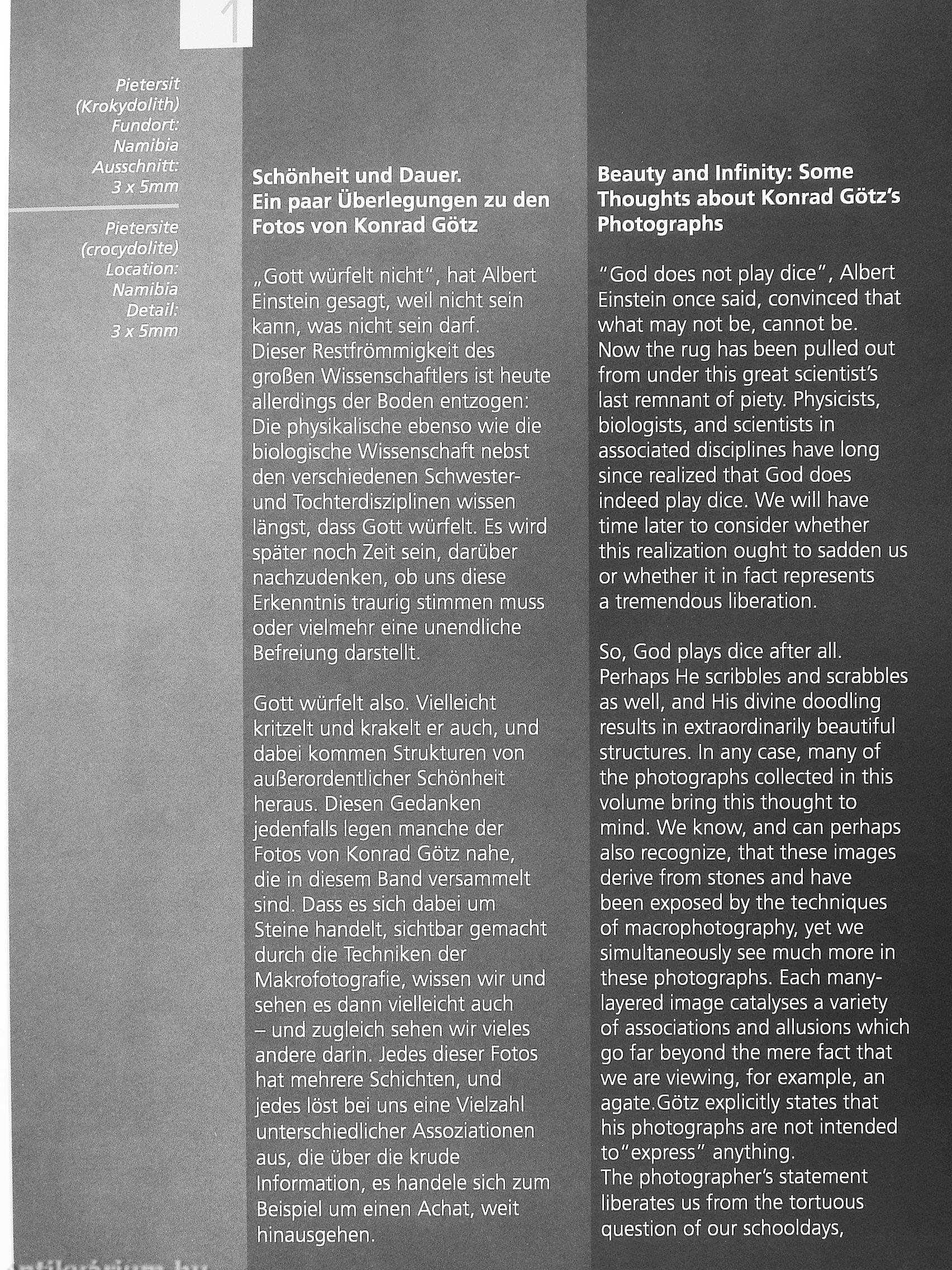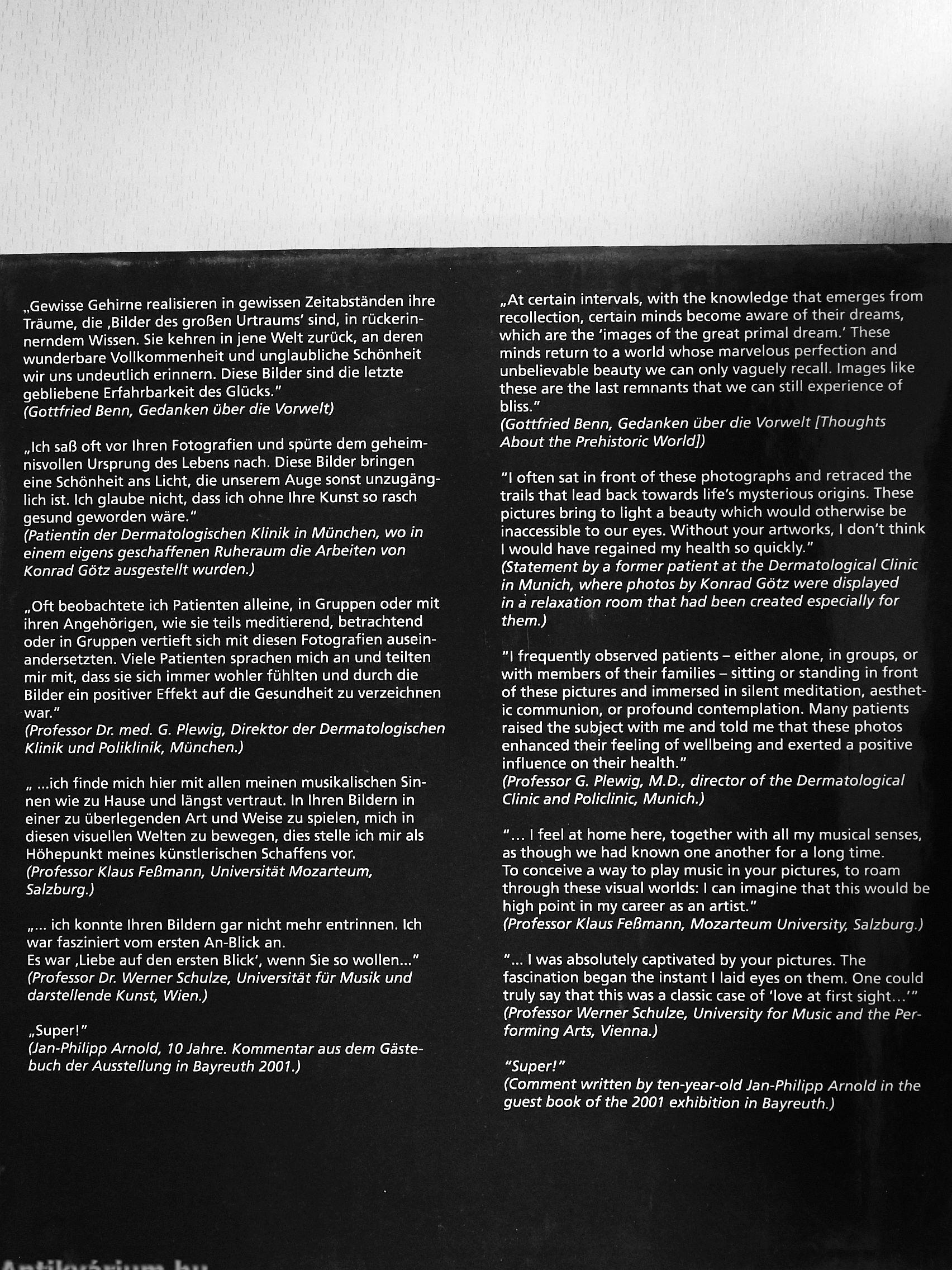 "I often sat in front of these photographs and retraced the trails that lead back towards life's mysterious origins. These pictures bring to light a beauty which would otherwise be inaccessible to our eyes. Without your artworks. I don't think I would have regained my health so quickly." (Statement by a former patient at the Dermatological Clinic in Munich, where photos by Konrad Götz were displayed in a relaxation room that had been created especially for them.)
