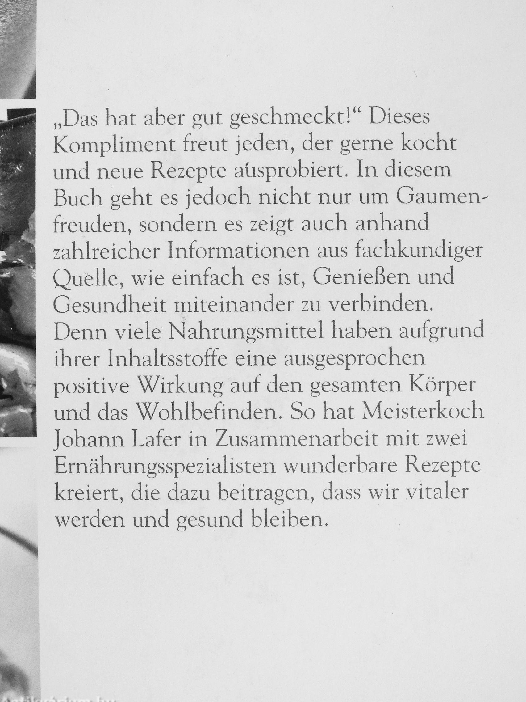„Das hat aber gut geschmeckt!" Dieses Kompliment freut jeden, der gerne kocht und neue Rezepte ausprobiert. In diesem Buch geht es jedoch nicht nur um Gaumenfreuden, sondern es zeigt auch anhanc zahlreicher Informationen aus fachkundiger Quelle, wie einfach es ist. Genießen und Gesundheit miteinander zu verbinden. Denn viele Nahrungsmittel haben aufgrunc ihrer Inhaltsstoffe eine ausgesprochen positive Wirkung auf den gesamten Körper und das Wohlbefinden. So hat Meisterkoch ohann Lafer in Zusammenarbeit mit zwei Ernährungsspezialisten wunderbare Rezepte kreiert, die dazu beitragen, dass wir vitaler werden und gesund bleiben.