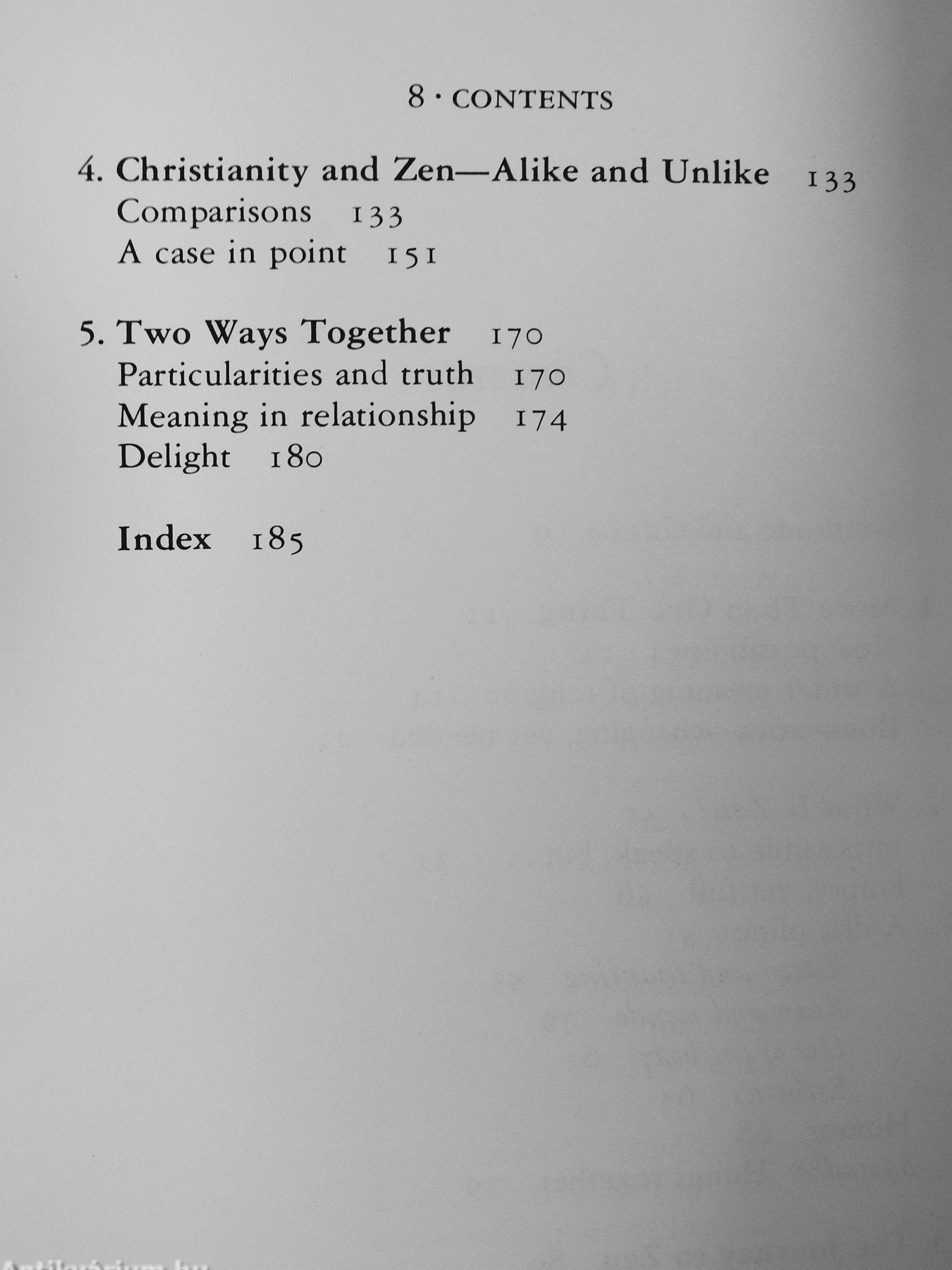 "My quest is being fulfilled through the particularities and relationship of Zen and Christianity. Like two prisms, they have refracted different light on the meaning of personal value and relationship to others. Different though Zen and Christianity may be, the double illumination has not produced for me contrasting glares or an inharmonious spectrum. As! try to understand how the light of one relates to the light of the other in me, I discover something deeper, namely, that I need the brightness of each, whatever the differences.