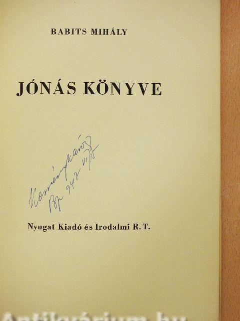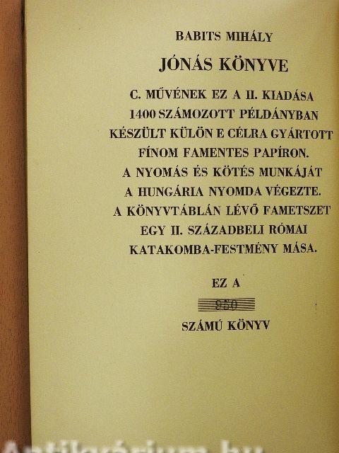 | Megjegyzés: | Babits Mihály Jónás könyve c. művének ez a második kiadása. 1400 számozott példányban készült külön e célra gyártott finom famentes papíron. A nyomás és kötés munkáját a Hungária Nyomda végezte. A könyvtáblán lévő fametszet egy II. századbeli római katakomba-festmény mása. Számozott példány. |