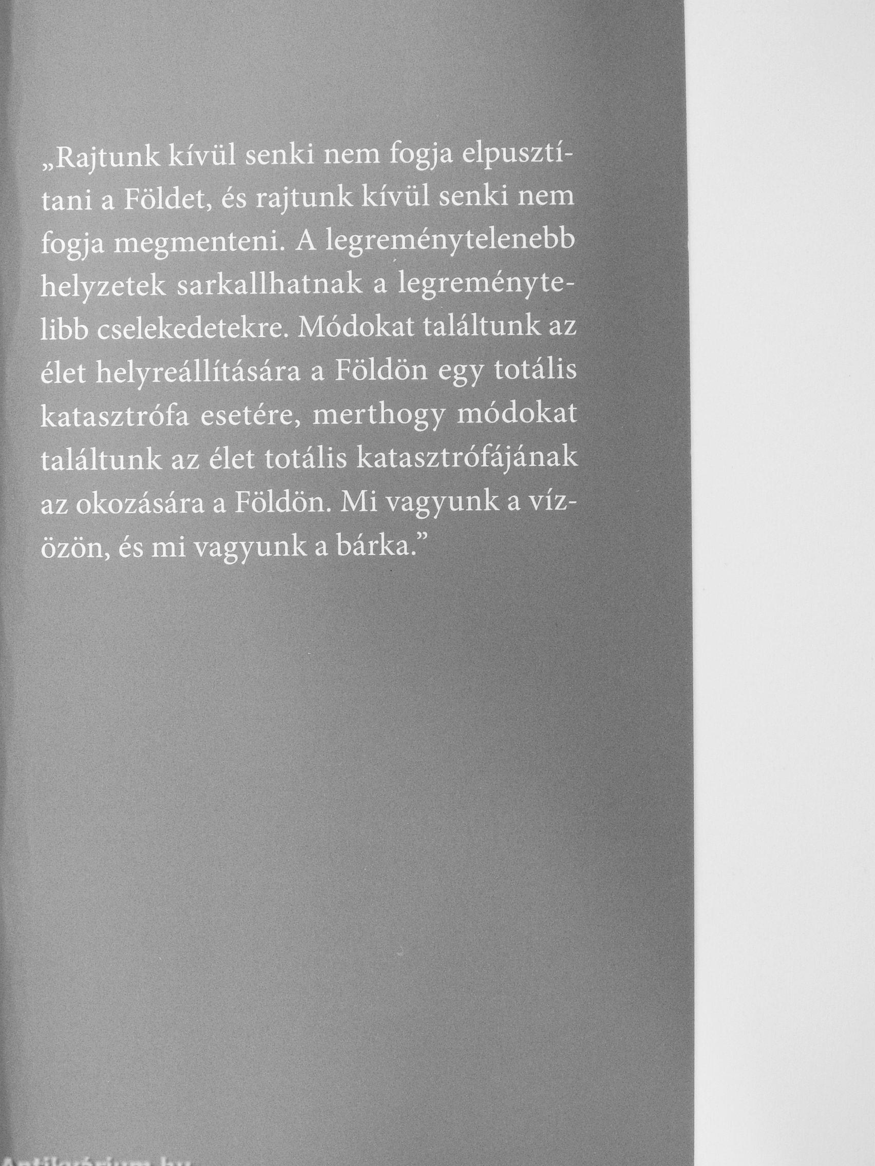 „Rajtunk kívül senki nem fogja elpusztítani a Földet, és rajtunk kívül senki nem fogja megmenteni. A legreménytelenebb helyzetek sarkallhatnak a legreményte-libb cselekedetekre. Módokat találtunk az élet helyreállítására a Földön egy totális katasztrófa esetére, merthogy módokat találtunk az élet totális katasztrófájának az okozására a Földön. Mi vagyunk a vízözön, és mi vagyunk a bárka."