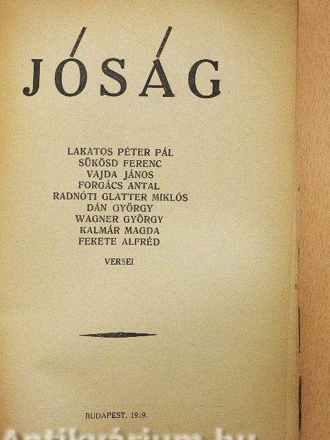 Akik ebben a kötetben összeverődtünk: különböző világnézetű, különböző korú, ismertebb és ismeretlenebb nevü emberek, akik emberek akarnak maradni a háború utáni nyomorúságban és embertelenségben is s akik ugy vélnek magyarságuk mellett is hitet tenni, ha azt, ami összehozta őket s amit könyvük címéül is választottak: Jóság, dalolják és énekelik.