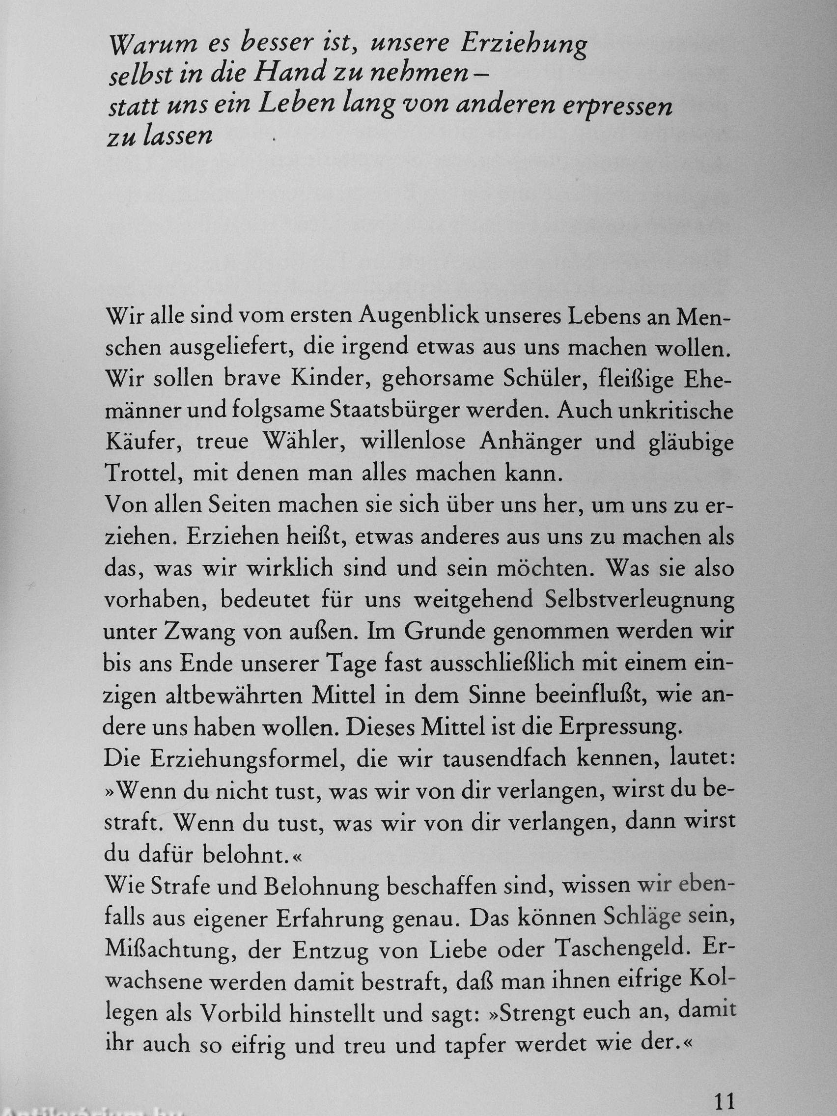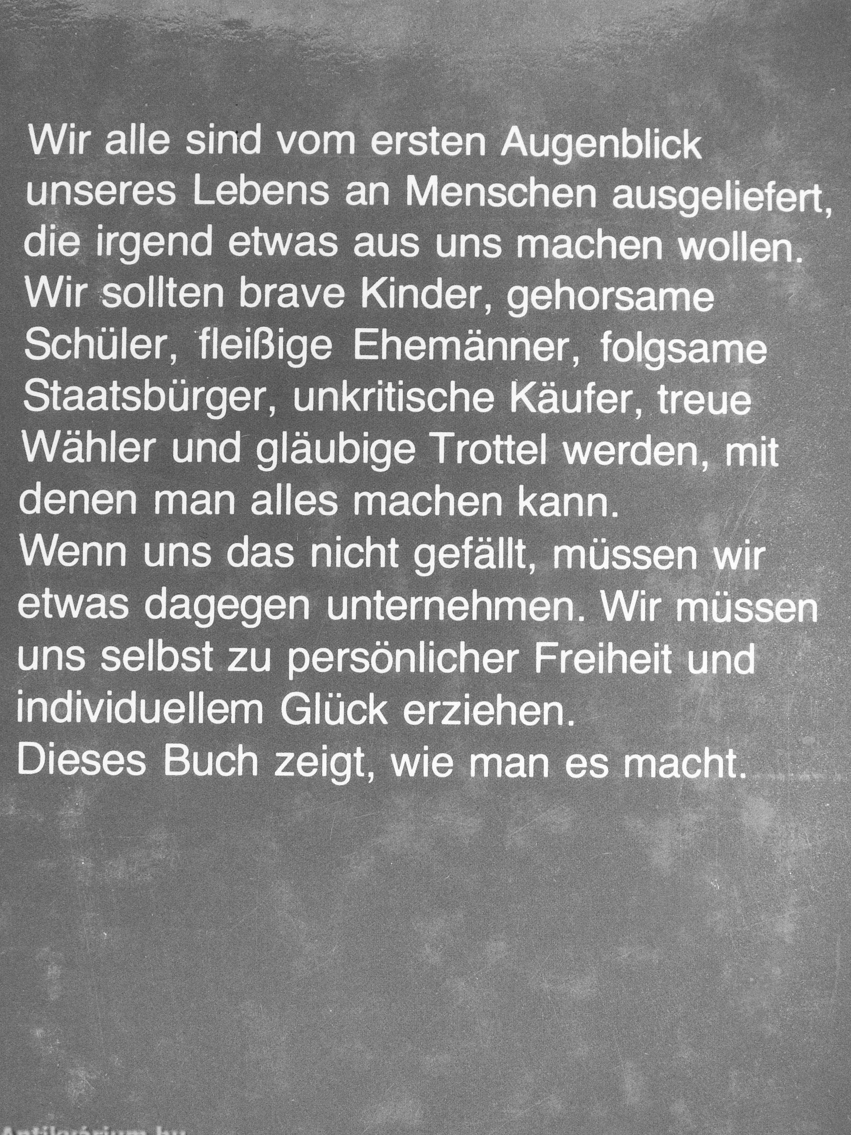 Wir alle sind vom ersten Augenblick unseres Lebens an Menschen ausgeliefert, die irgend etwas aus uns machen wollen. Wir sollten brave Kinder, gehorsame Schüler, fleißige Ehemänner, folgsame Staatsbürger, unkritische Käufer, treue Wähler und gläubige Trottel werden, mit denen man alles machen kann. Wenn uns das nicht gefällt, müssen wir etwas dagegen unternehmen. Wir müssen uns selbst zu persönlicher Freiheit und individuellem Glück erziehen. Dieses Buch zeigt, wie man es macht.