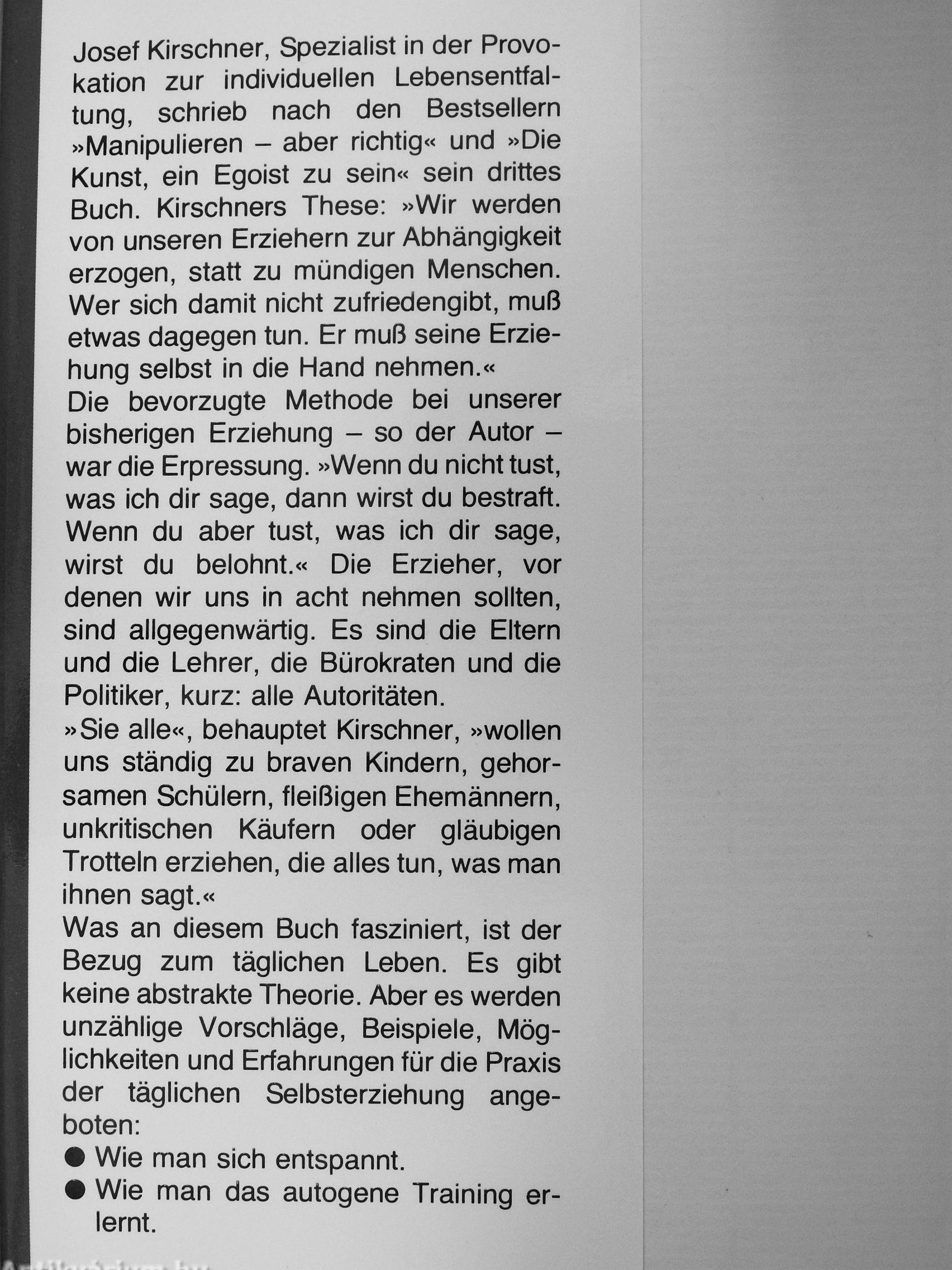 Josef Kirschner, Spezialist in der Provokation zur individuellen Lebensentfaltung, schrieb nach den Bestsellern »Manipulieren - aber richtig« und »Die Kunst, ein Egoist zu sein« sein drittes Buch. Kirschners These: »Wir werden von unseren Erziehern zur Abhängigkeit erzogen, statt zu mündigen Menschen. Wer sich damit nicht zufriedengibt, muß etwas dagegen tun. Er muß seine Erziehung selbst in die Hand nehmen.« Die bevorzugte Methode bei unserer bisherigen Erziehung - so der Autor -war die Erpressung. »Wenn du nicht tust, was ich dir sage, dann wirst du bestraft. Wenn du aber tust, was ich dir sage, wirst du belohnt.« Die Erzieher, vor denen wir uns in acht nehmen sollten, sind allgegenwärtig. Es sind die Eltern und die Lehrer, die Bürokraten und die Politiker, kurz: alle Autoritäten. »Sie alle«, behauptet Kirschner, »wollen uns ständig zu braven Kindern, gehorsamen Schülern, fleißigen Ehemännern, unkritischen Käufern oder gläubigen Trotteln erziehen, die alles tun, was man ihnen sagt.«
