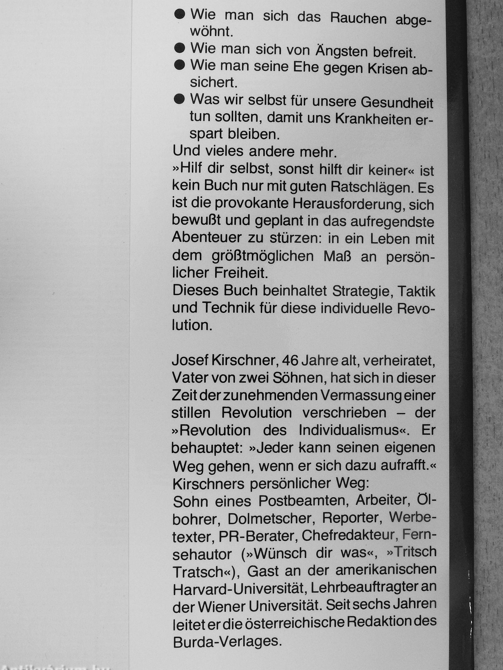 Josef Kirschner, 46 Jahre alt, verheiratet, Vater von zwei Söhnen, hat sich in dieser Zeit derzunehmenden Vermassung einer stillen Revolution verschrieben - der »Revolution des Individualismus«. Er behauptet: »Jeder kann seinen eigenen Weg gehen, wenn er sich dazu aufrafft.« Kirschners persönlicher Weg: Sohn eines Postbeamten, Arbeiter, öl-bohrer, Dolmetscher, Reporter, Werbetexter, PR-Berater, Chefredakteur, Fernsehautor (»Wünsch dir was«, »Tritsch Tratsch«), Gast an der amerikanischen Harvard-Universität, Lehrbeauftragter an der Wiener Universität. Seit sechs Jahren leitet er die österreichische Redaktion des Burda-Verlages.