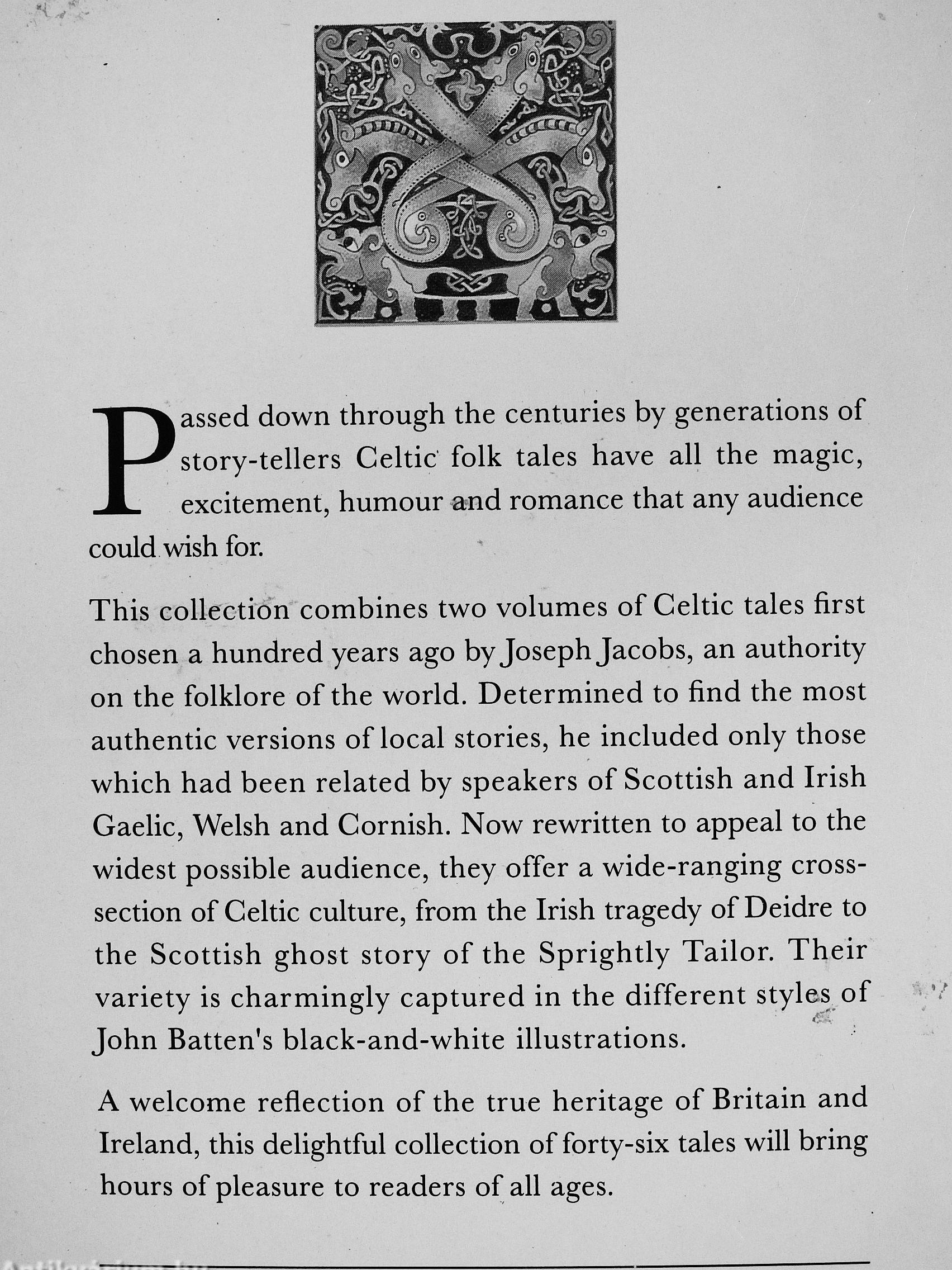 This collection combines two volumes of Celtic tales first chosen a hundred years ago by Joseph Jacobs, an authority on the folklore of the world. Determined to find the most authentic versions of local stories, he included only those which had been related by speakers of Scottish and Irish Gaelic, Welsh and Cornish. Now rewritten to appeal to the widest possible audience, they offer a wide-ranging cross-section of Celdc culture, from the Irish tragedy of Deidre to the Scottish ghost story of the Sprightly Tailor. Their variety is charmingly captured in the different styles of John Batten's black-and-white illustrations.