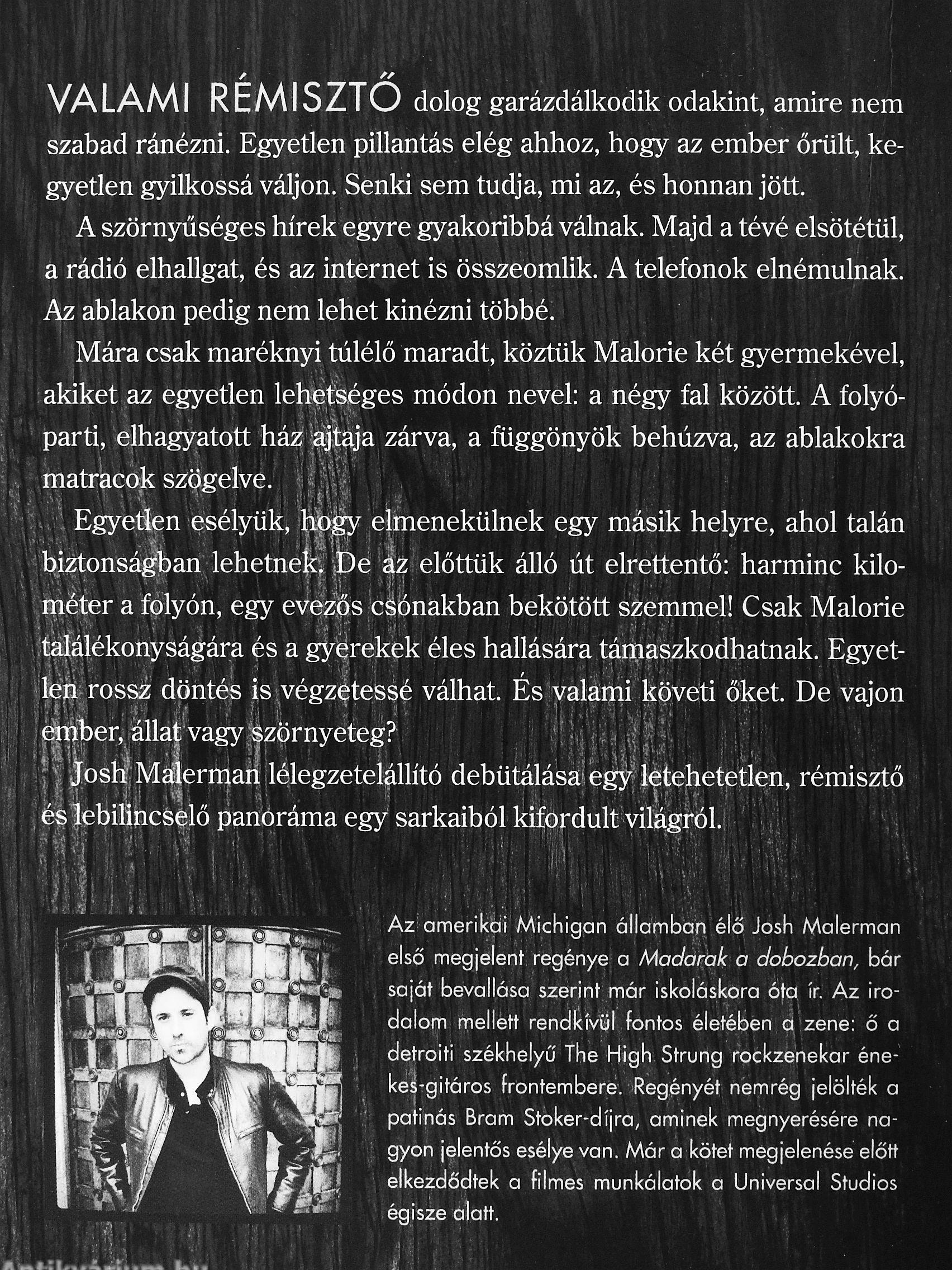Mára csak maréknyi túlélő maradt, köztük Malorie két gyermekével, akiket az egyetlen lehetséges módon nevel: a négy fal között. A folyóparti, elhagyatott ház ajtaja zárva, a függönyök behúzva, az ablakokra matracok szögelve. v