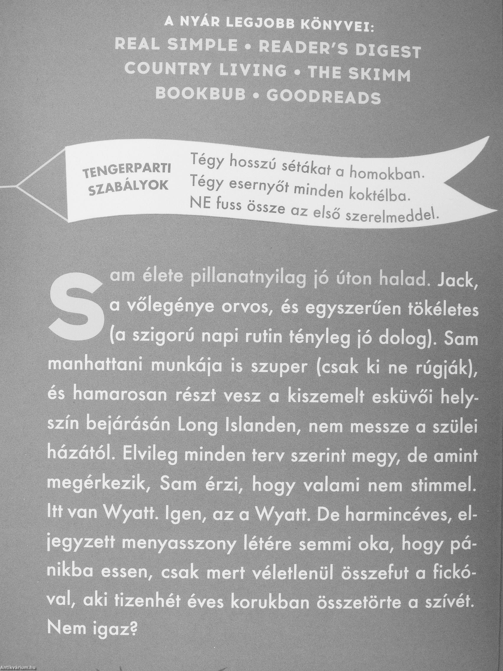 am élete pillanatnyilag jó úton halad. Jack, a vőlegénye orvos, és egyszerűen tökéletes (a szigorú napi rutin tényleg jó dolog). Sam manhattani munkája is szuper (csak ki ne rúgják), és hamarosan részt vesz a kiszemelt esküvői helyszín bejárásán Long Islanden, nem messze a szülei házától. Elvileg minden terv szerint megy, de amint megérkezik. Som érzi, hogy valami nem stimmel. Itt van Wyatt. Igen, az a Wyatt. De harmincéves, el-jegyzett menyasszony létére semmi oka, hogy pánikba essen, csak mert véletlenül összefut a fickóval, aki tizenhét éves korukban összetörte a szívét. Nem igaz?