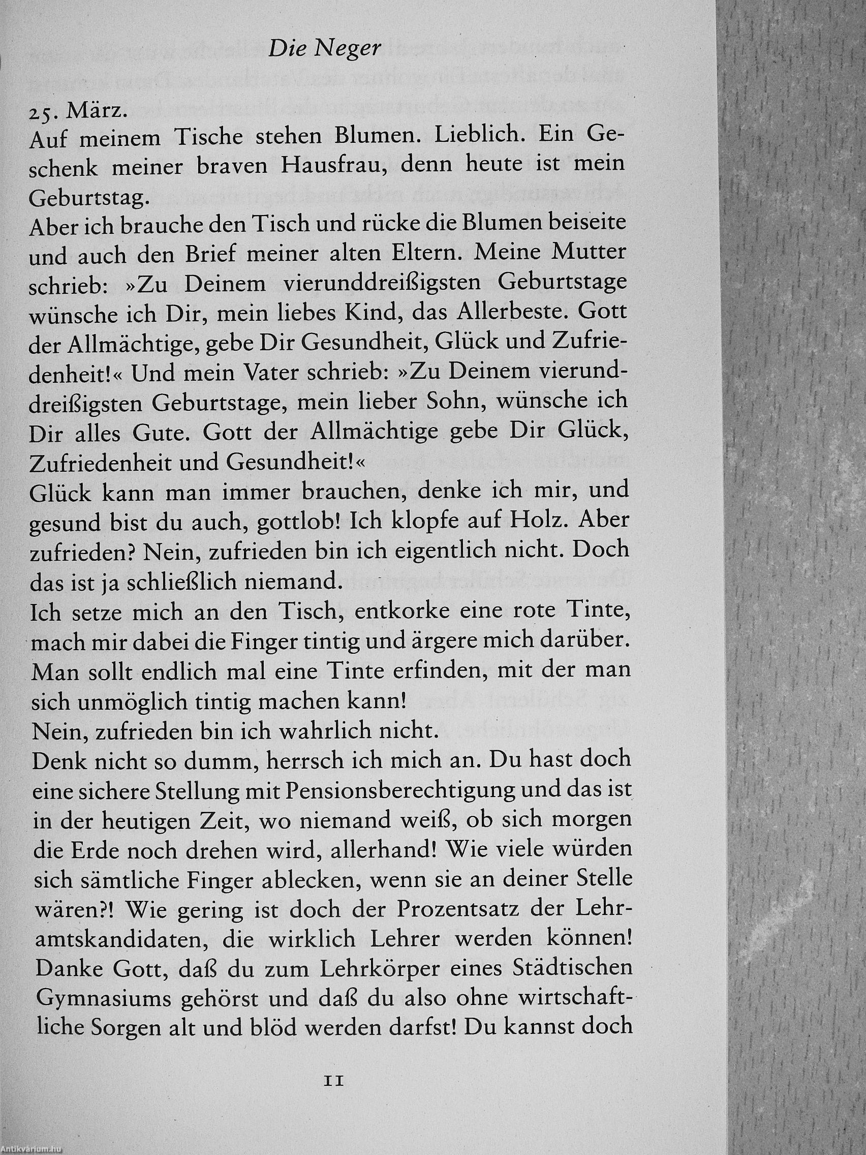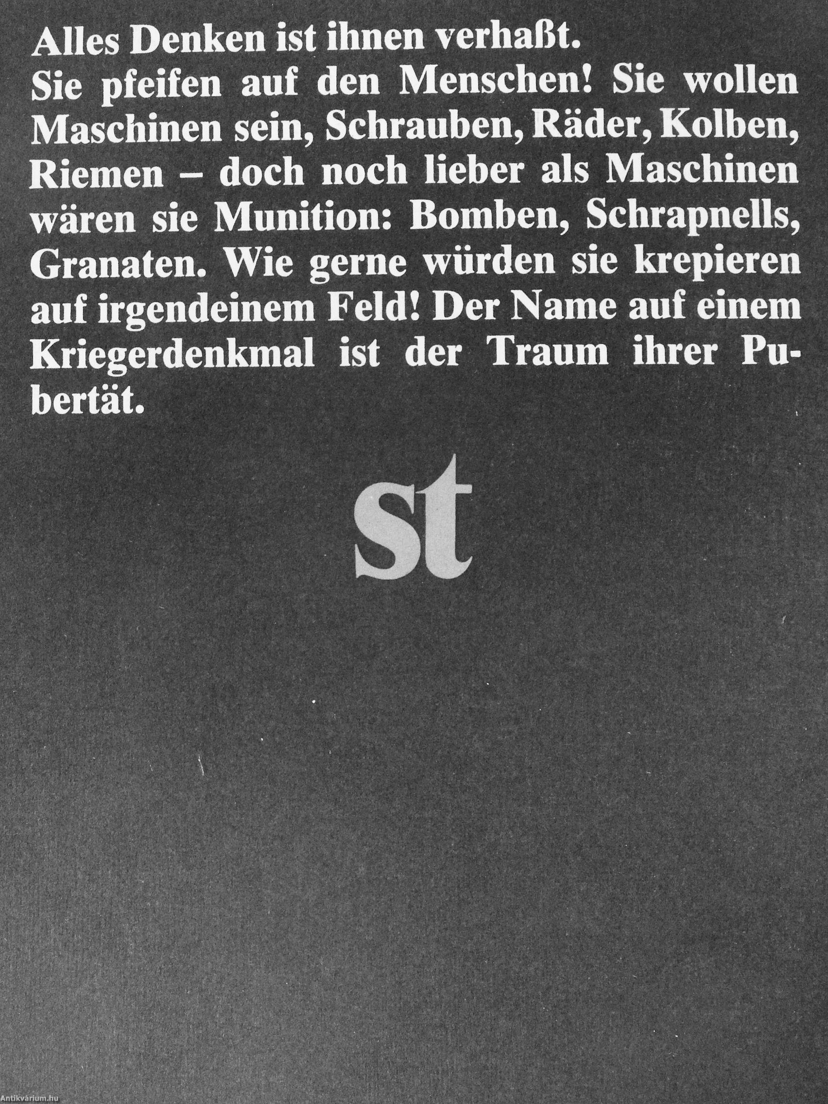 Alles Denken ist ihnen verhaßt. Sie pfeifen auf den Menschen! Sie wollen Maschinen sein, Schrauben, Räder, Kolben, Riemen - doch noch lieber als Maschinen wären sie Munition: Bomben, Schrapnells, Granaten. Wie gerne würden sie krepieren auf irgendeinem Feld! Der Name auf einem Kriegerdenkmal ist der Traum ihrer Pubertät.
