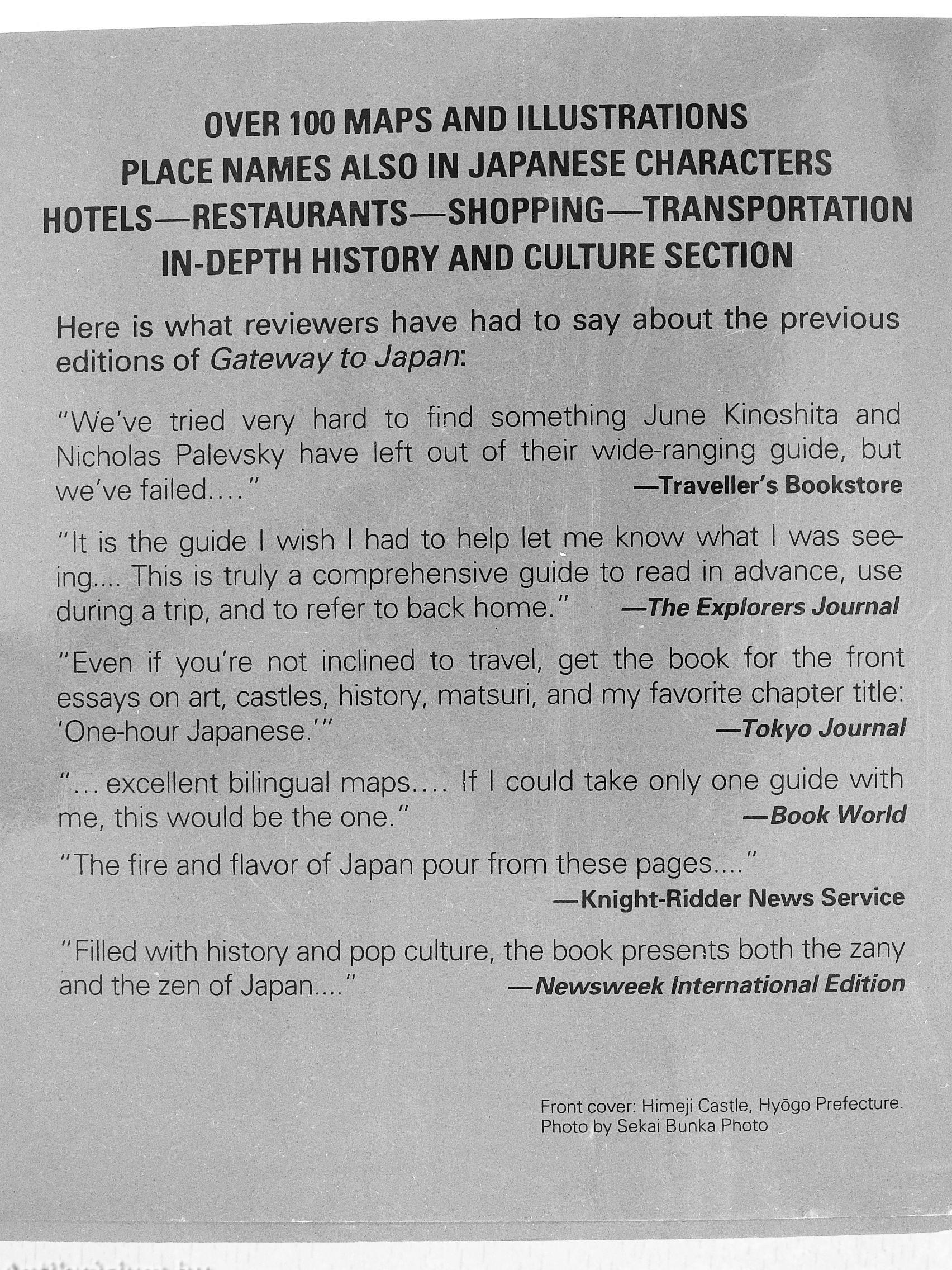 "Even if you're not inclined to travel, get the book for the front essays on art, castles, history, matsuri, and my favorite chapter title: 'One-hour Japanese.'" —Tokyo Journal