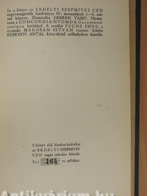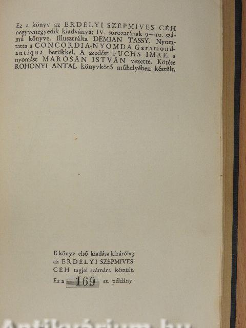 | Megjegyzés: | Sorszámozott, első kiadás. "Ez a könyv az Erdélyi Szépmíves Céh negyvenegyedik kiadványa; IV. sorozatának 7-8., 9-10. számú könyve. Illusztrálta Demian Tassy. Nyomtatta a Concordia-nyomda Garamond-antiqua betűkkel. A szedést Fuchs Imre, a nyomást Marosán István vezette. Kötése Rohonyi Antal könyvkötő műhelyében készült." E könyv első kiadása kizárólag az Erdélyi Szépmives Céh tagjai számára készült. |