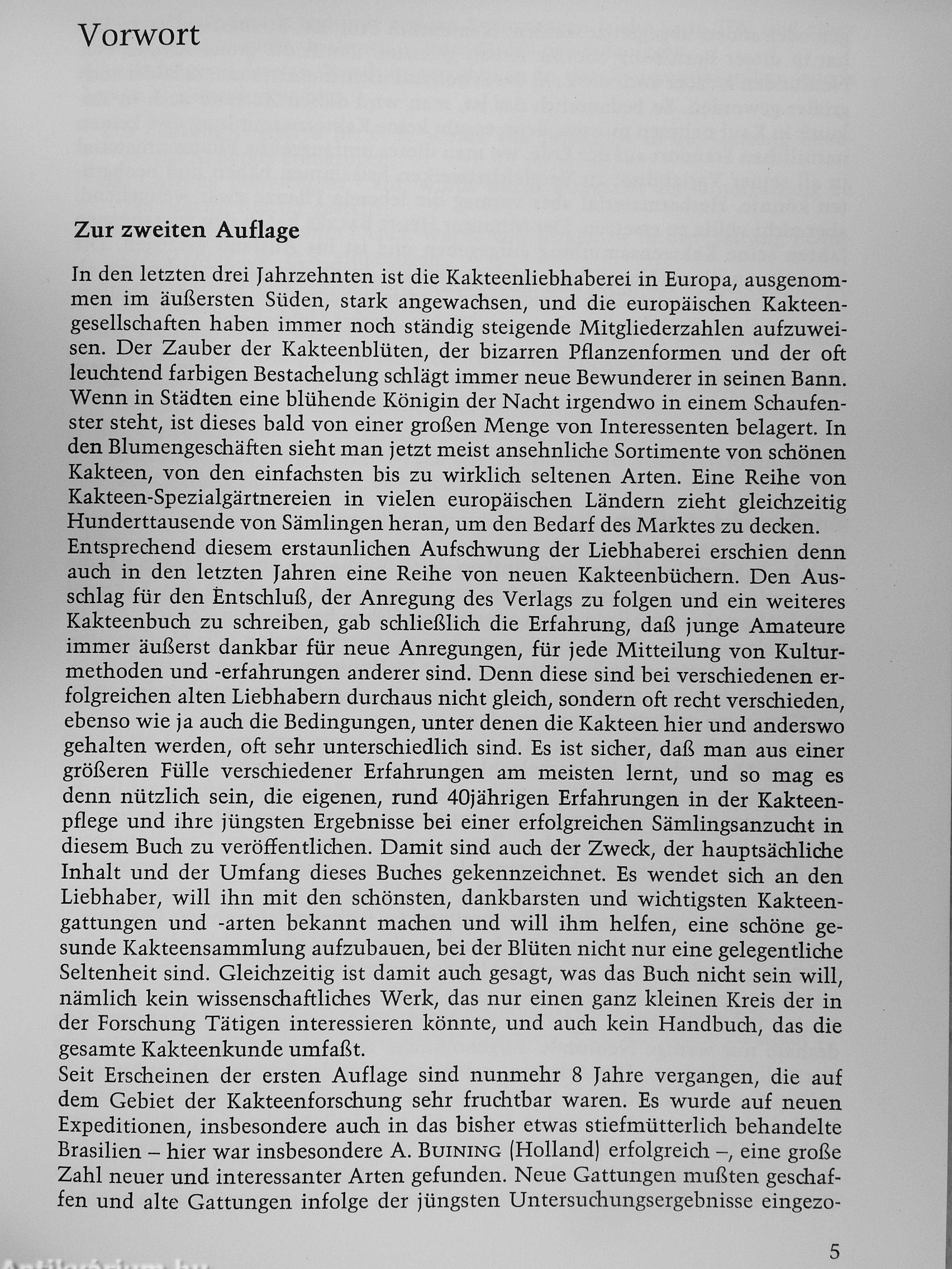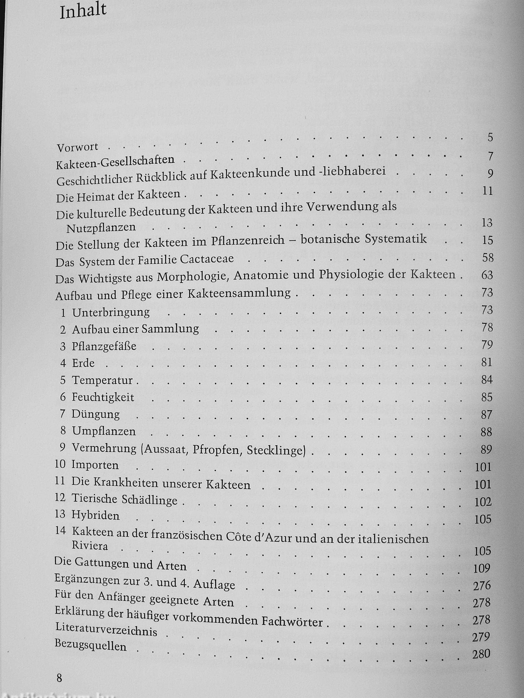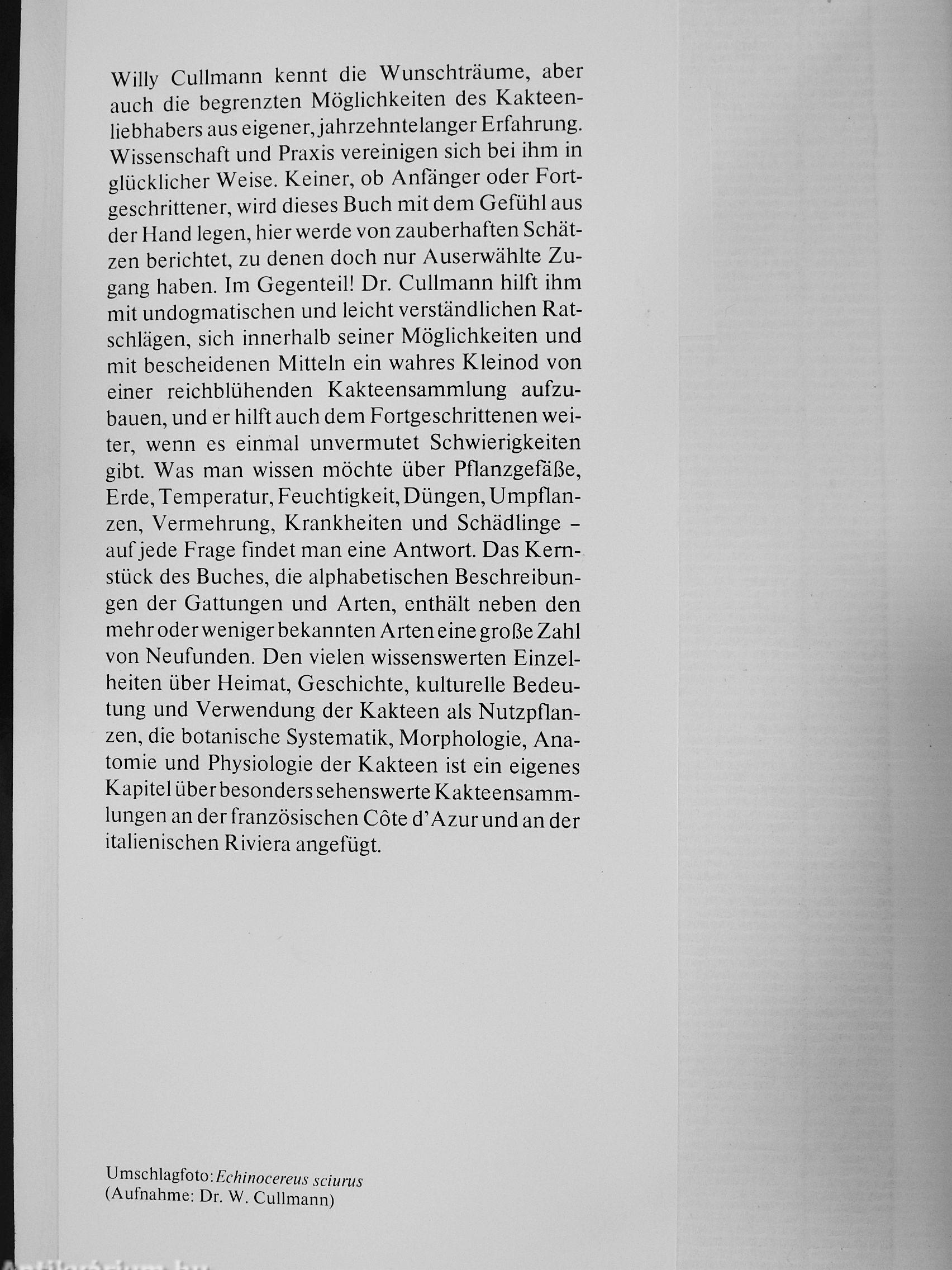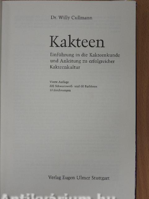 Willy Cullmann kennt die Wunschträume, aber auch die begrenzten Möglichkeiten des Kakteenliebhabers aus eigener, jahrzehntelanger Erfahrung. Wissenschaft und Praxis vereinigen sich bei ihm in glücklicher Weise. Keiner, ob Anfänger oder Fortgeschrittener, wird dieses Buch mit dem Gefühl aus der Hand legen, hier werde von zauberhaften Schätzen berichtet, zu denen doch nur Auserwählte Zugang haben. Im Gegenteil! Dr. Cullmann hilft ihm mit undogmatischen und leicht verständlichen Ratschlägen, sich innerhalb seiner Möglichkeiten und mit bescheidenen Mitteln ein wahres Kleinod von einer reichblühenden Kakteensammlung aufzubauen, und er hilft auch dem Fortgeschrittenen weiter, wenn es einmal unvermutet Schwierigkeiten gibt. Was man wissen möchte über Pflanzgefäße, Erde, Temperatur, Feuchtigkeit, Düngen, Umpflanzen, Vermehrung, Krankheiten und Schädlinge -auf jede Frage findet man eine Antwort. Das Kernstück des Buches, die alphabetischen Beschreibungen der Gattungen und Arten, enthält neben den mehr oder wenigerbekanntenArteneinegroße Zahl von Neufunden. Den vielen wissenswerten Einzelheiten über Heimat, Geschichte, kulturelle Bedeutung und Verwendung der Kakteen als Nutzpflanzen, die botanische Systematik, Morphologie, Anatomie und Physiologie der Kakteen ist ein eigenes Kapitel überbesonders sehenswerte Kakteensammlungen an der französischen Côte d'Azur und an der italienischen Riviera angefügt.