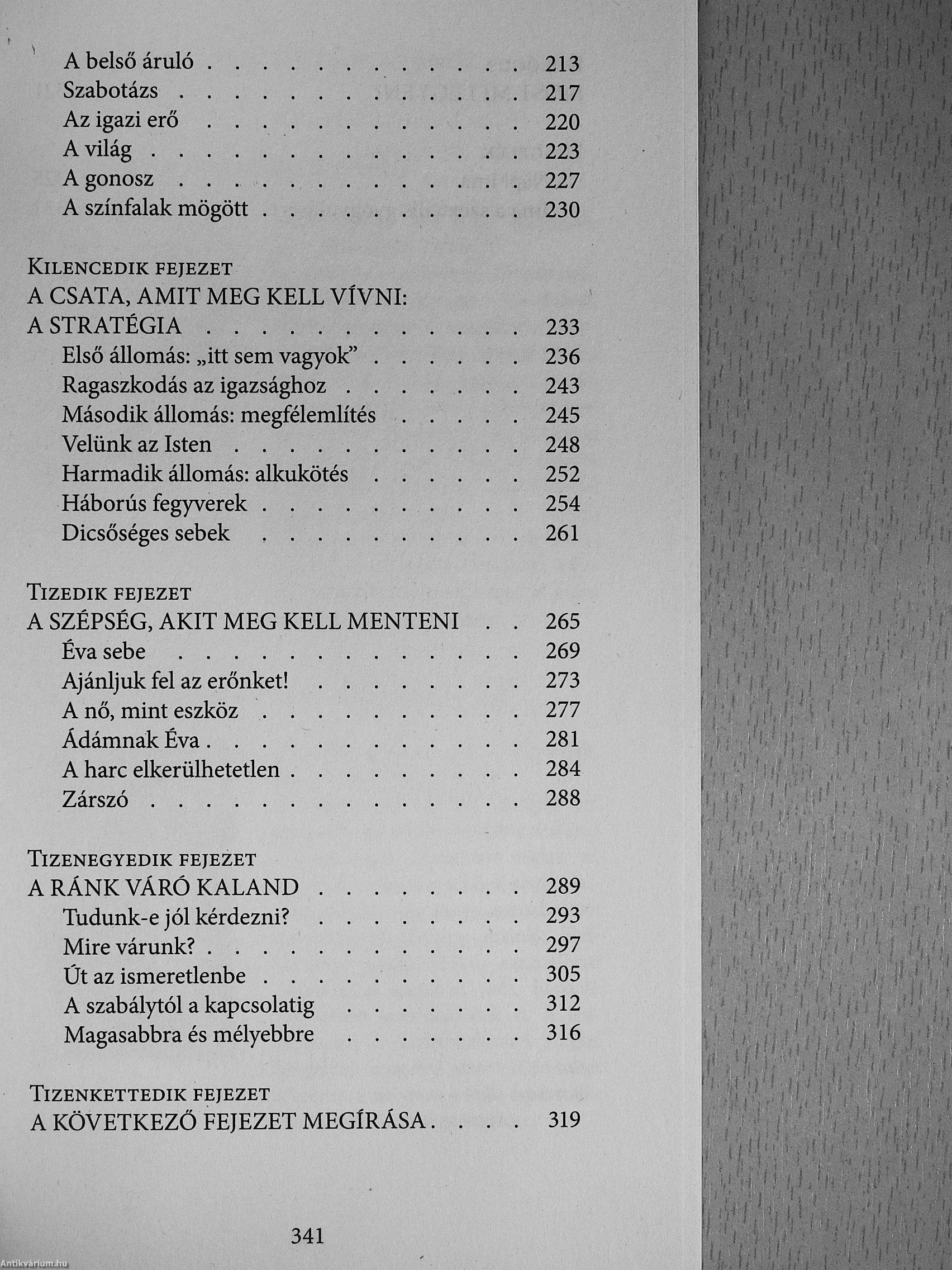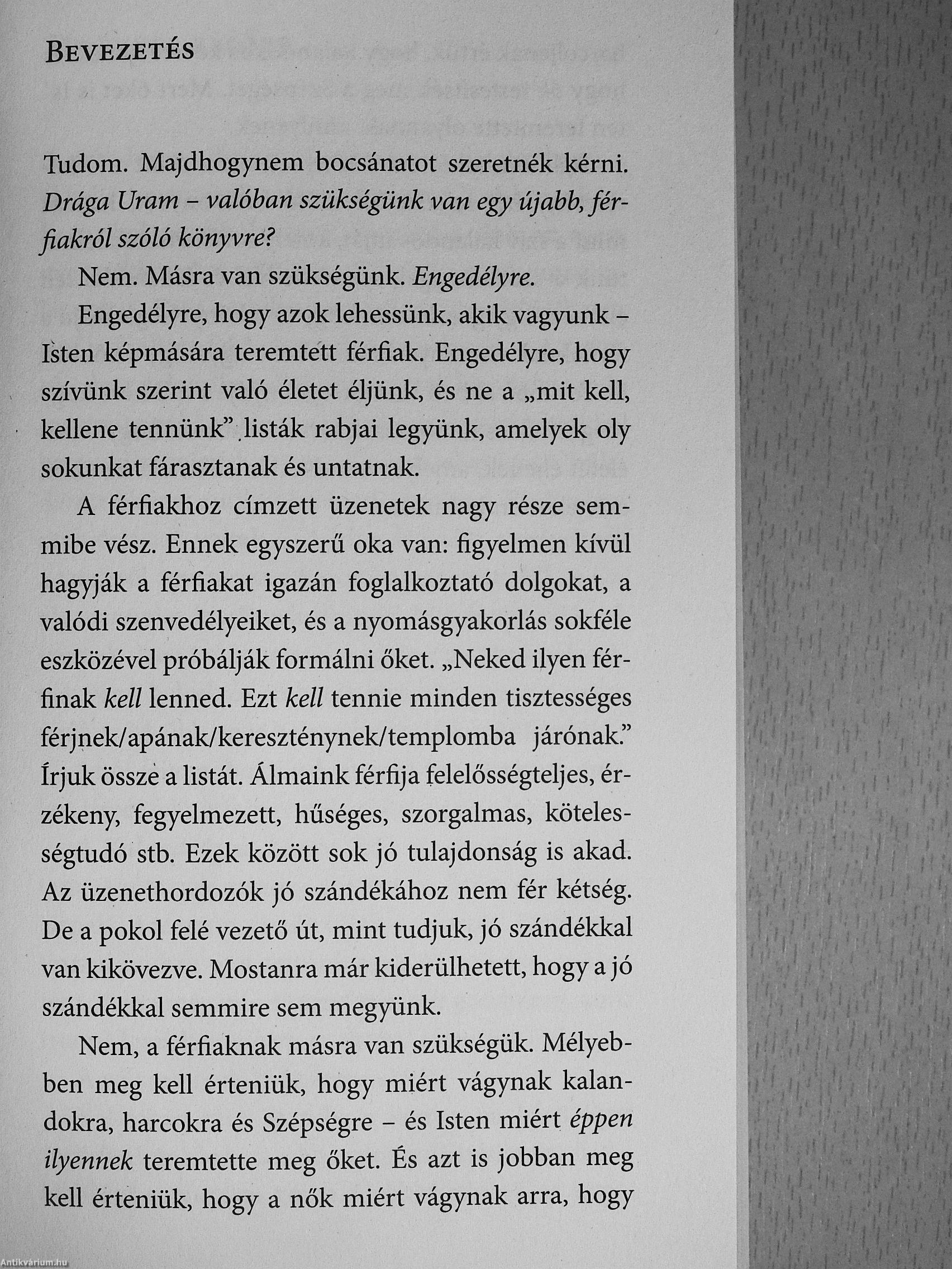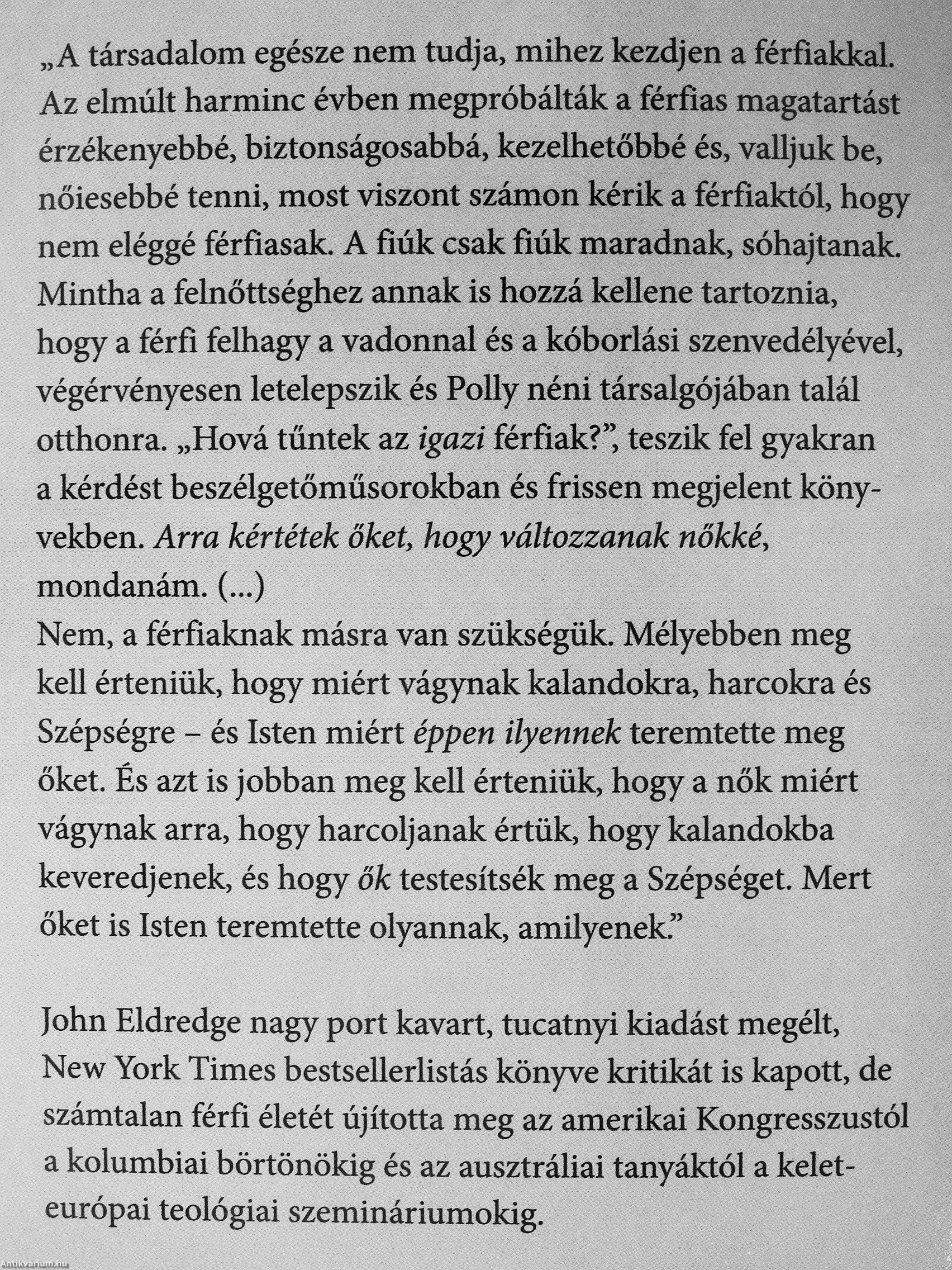 Nem, a férfiaknak másra van szükségük. Mélyebben meg kell érteniük, hogy miért vágynak kalandokra, harcokra és Szépségre - és Isten miért éppen ilyennek teremtette meg őket. És azt is jobban meg kell érteniük, hogy a nők miért vágynak arra, hogy harcoljanak értük, hogy kalandokba keveredjenek, és hogy ők testesítsék meg a Szépséget. Mert őket is Isten teremtette olyannak, amilyenek."