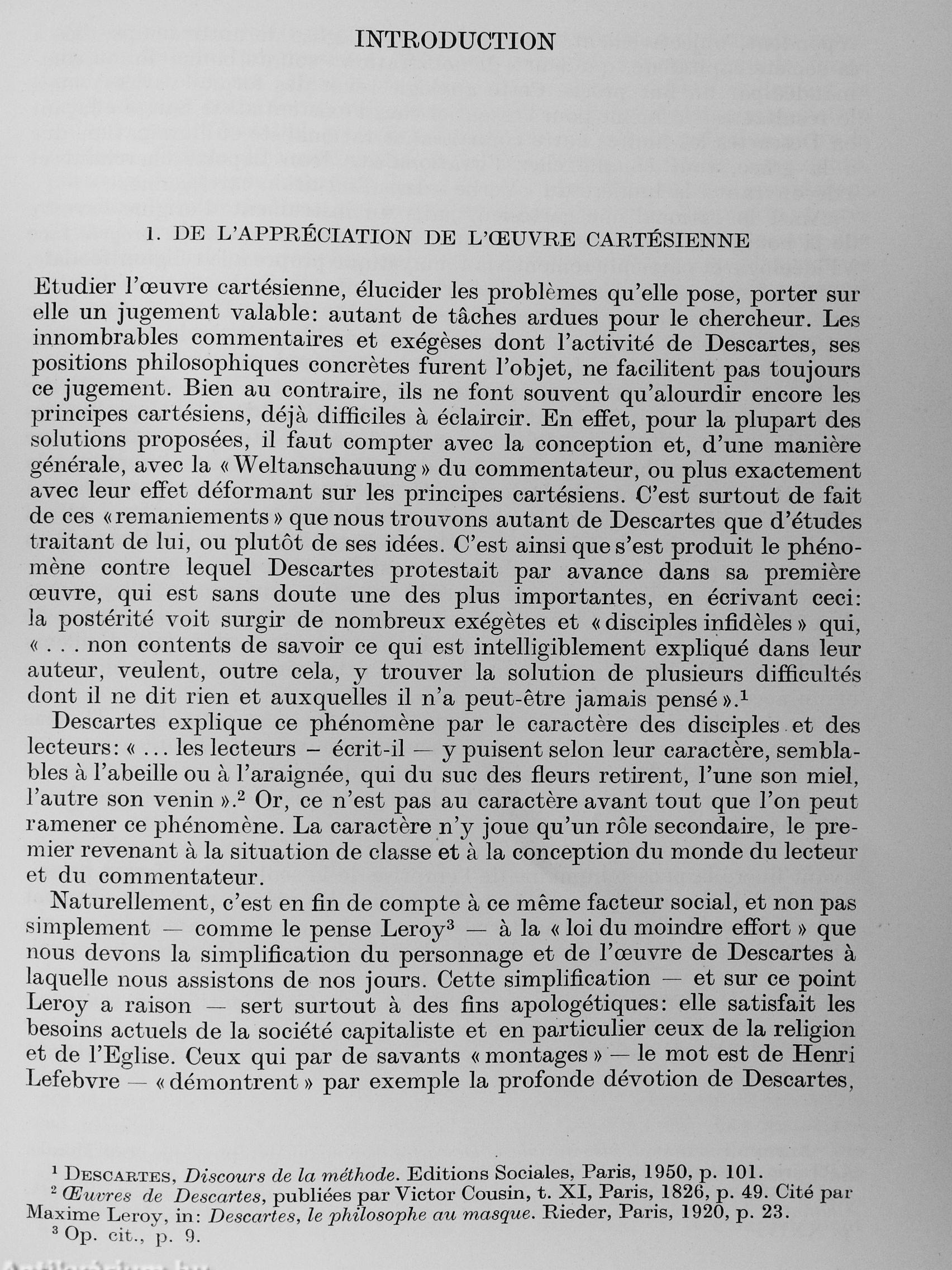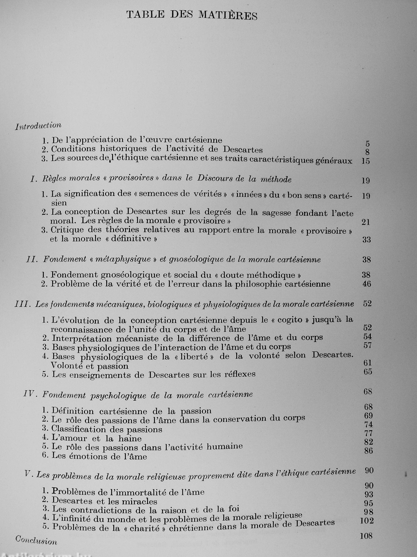 Dans cet ouvrage l'auteur traite des regles et des principes moraux développés dans la morale « provisoire » de Descartes. Il étudie également les problemes des deux étapes de la formation deses conceptions morales, « provisoire » et « définitive », en relevant particulierement corrélations de ces dernieres. Sqr la base de la théorie marxiste, il jette un jour nouveau sur la conception morale rationaliste du grand penseur français, en examinant non seulement les principes fon- ^ damentaux de celle-ci, mais aussi les rapports qui existent entre la morale de Descartes et l'ensemble de son systeme philosophique. notamment sa théorie de la connais-.sance, en outre .ses notions physiologico-biolo-giques et sa psychologie. Ainsi le lecteur pourra .se faire une idée de cette grandiose activité scientifique qui ~ bien que sous une forme idéaliste — a servi de base pour les pensées éthiques progressistes de...