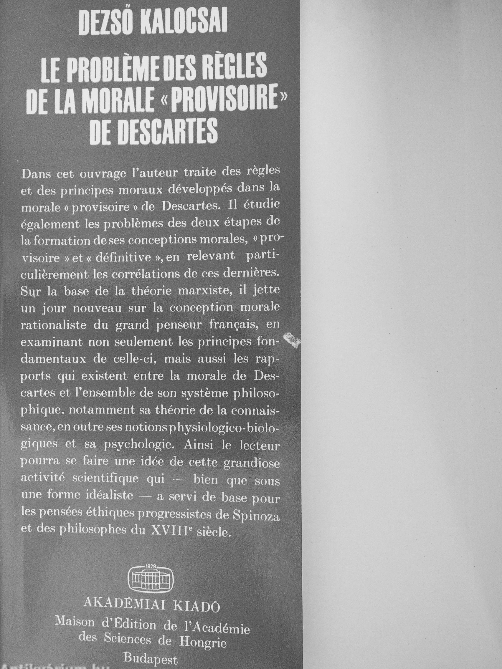 Dans cet ouvrage l'auteur traite des regles et des principes moraux développés dans la morale « provisoire » de Descartes. Il étudie également les problemes des deux étapes de la formation deses conceptions morales, « provisoire » et « définitive », en relevant particulierement corrélations de ces dernieres. Sqr la base de la théorie marxiste, il jette un jour nouveau sur la conception morale rationaliste du grand penseur français, en examinant non seulement les principes fon- ^ damentaux de celle-ci, mais aussi les rapports qui existent entre la morale de Descartes et l'ensemble de son systeme philosophique. notamment sa théorie de la connais-.sance, en outre .ses notions physiologico-biolo-giques et sa psychologie. Ainsi le lecteur pourra .se faire une idée de cette grandiose activité scientifique qui ~ bien que sous une forme idéaliste — a servi de base pour les pensées éthiques progressistes de Spinoza et des philo.sophes du XVIIP siecle.
