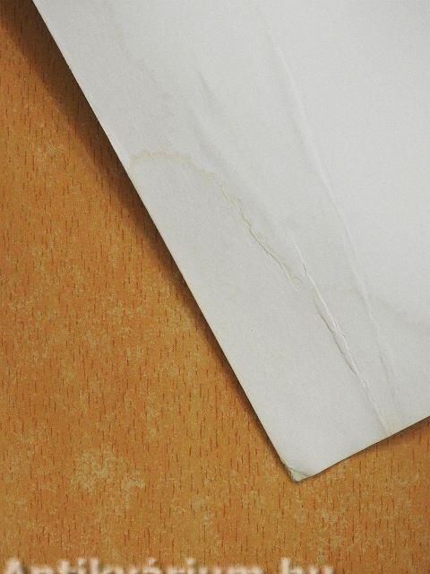 A borító töredezett, belső oldala nedvességtől hullámos, foltos. A gerinc megtört.